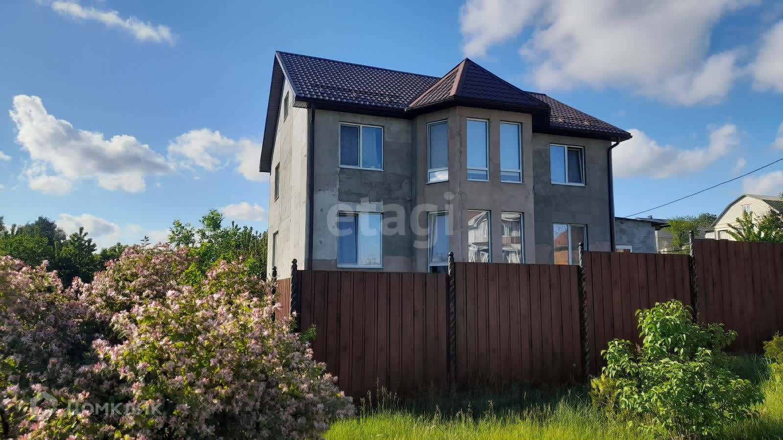 Конструктив дома: ленточный фундамент, стены из ГСБ 25 см, утеплен Пенопласт 5 см и черновая штукатурка. Фасад подготовлен под короед.