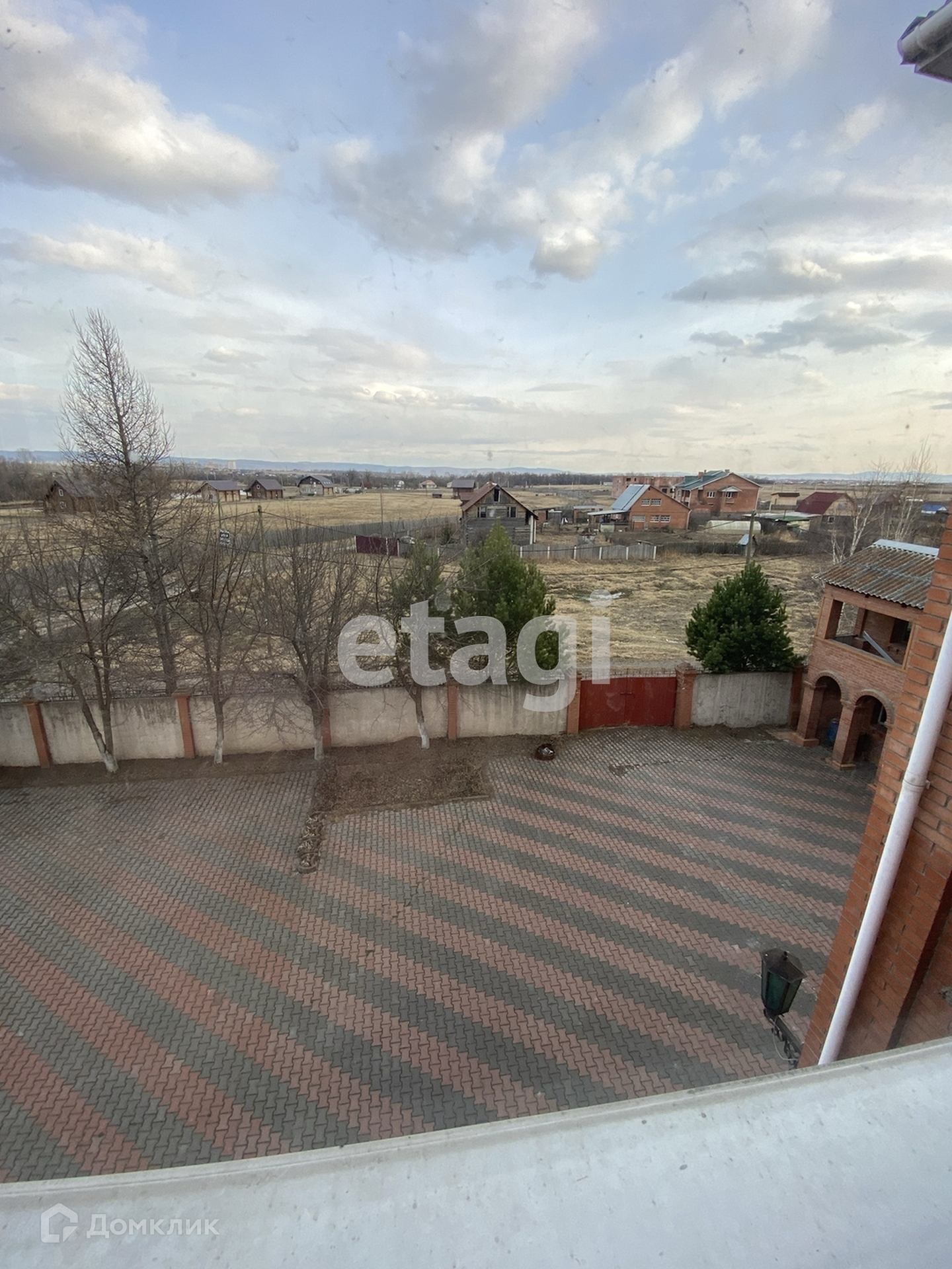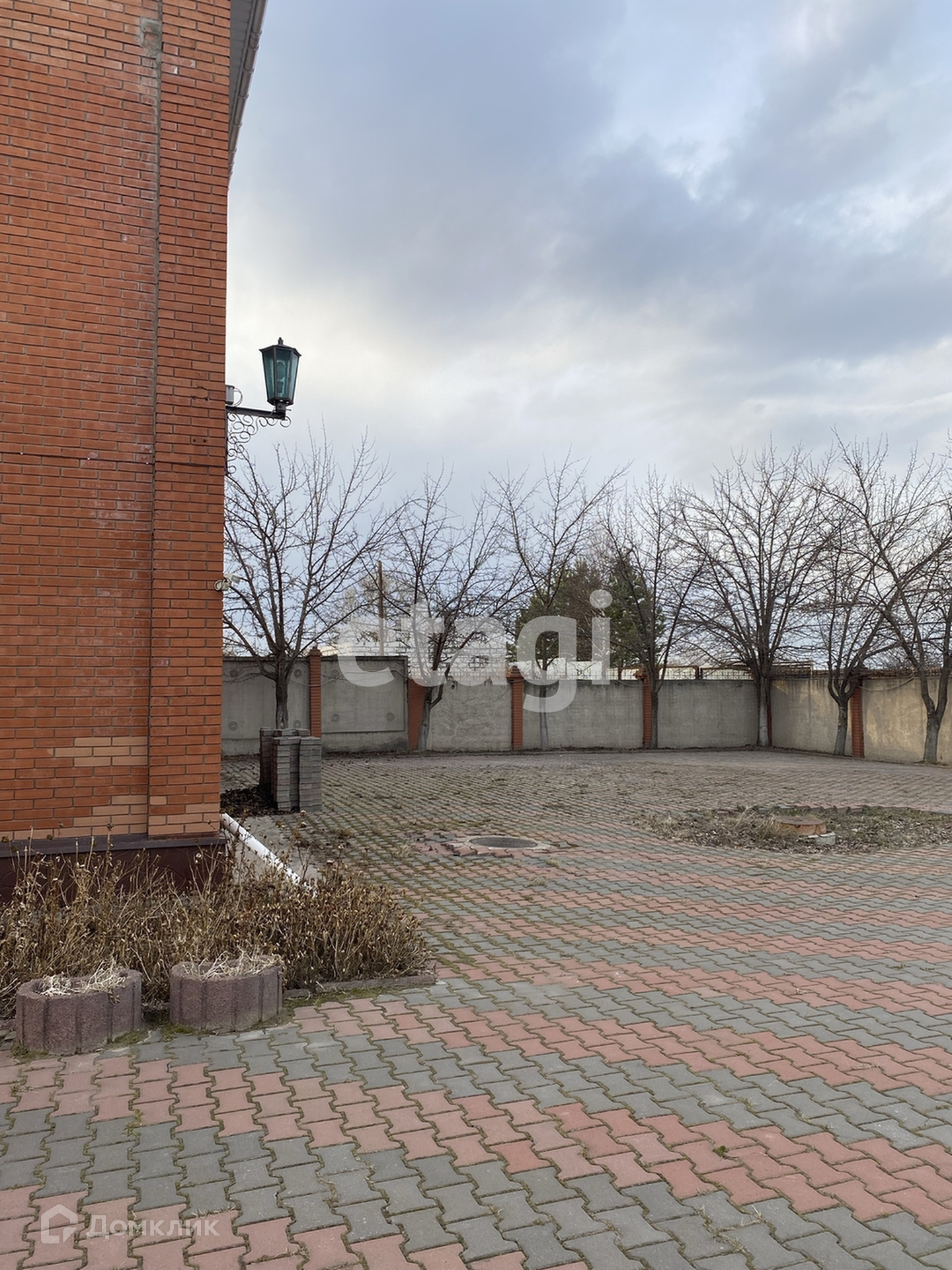 Двор покрыт брусчаткой (8 соток), бетонный забор.