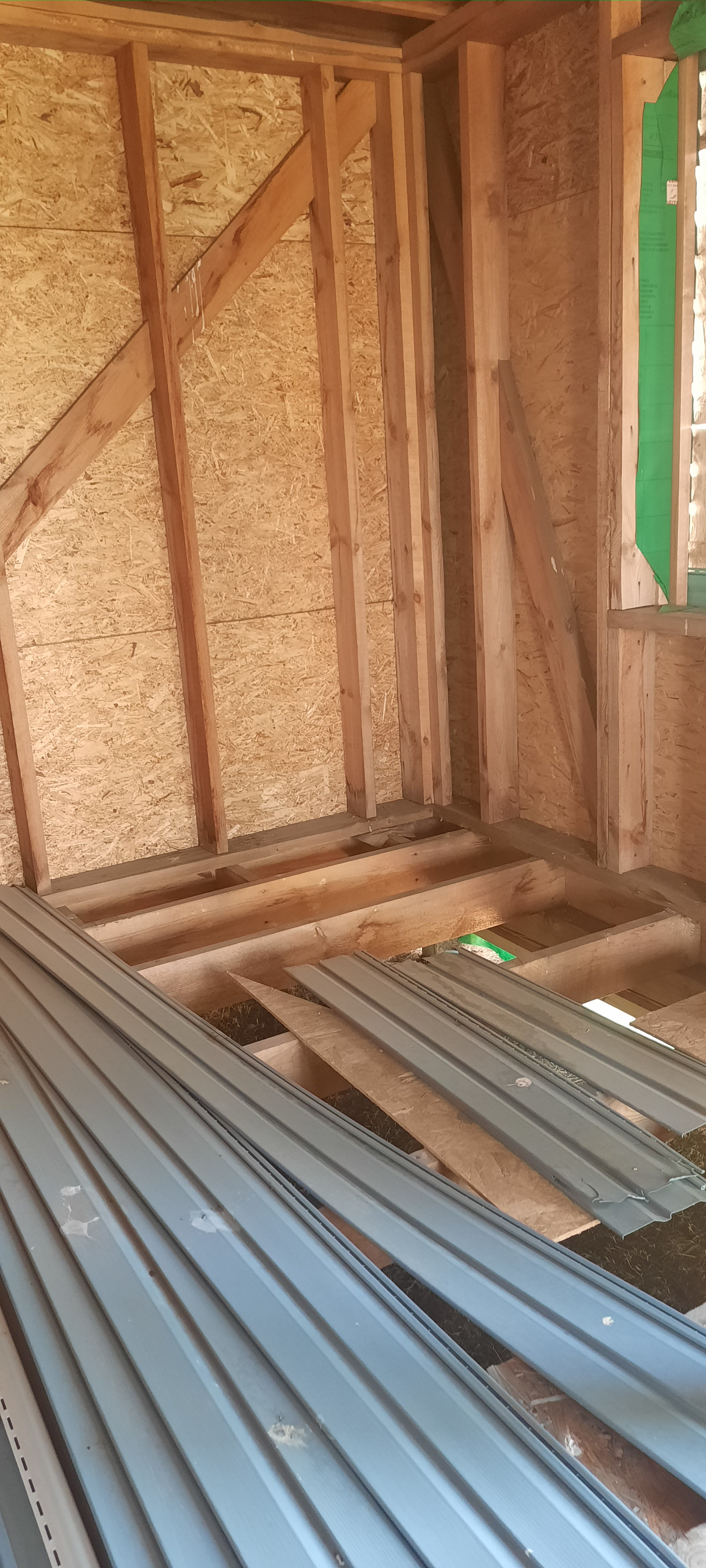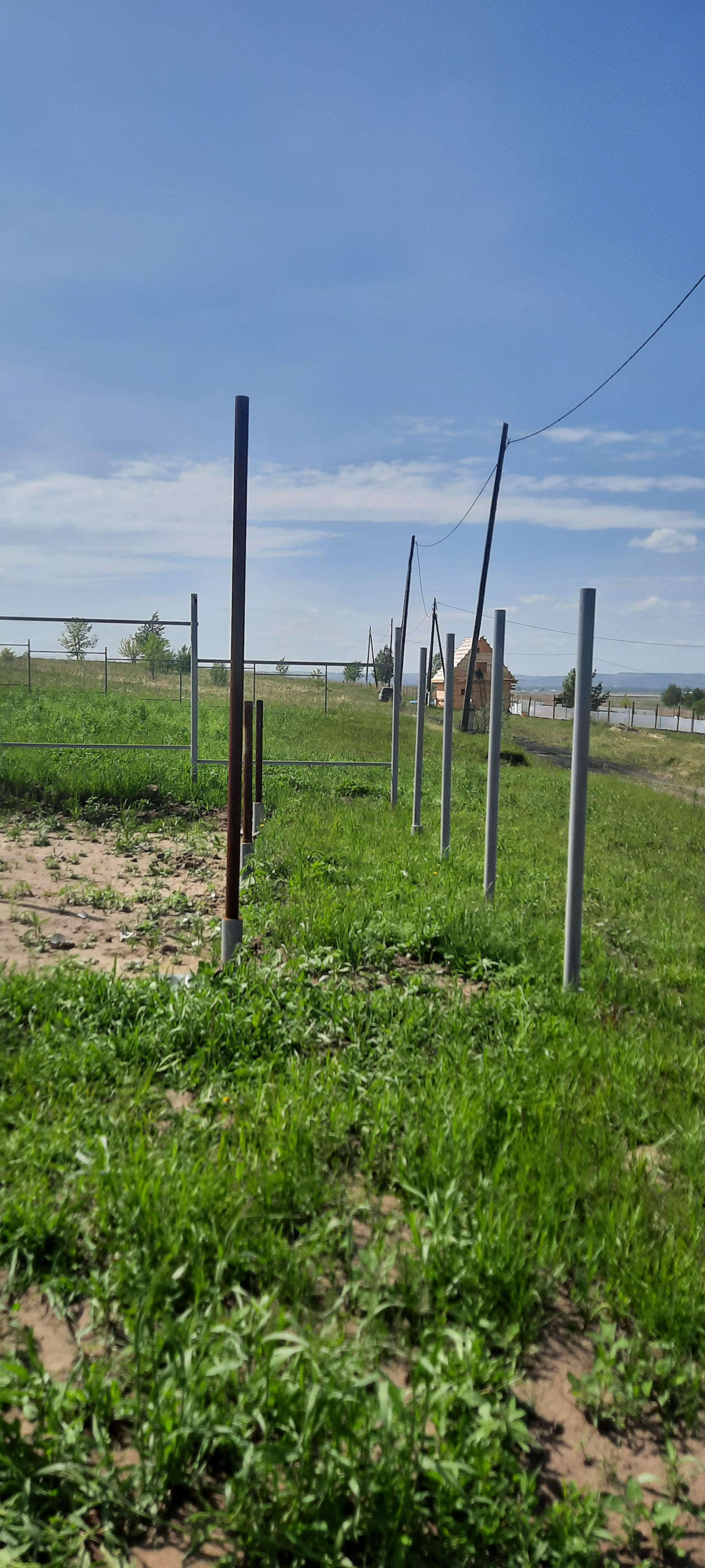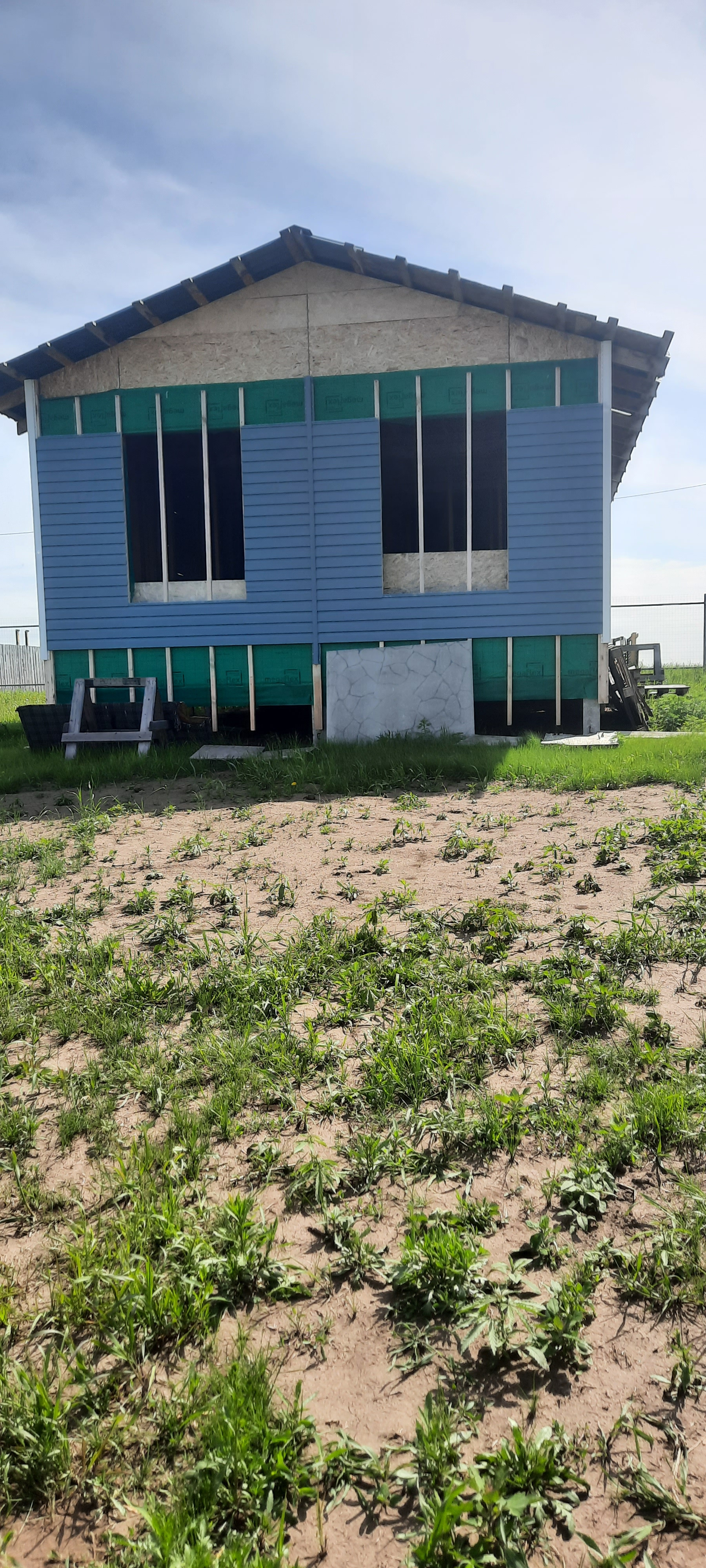 Дом стоит на бетонных сваях, есть часть отделочного материала, входная дверь. Все остается покупателю. Вбиты для навеса  сваи на площади 6х6м. Стоят столбы по периметру для забора.