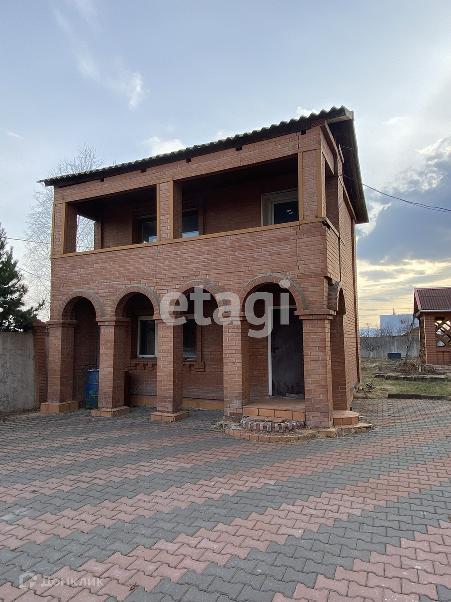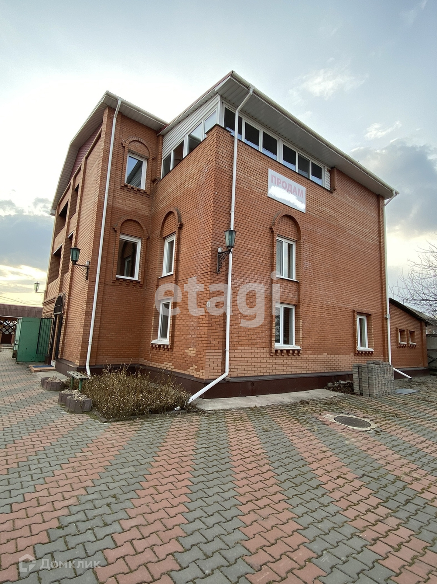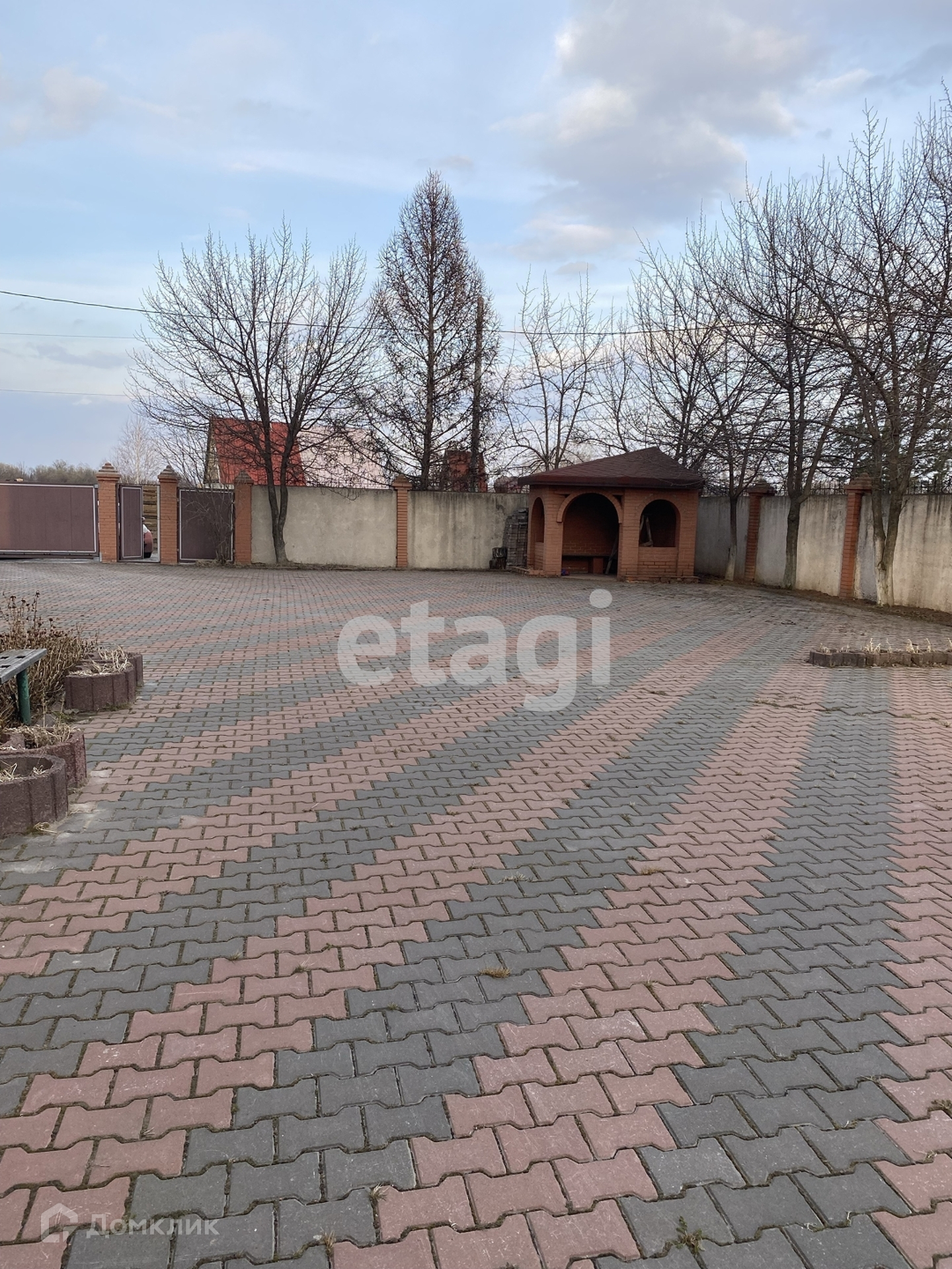 Двор покрыт брусчаткой (8 соток), бетонный забор.