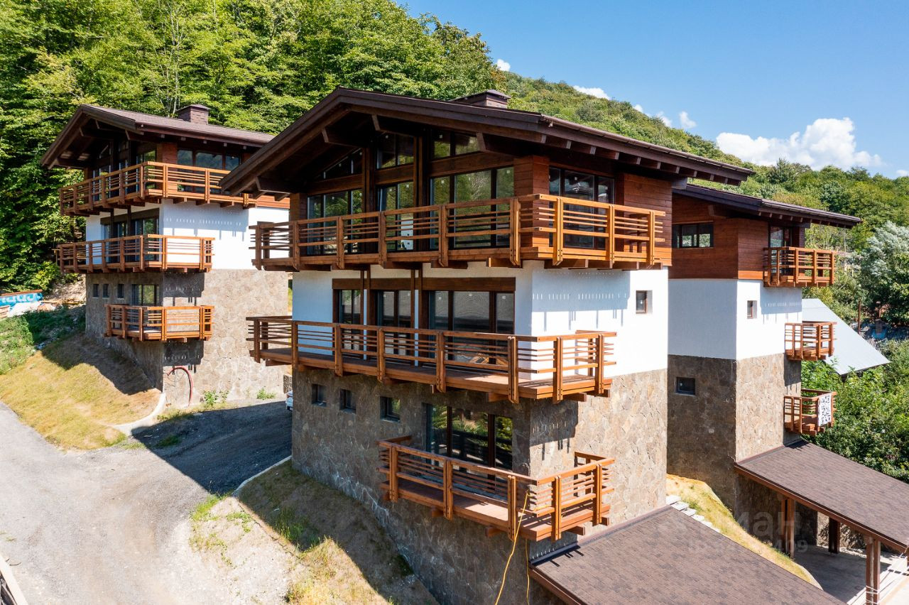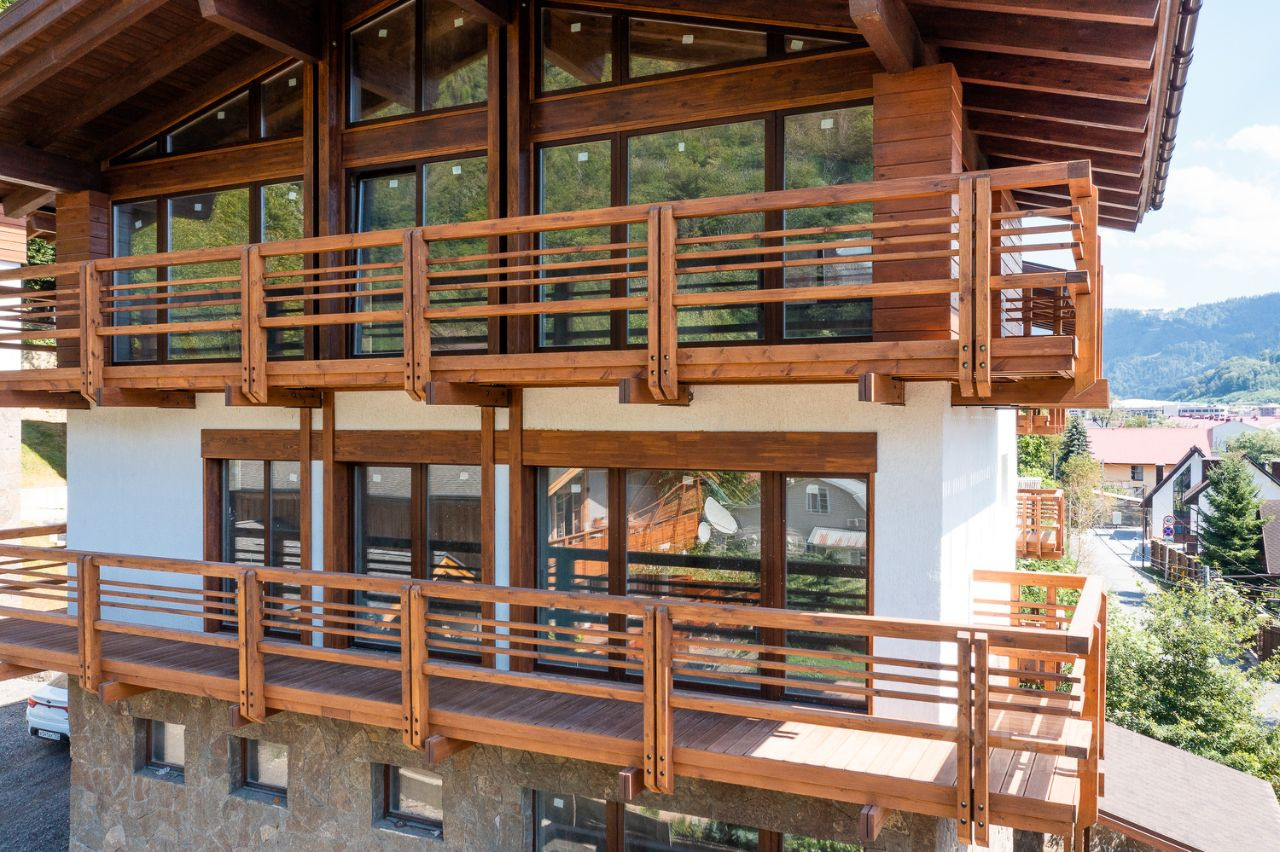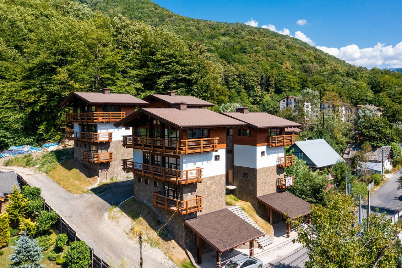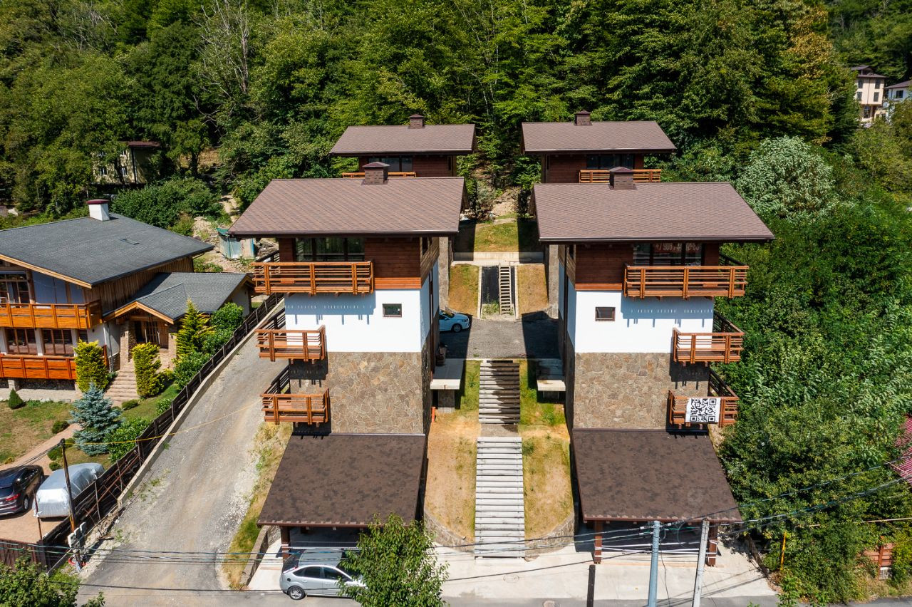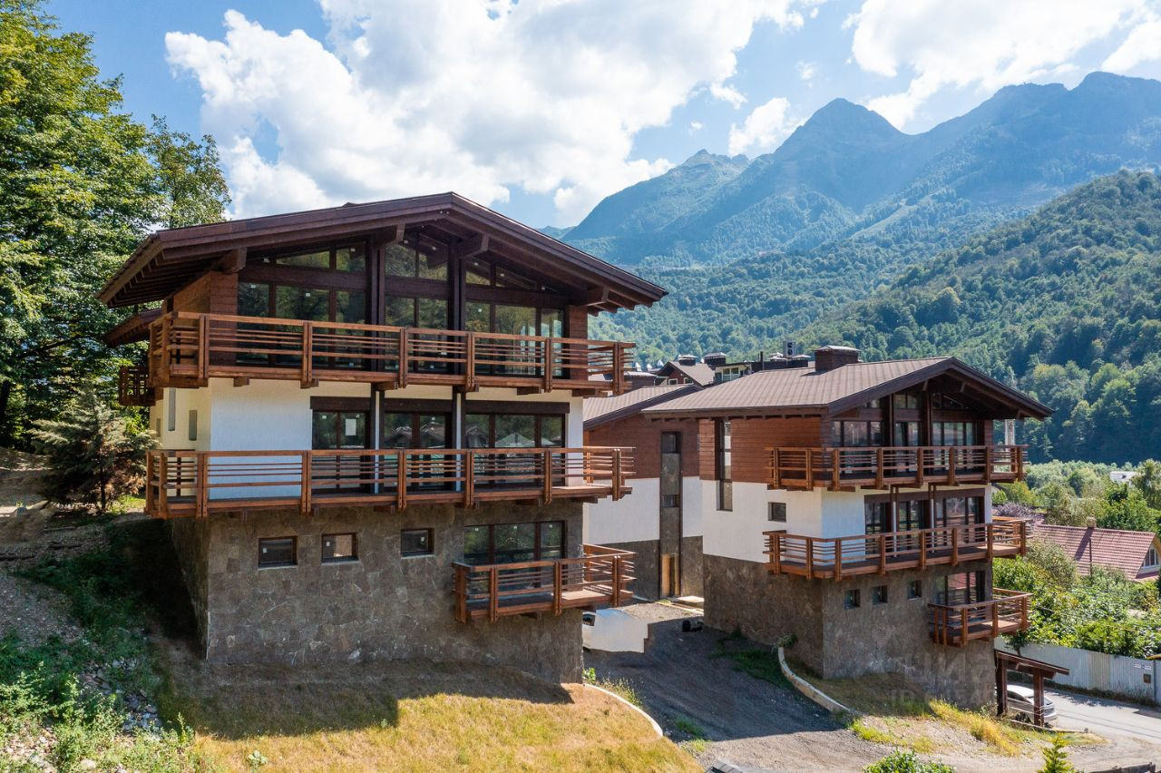 Классический дом-шале с отдельными земельным участком и шикарным видом на горы расположен вдоль самой границы поселка с Национальным парком, что гарантирует отсутствие соседей сверху. Архитектурный облик и ландшафт поселка полностью соответствует европейскому стилю "шале".