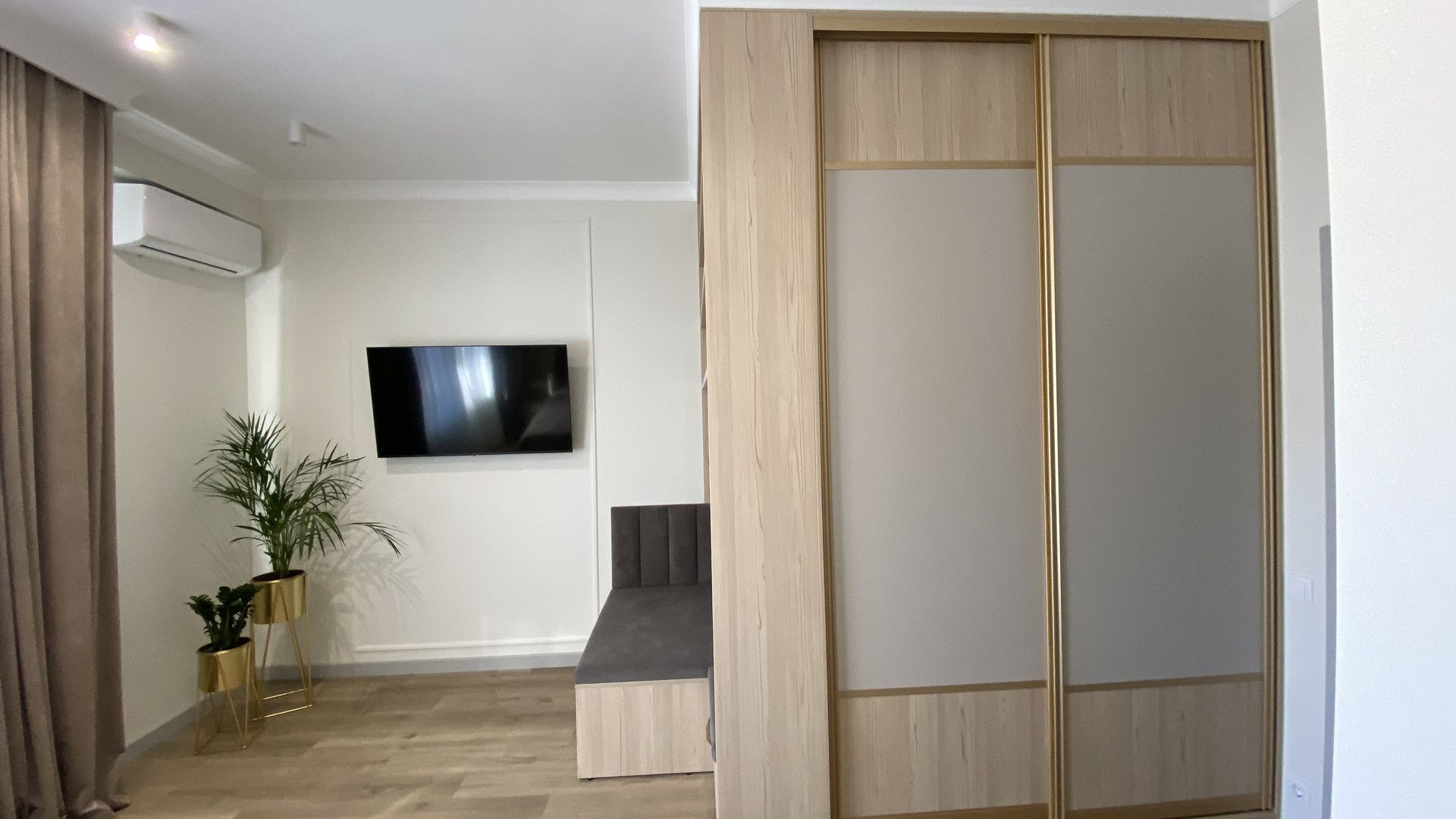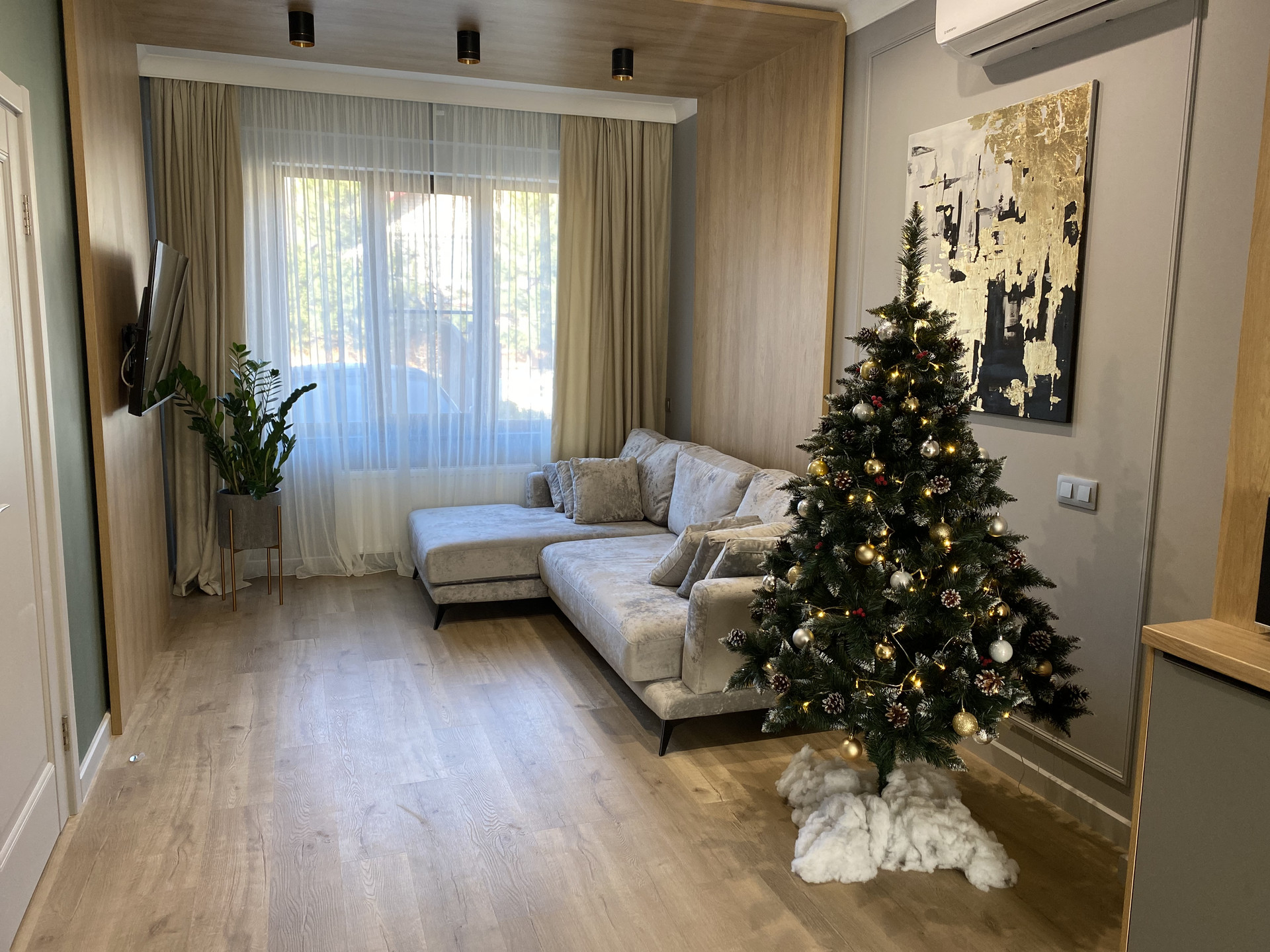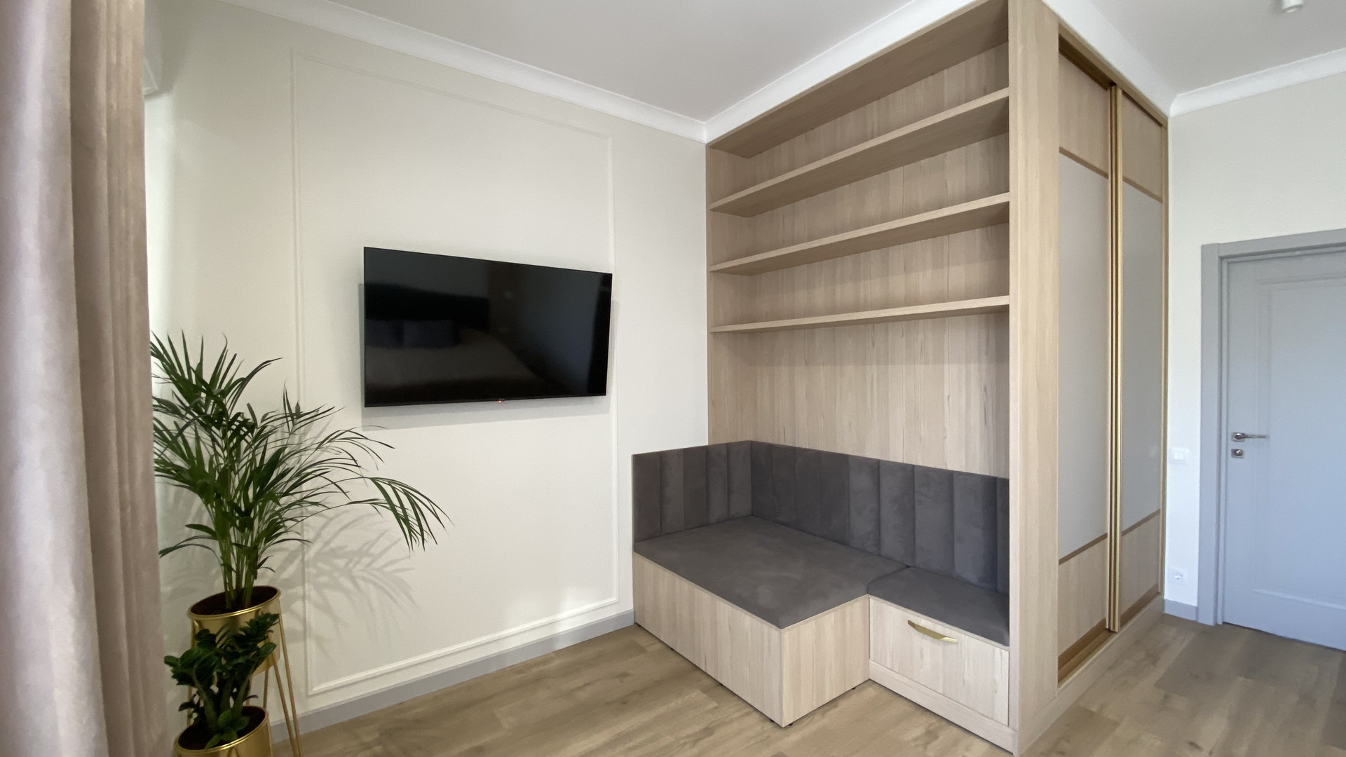 - уютная светлая гостиная с TV-зоной и диваном;