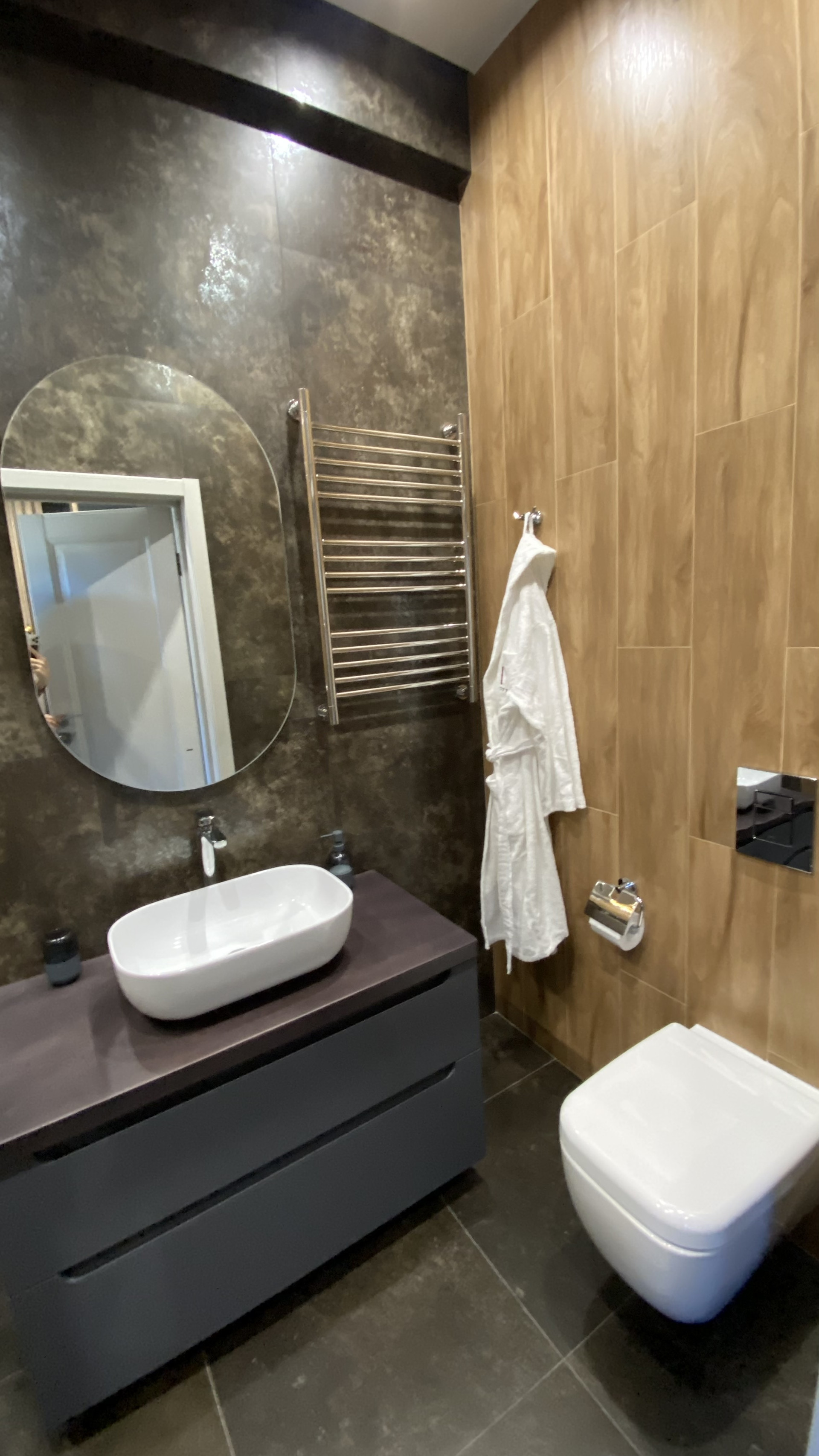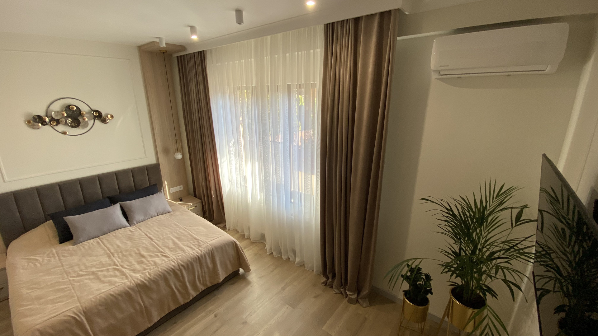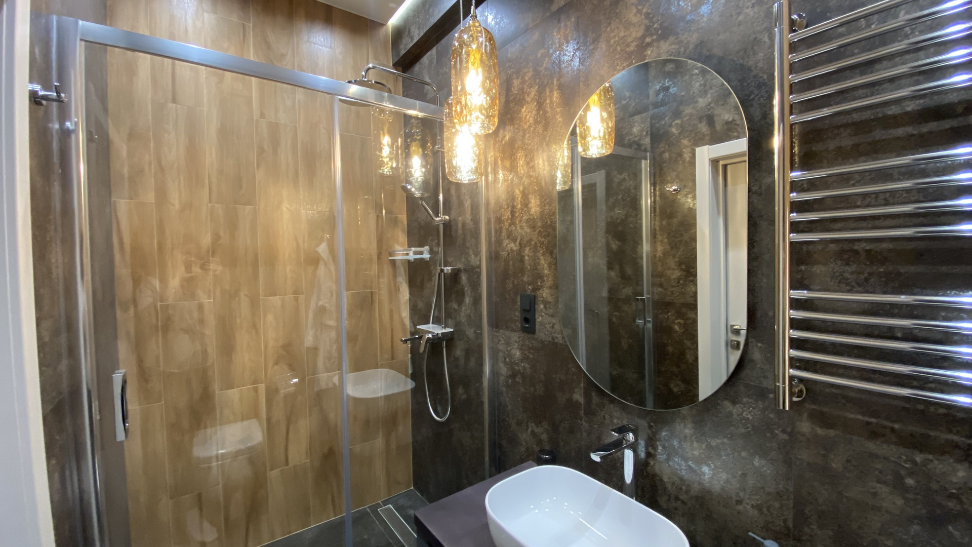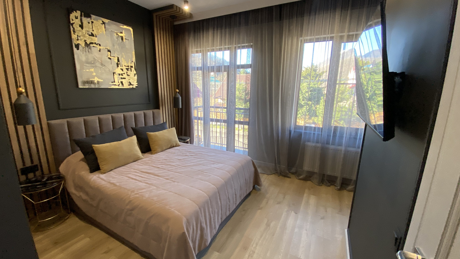 - темная мастер-спальня с душевой кабиной и выходом на балкон с видом на Marriott отель + оборудованное рабочее место с видом на горы;