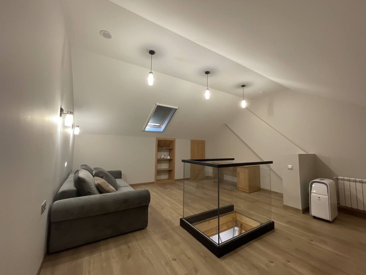 В таунхаусе имеется 3-ий мансардный этаж с полноценными высокими потолками. Там находится раскладывающийся диван на 2 спальных места и рабочее место, а также вместительные зоны хранения.