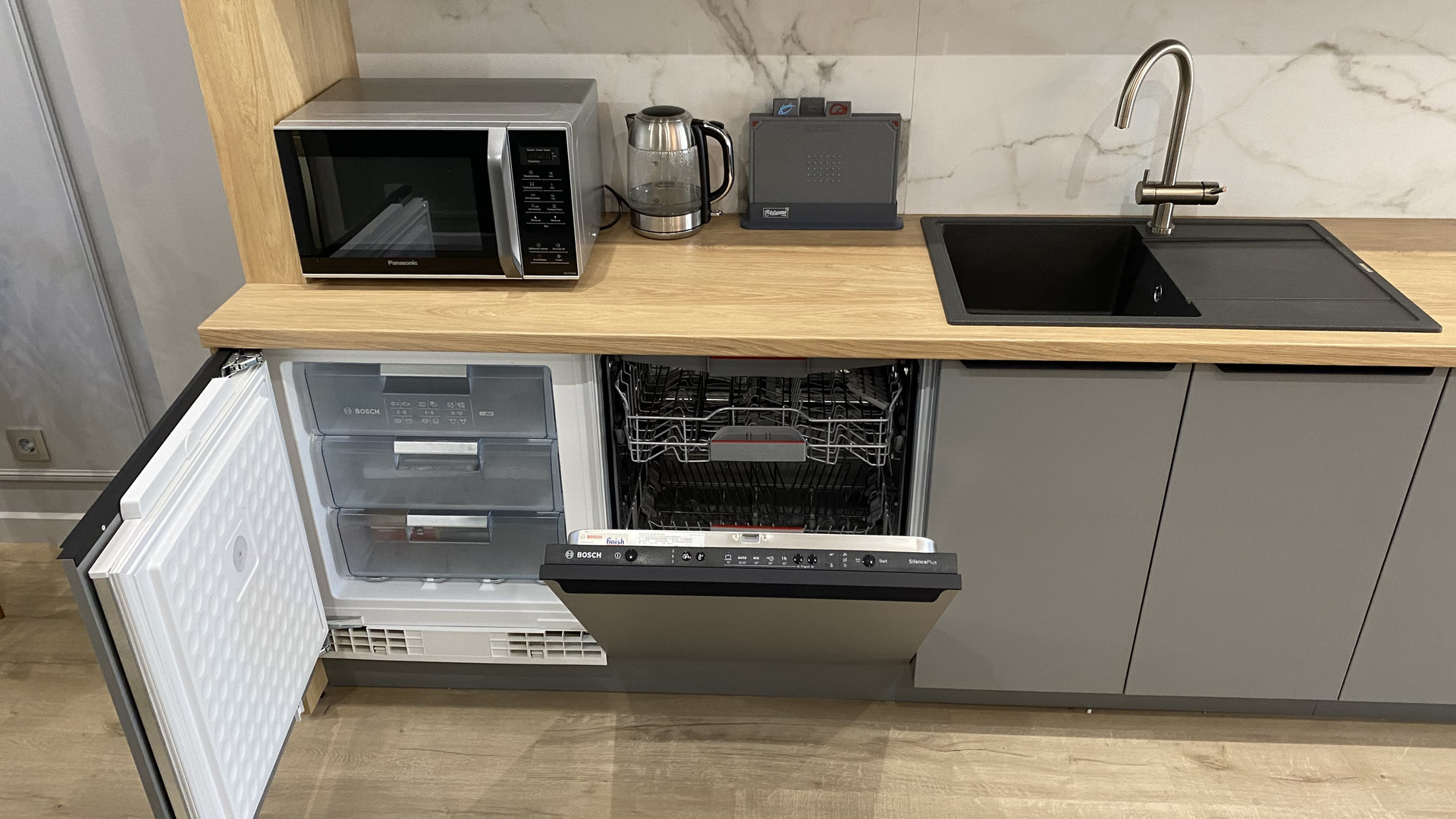 - оборудованная кухня со всей бытовой техникой и приборами (включая посудомоечную машину, холодильник, отдельную морозильную камеру, электроплиту, духовой шкаф и микроволновку);