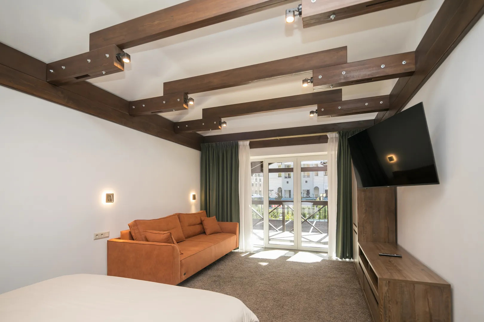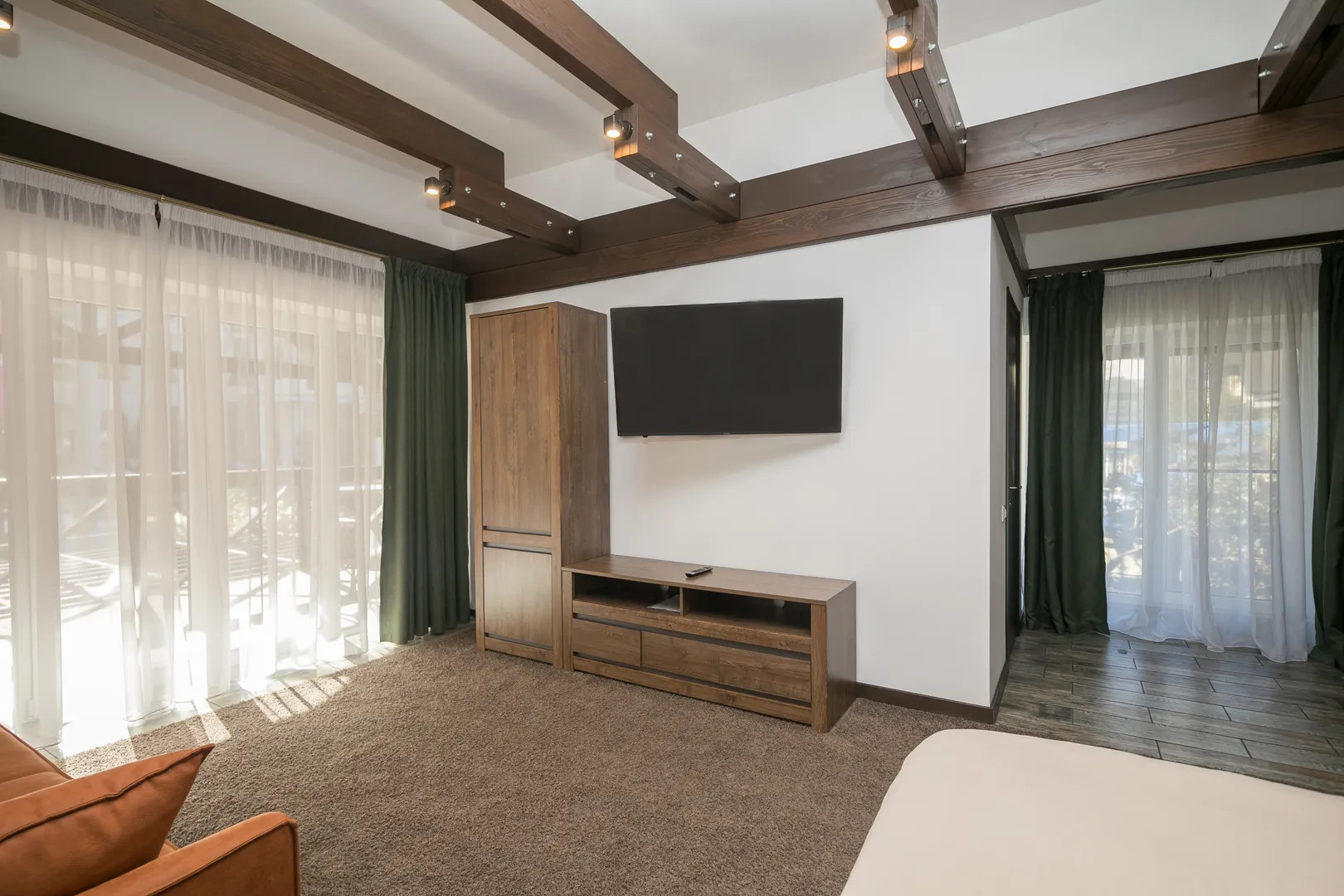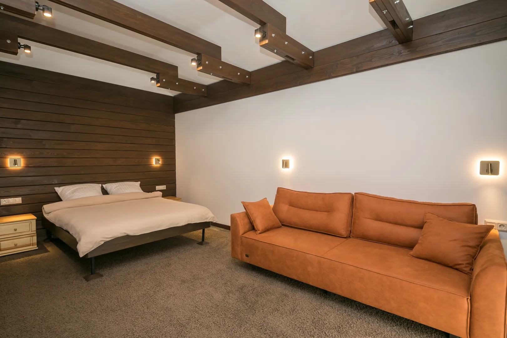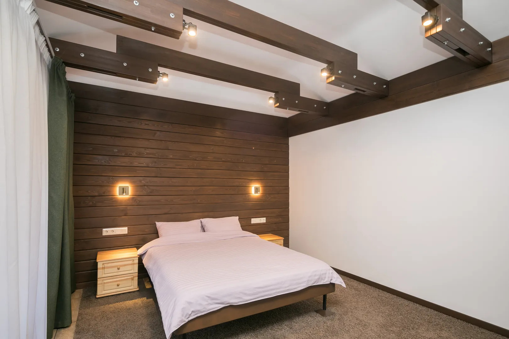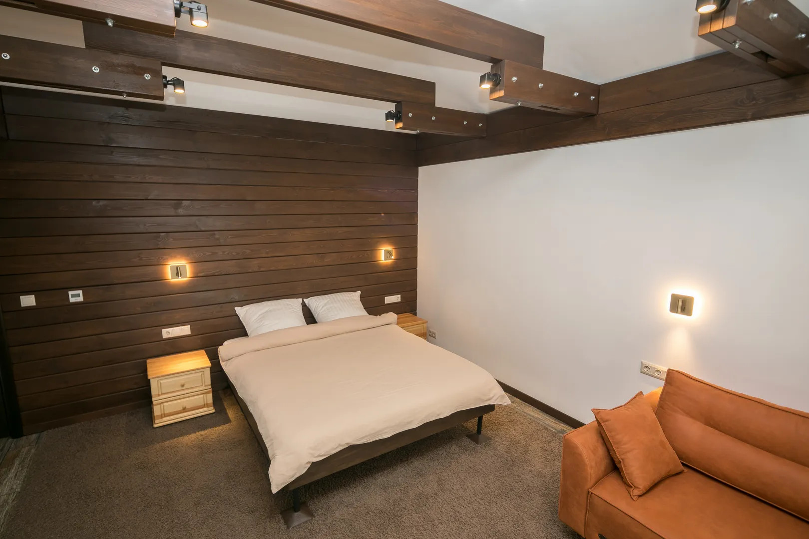 2 спальни с двуспальным кроватями, 1 спальня с двуспальной кроватью и диваном.
