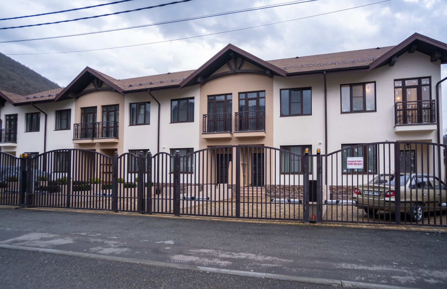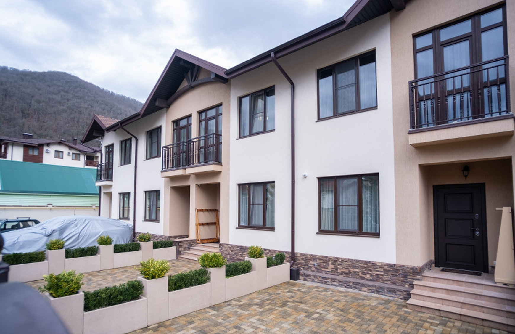 Все коммуникации центральные. Отопление автономное от собственной газовой котельной. Комплекс имеет закрытую территорию с зоной парковки и зоной отдыха с барбекю на заднем дворе. Ведется круглосуточное видеонаблюдение и установлены автоматические ворота. 1й этаж кухня-гостиная, 2й этаж - 2 мастер спальни, французский балкон, из каждого окна прекрасный вид на горы. Полностью укомплектована, подходит как для постоянного проживания так и для сдачи в аренду.