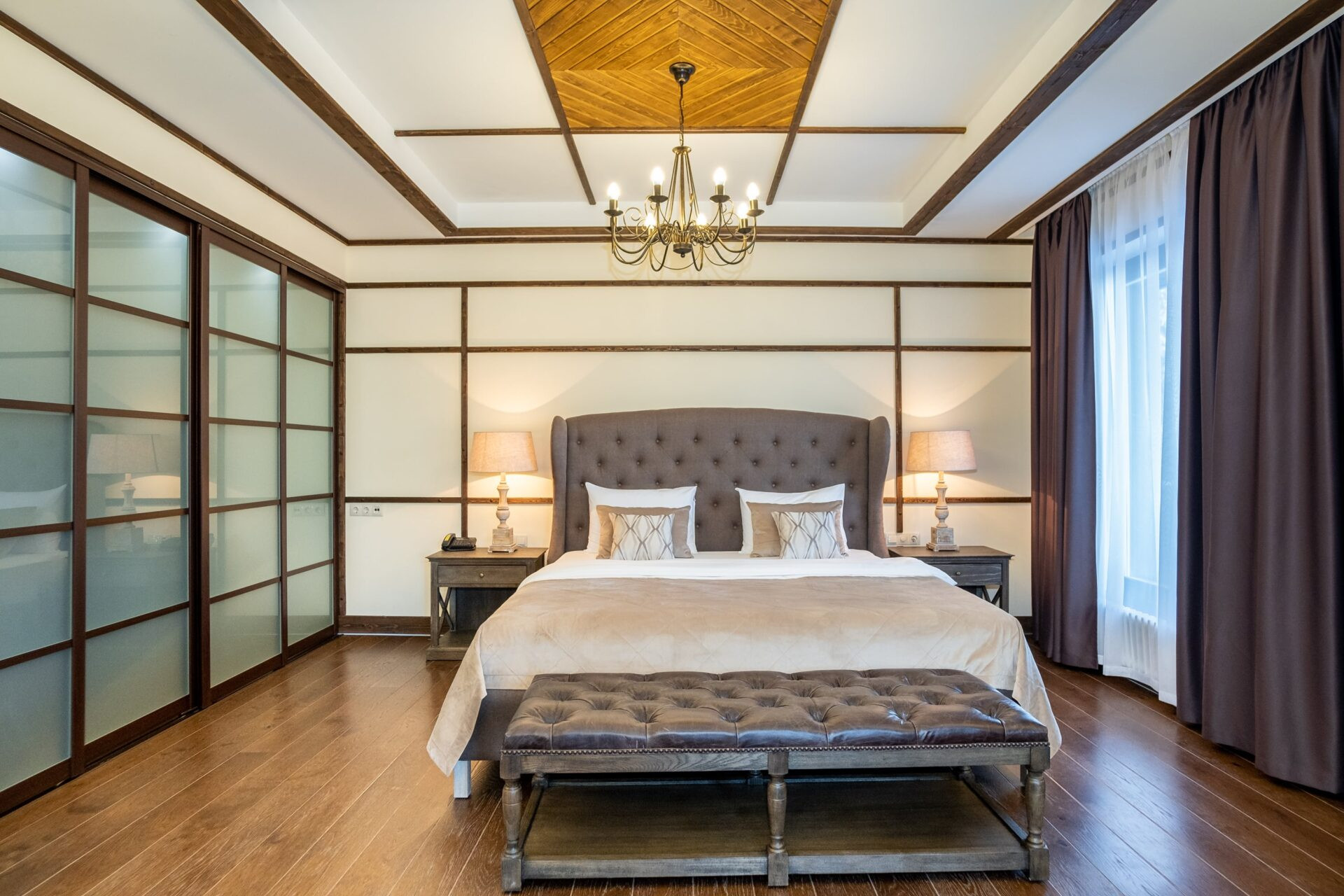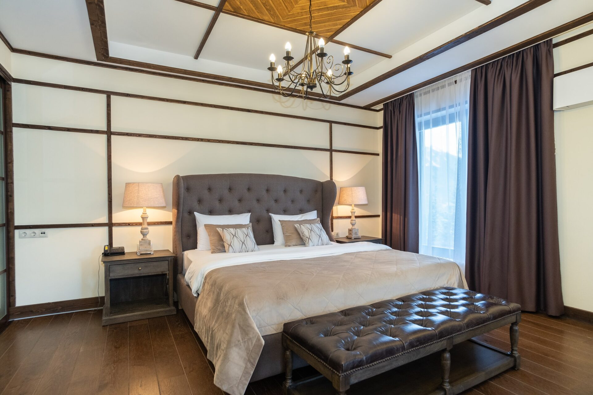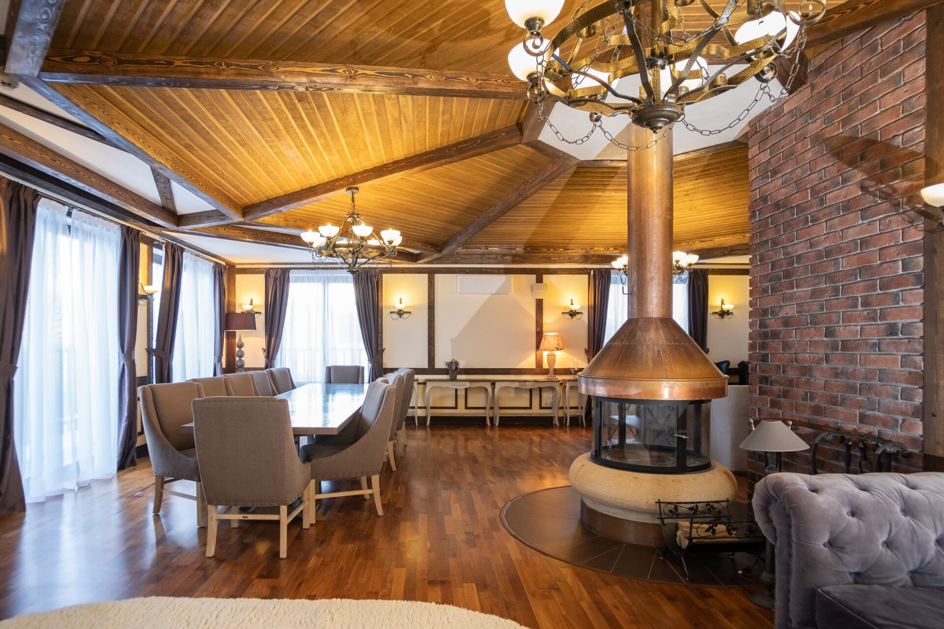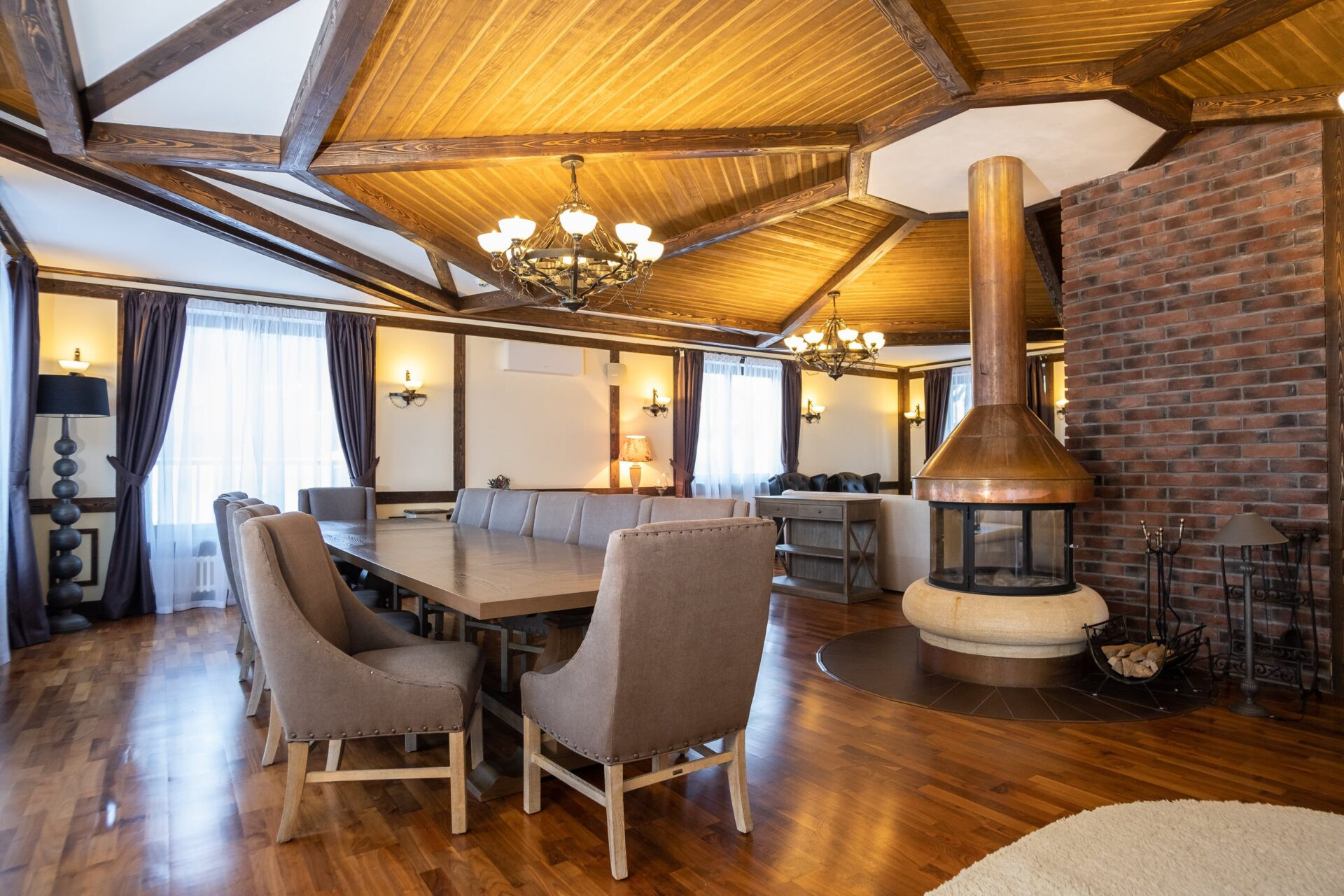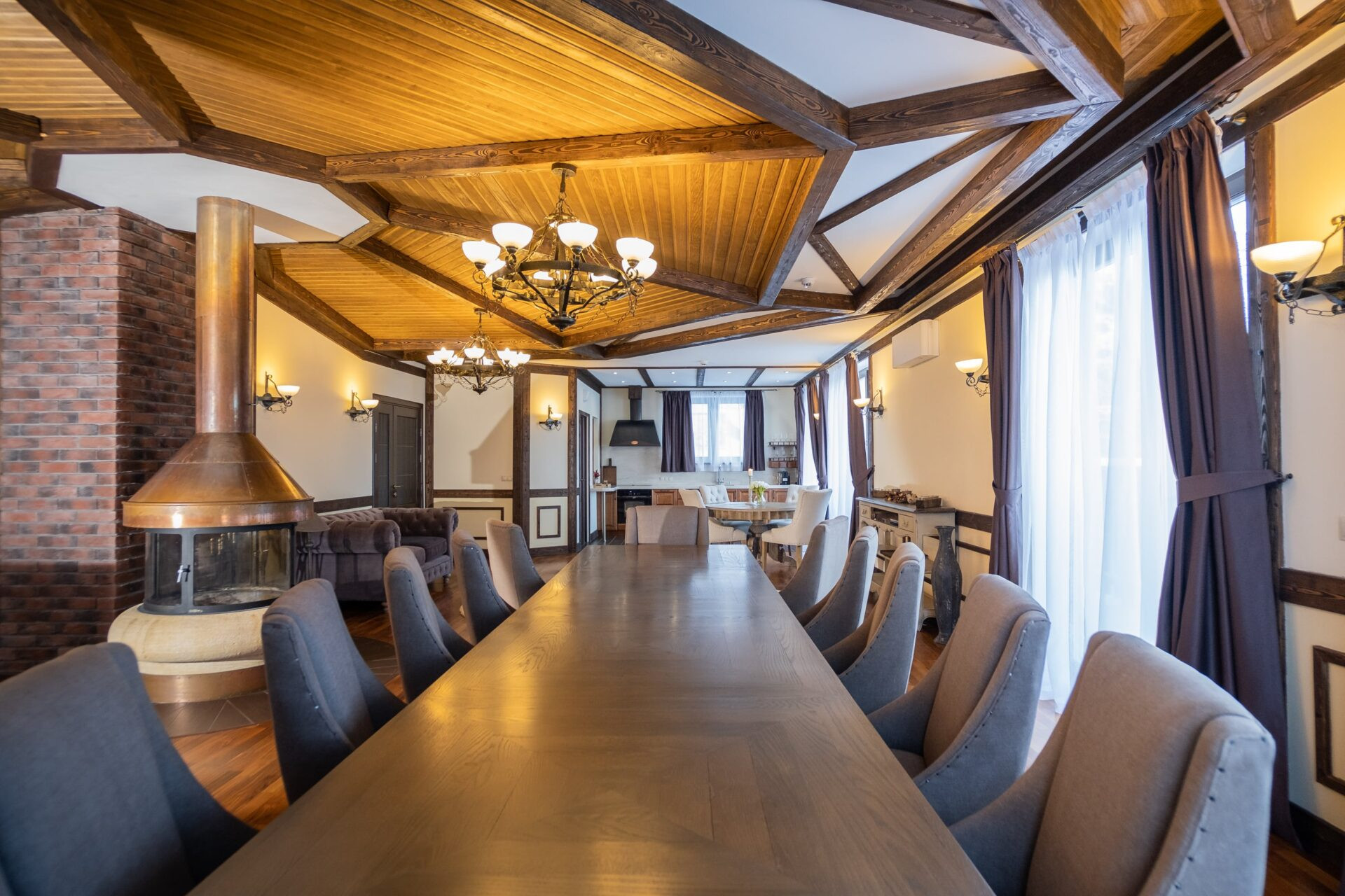 Дом спланирован в 5 выделенных спален с санузлами и гардеробными, большую кухню с зоной столовой, гостиную с камином и зоной отдыха, постирочная, комната для персонала, баня, хамам.