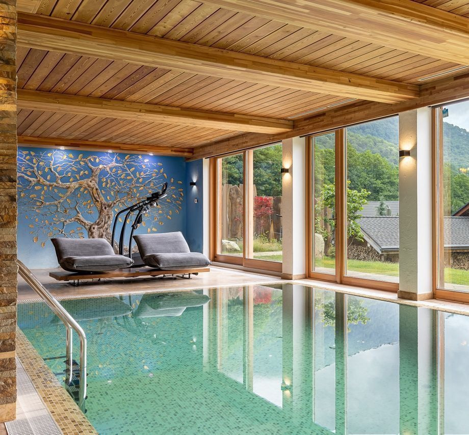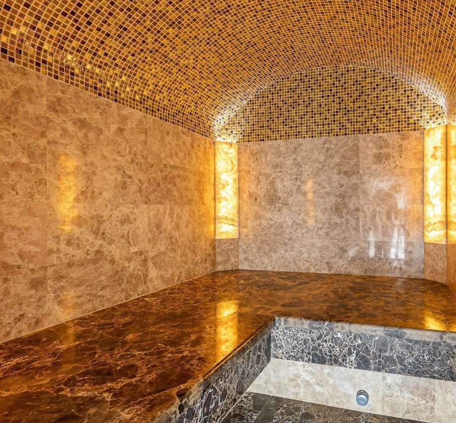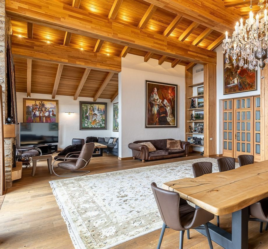 На первом этаже каминный зал, гостиная с зоной кухни, спальная комната для гостей. На втором уровне дома располагается 3 спальных комнаты с индивидуальными санузлами. Всего 3 камина, есть собственный винный погреб с системой климат контроля. В цокольном первом этаже расположены банный комплекс, бассейн, хамам, сауна, бильярдная.
