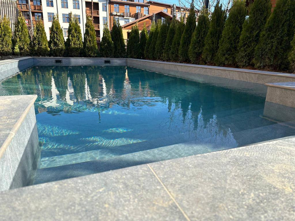 Открытый бассейн 4 х 8 м с подогревом и противотоком. Отличная локация, развитая инфраструктура.