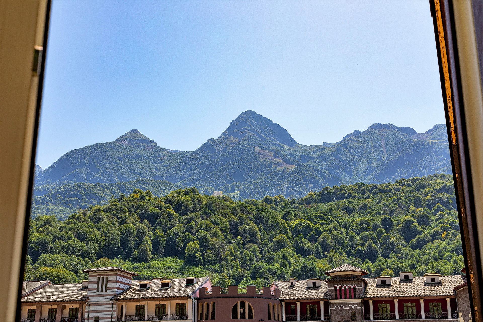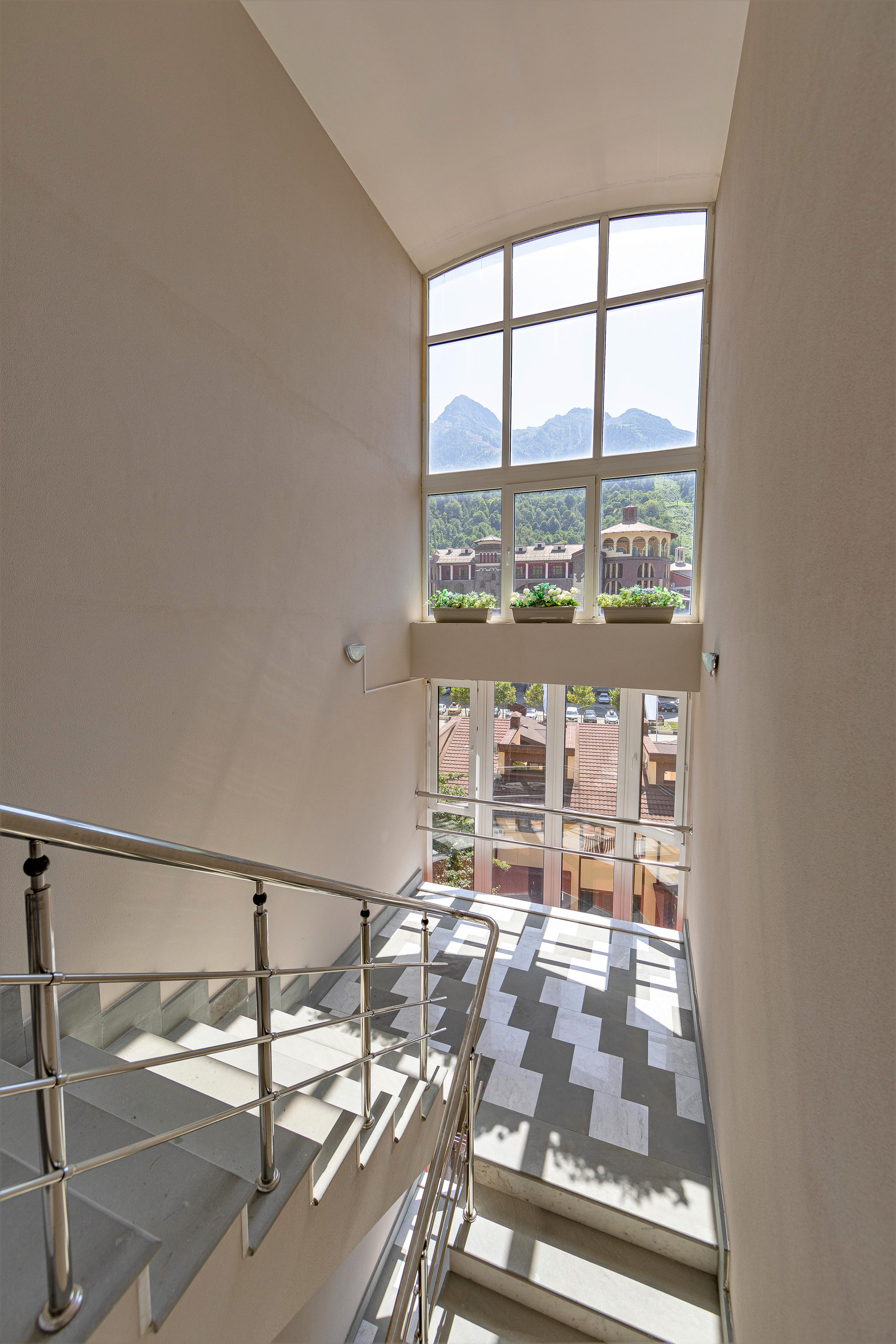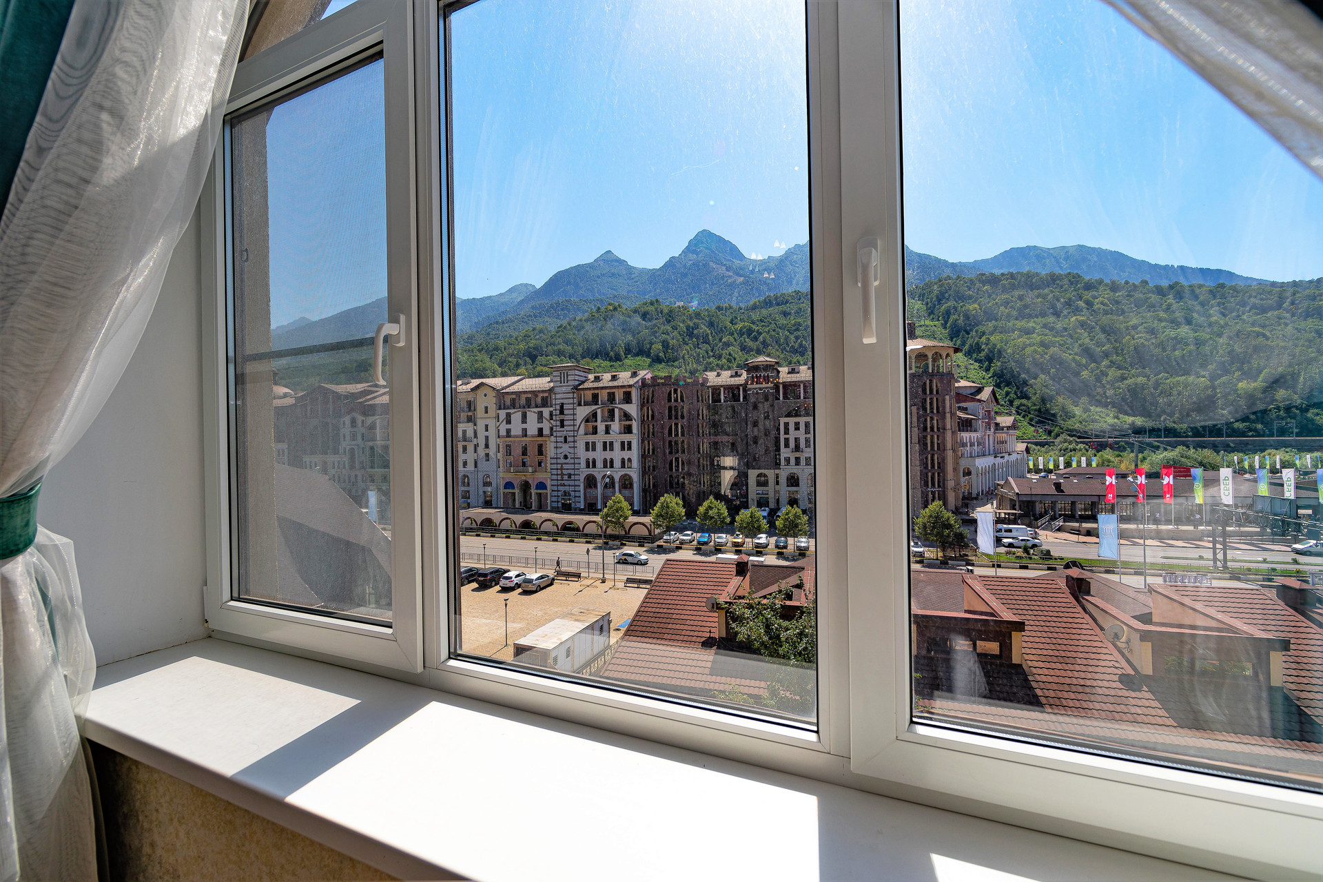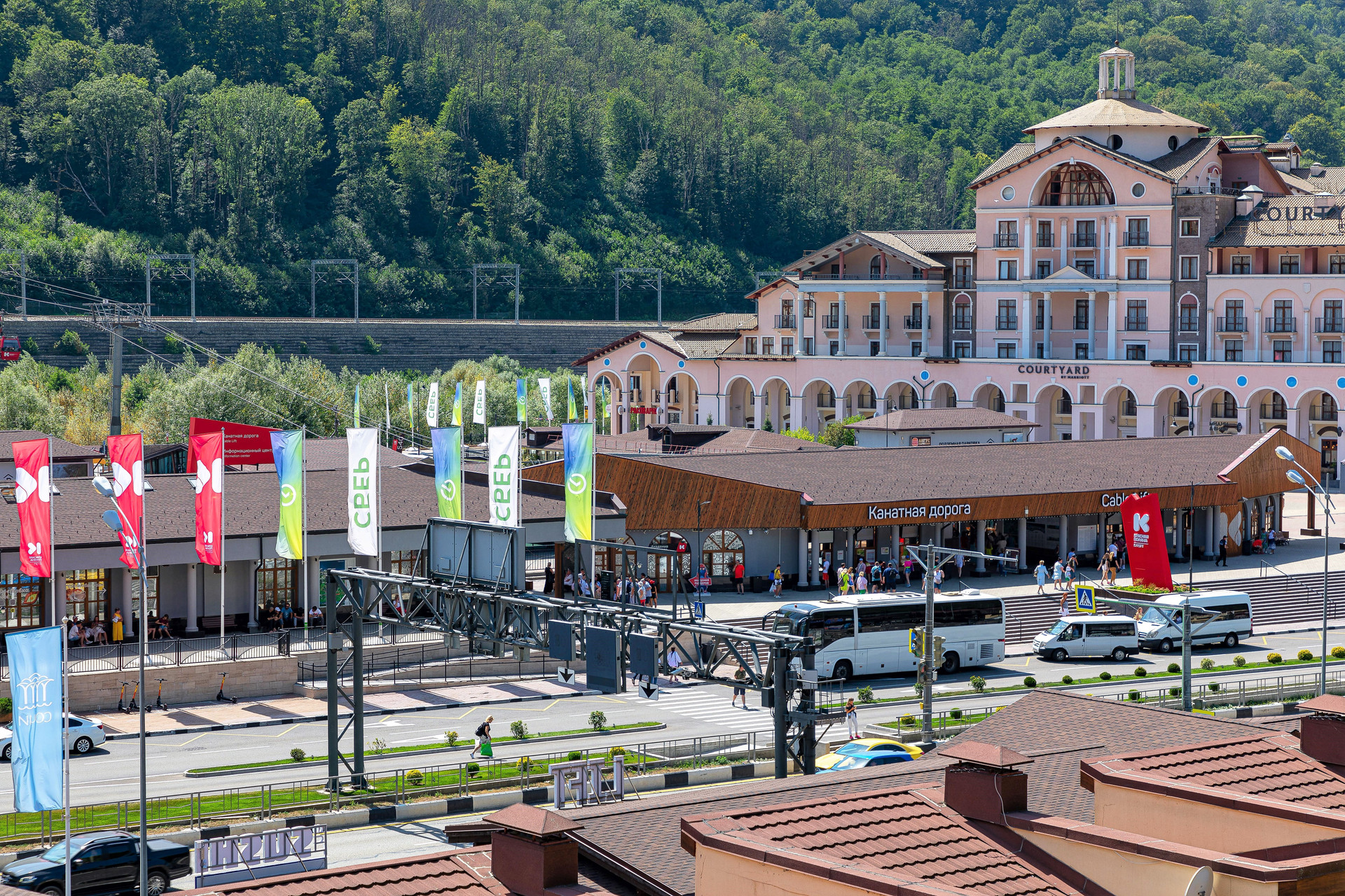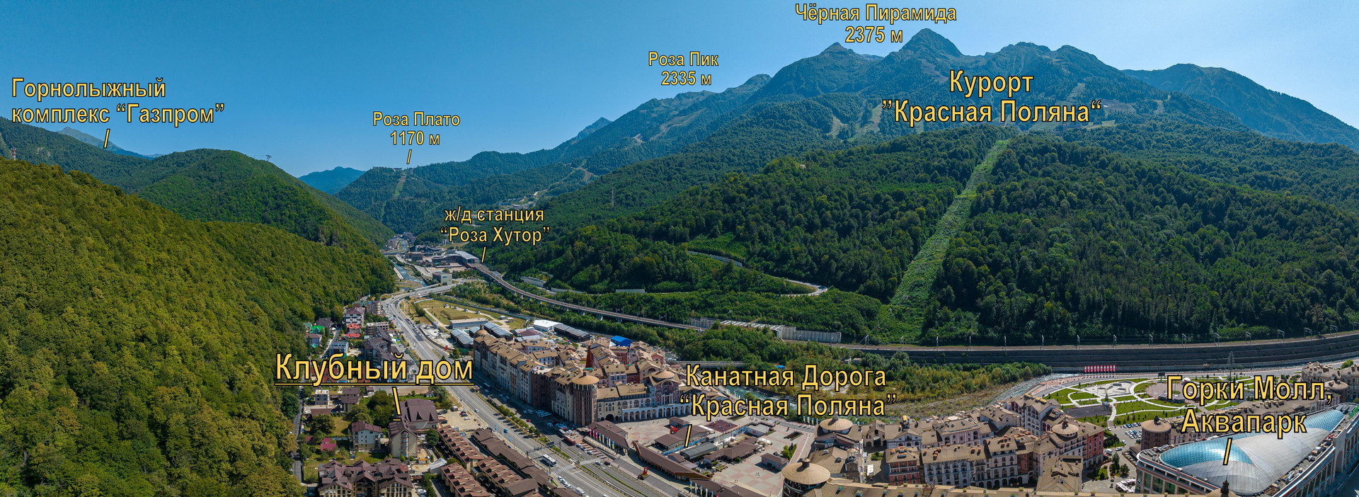 Рельеф ровный, удобно прогуливаться на соседние курорты Газпром и Роза-Хутор, на каждом шагу рестораны, кафе и развлечения на любой вкус и кошелёк. Общая протяжённость набережных реки Мзымта - 4,5 км.