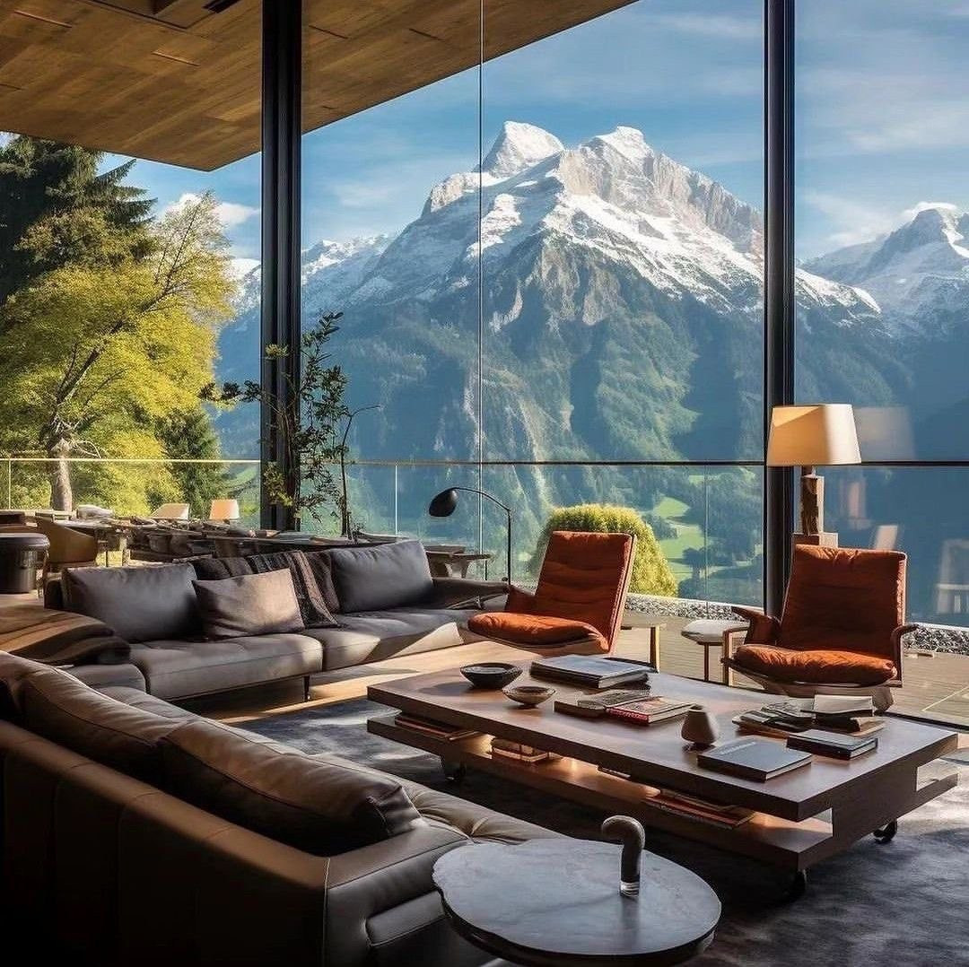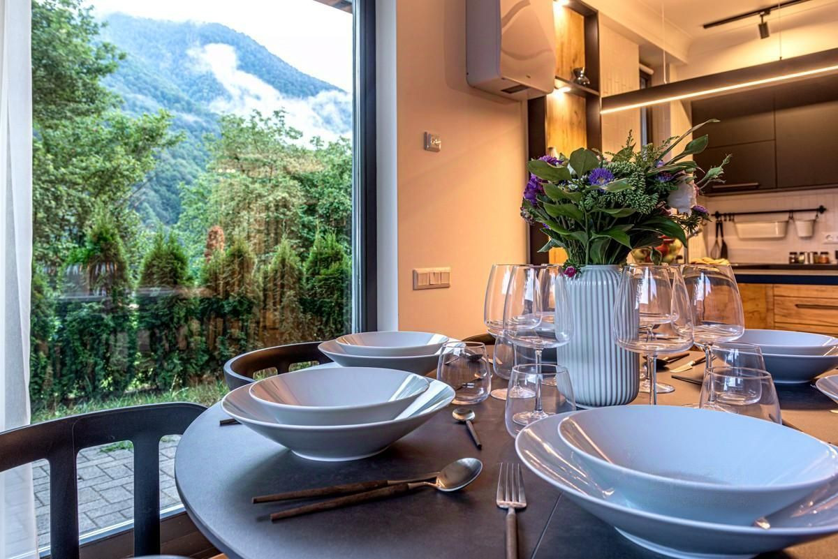 Благодаря большим витражным окнам из апартаментов открывается потрясающий вид на горы.