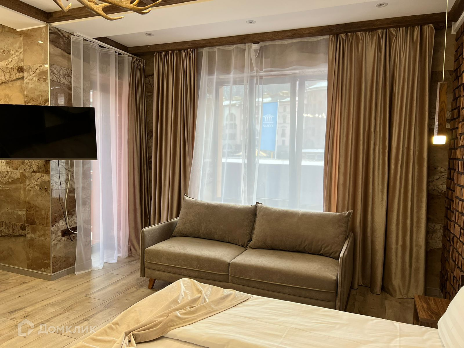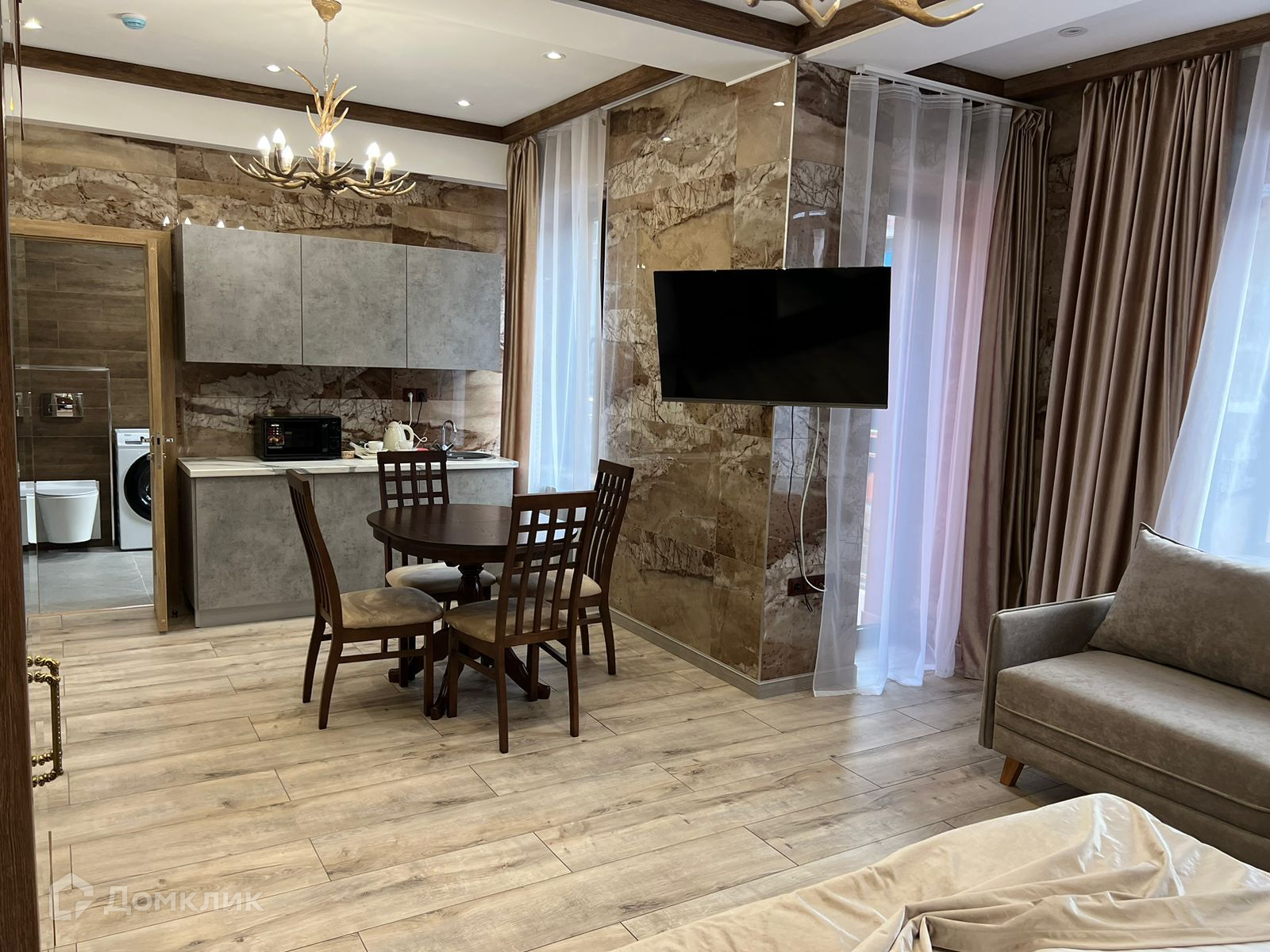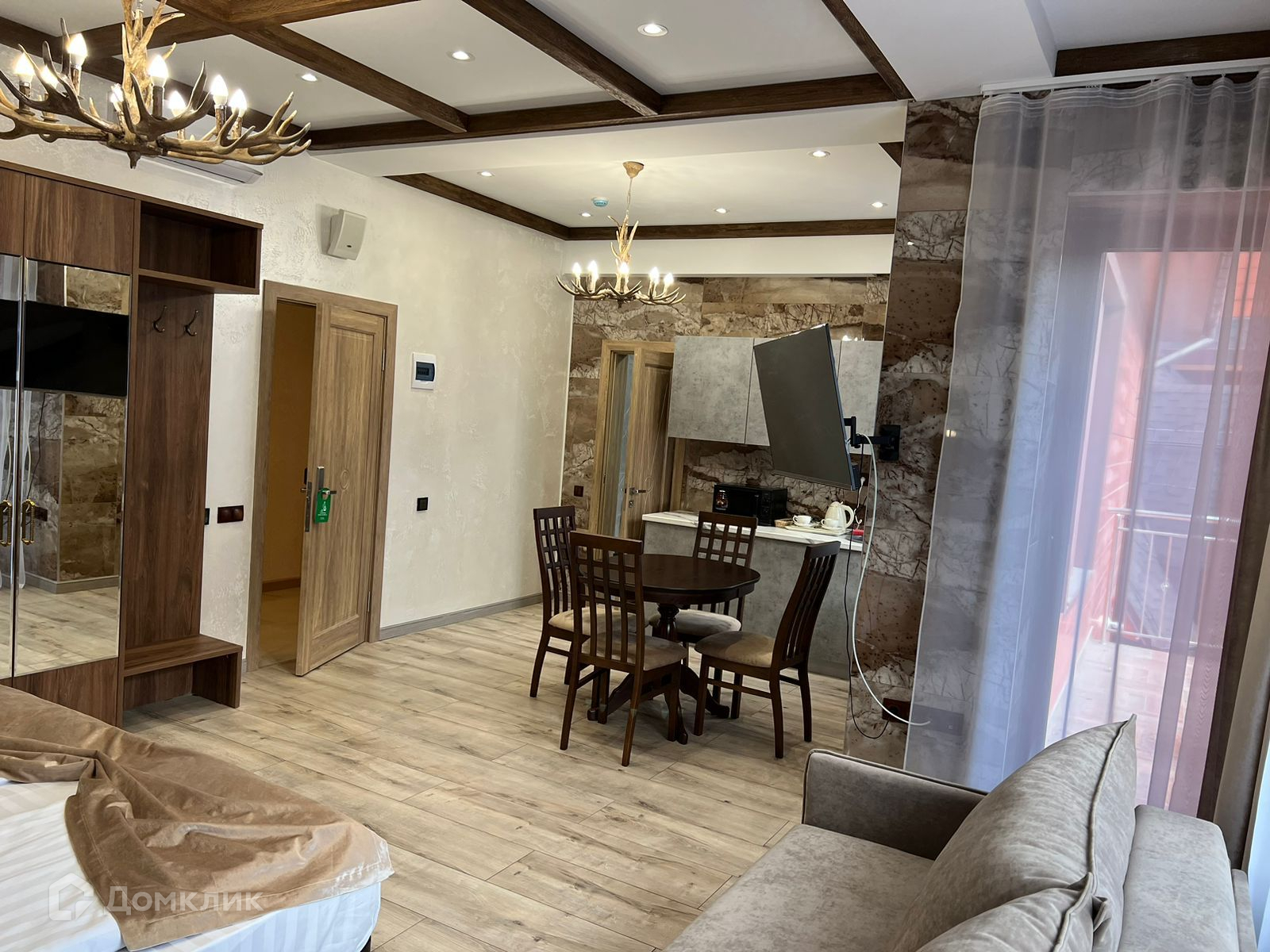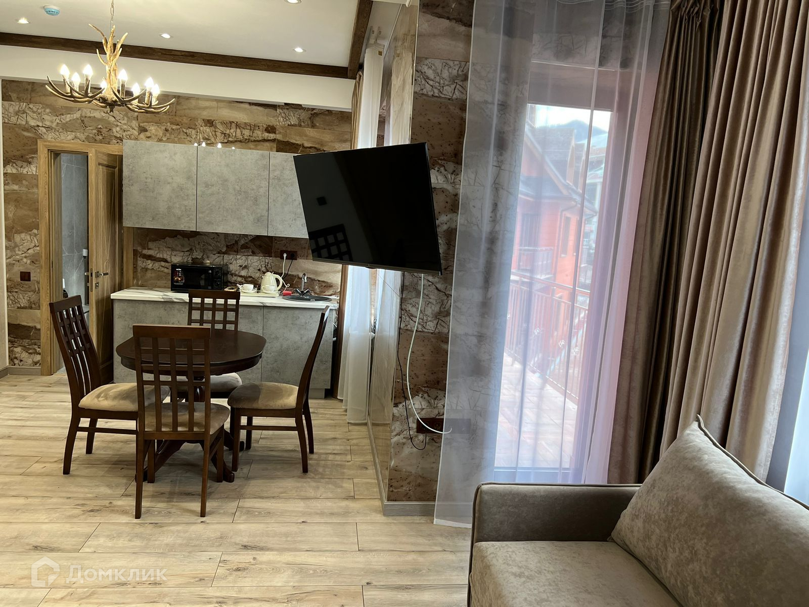 Апартамент полностью укомплектован мебелью и техникой, выполнен новый дизайнерский ремонт в стиле шале. Вид из окон на горы.