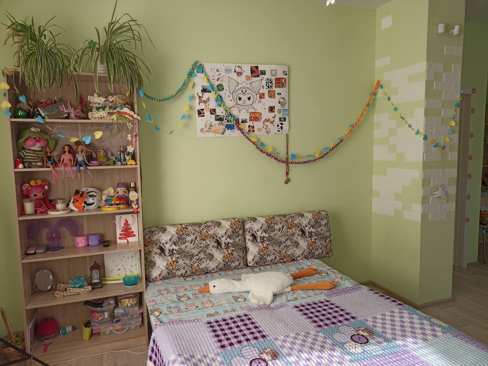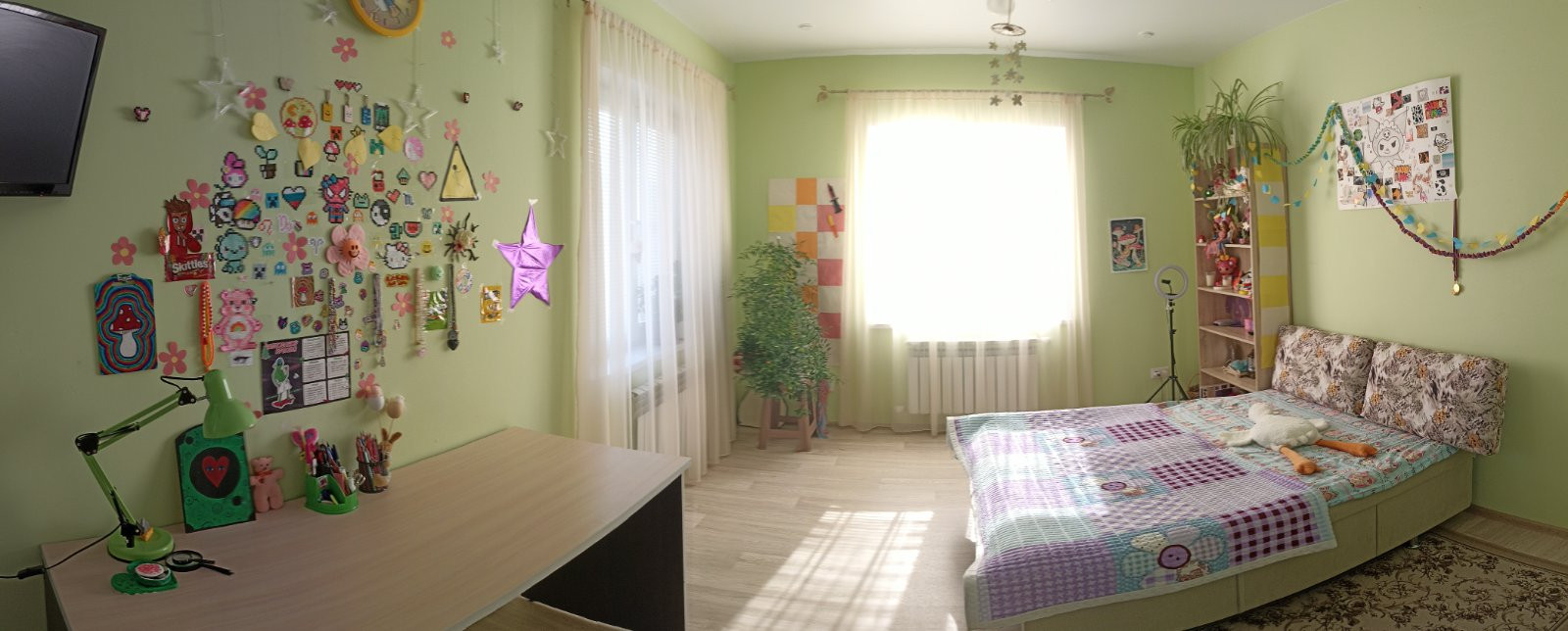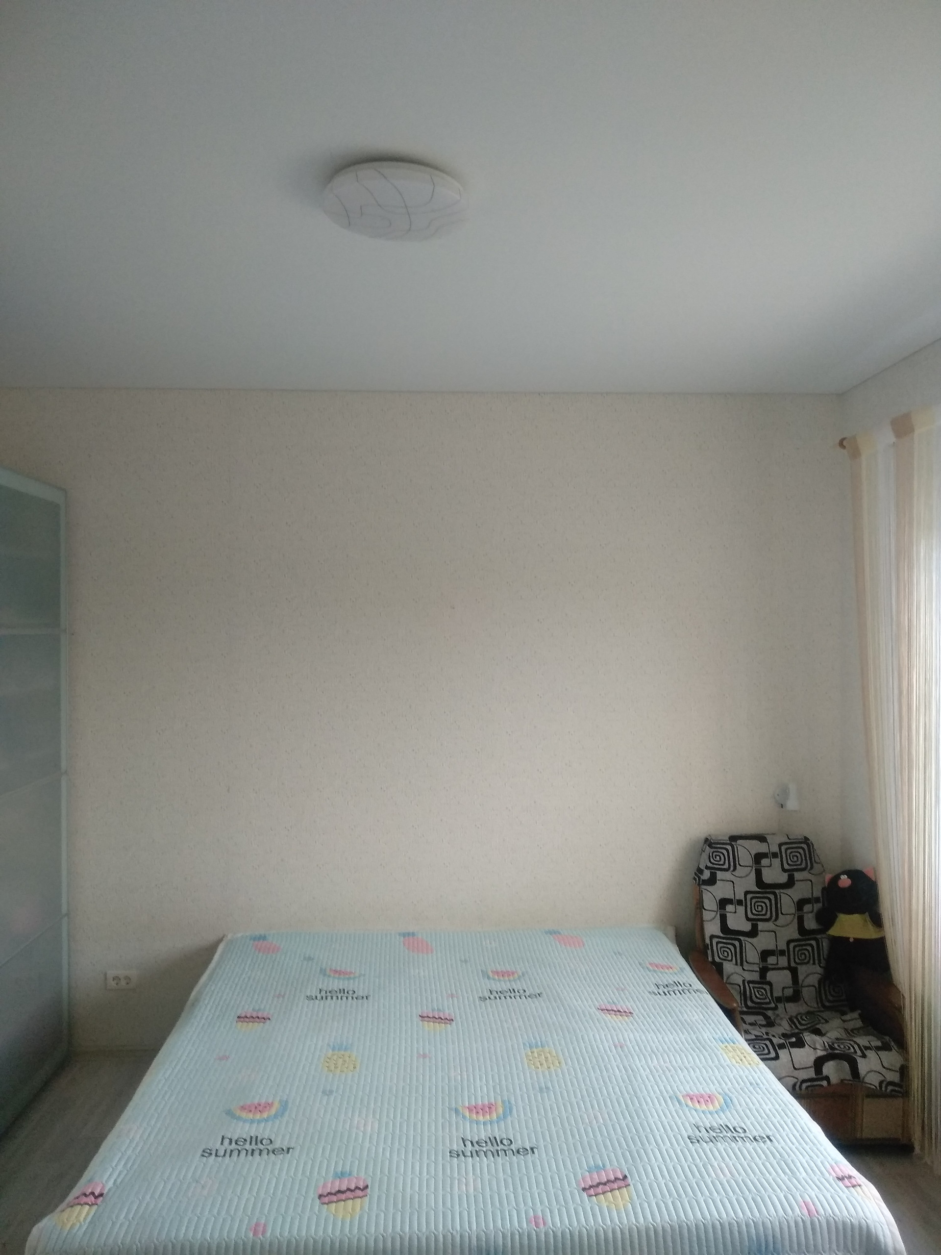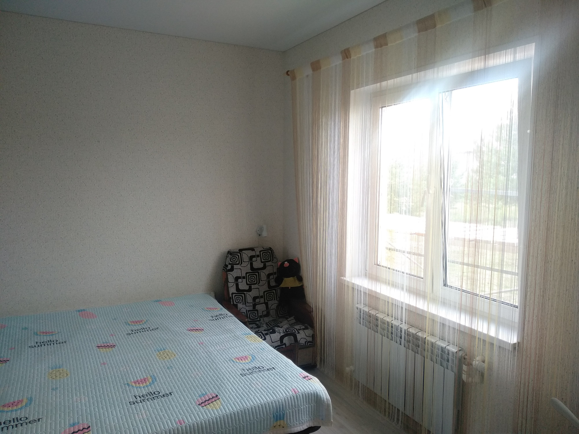 На втором этаже огромнейшая комната (33 кв.м.) с тремя окнами и полностью с готовым ремонтом. Натяжной белый матовый потолок, точечные светильники, трехзонное освещение (две зоны точечные светильники, плюс люстра). Стены покрашены, на полу качественный линолеум.
