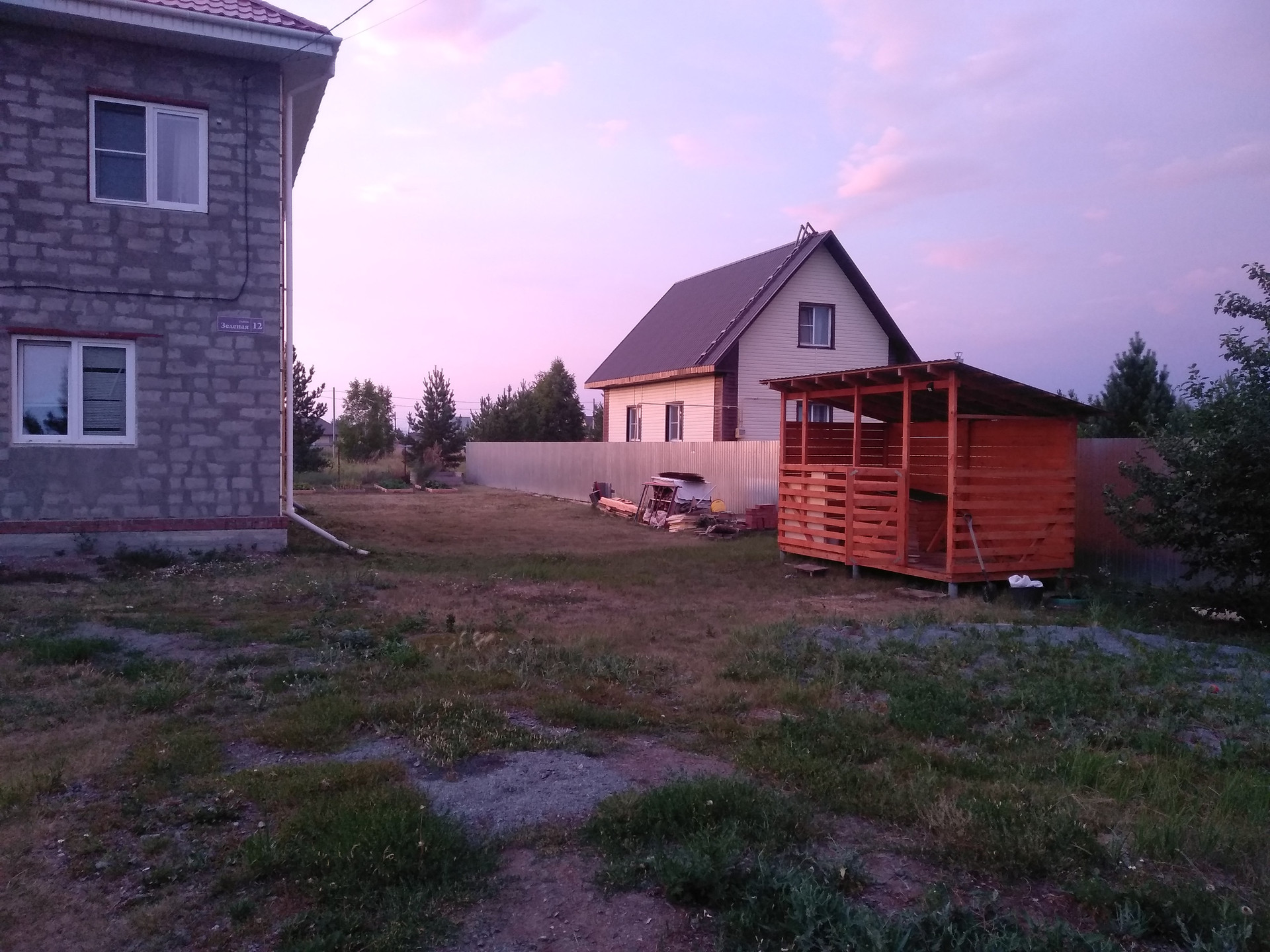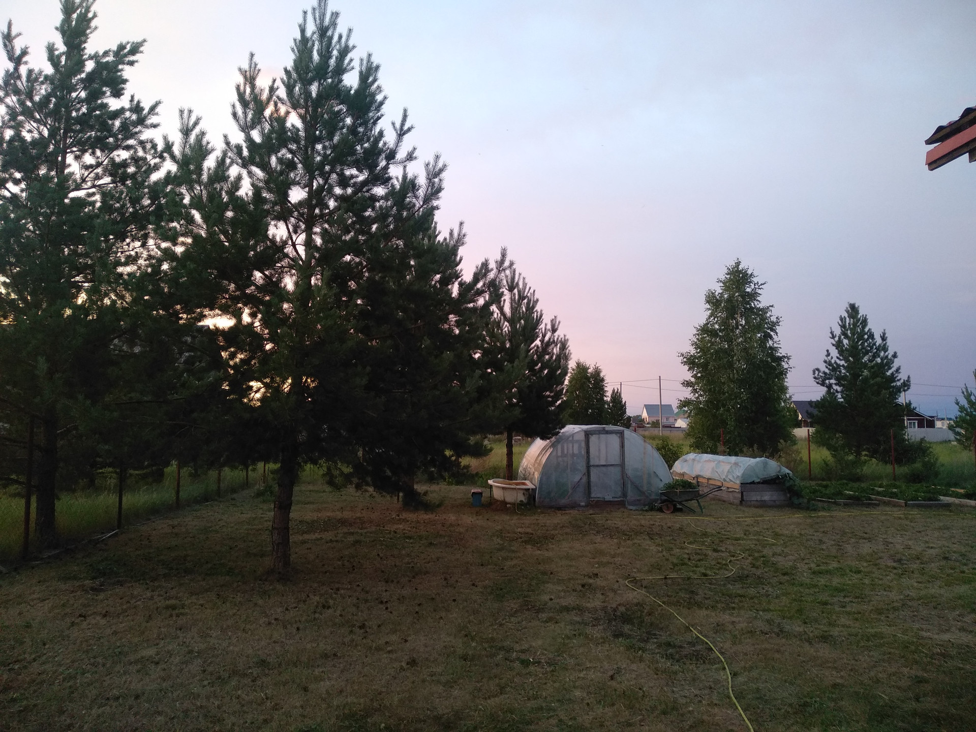 В сад завезен чернозем, установлена теплица, парник и сформированы с деревянным ограждением 8 больших грядок, на 3 из которых сортовая клубника. Посажены кусты смородины, крыжовника, вишни, черемухи. Также имеется взрослая яблоня, у которой ветки привиты разными сортами и в конце лета она дает обильный урожай разных вкусных яблочек. На территории участка растут 7 красивых сосен, от которых и тень и аромат хвои.