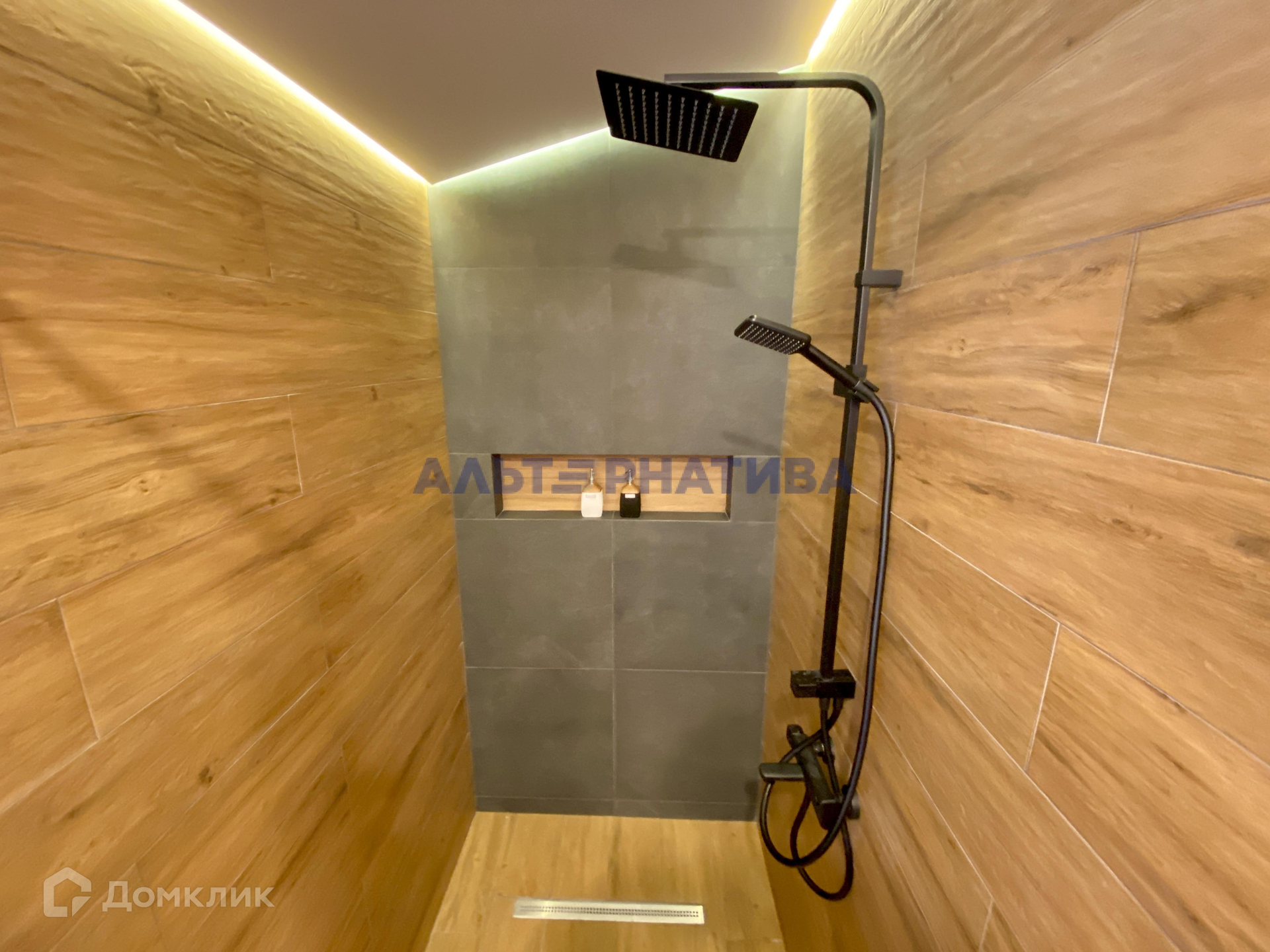 Внутренняя отделка дизайнерская, выполнена клееной имитацией бруса с покраской в два слоя краской "Тиккурила", цвет "Беленый дуб". Душевая изготовлена отдельно, в виде душевого уголка, отделка - керамогранит. Кухонная зона подготовлена под кухонную мебель, имеет все необходимые сантехнические выводы, силовой кабель под плиту. Напольное покрытие и ступени террасы выполнены из террасной доски, пропитанной террасным маслом.