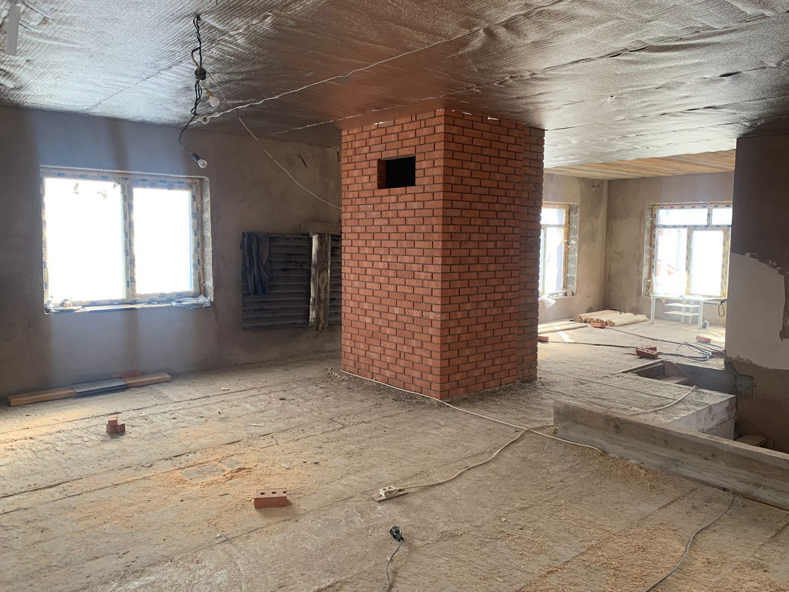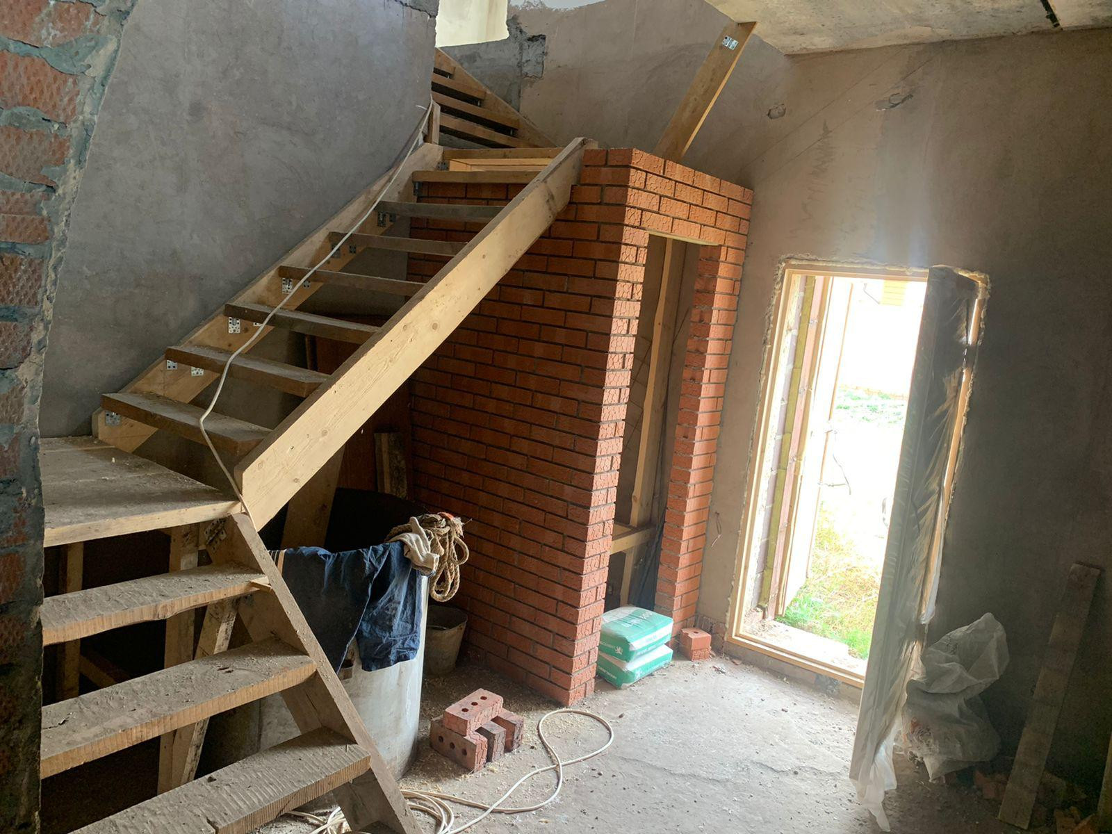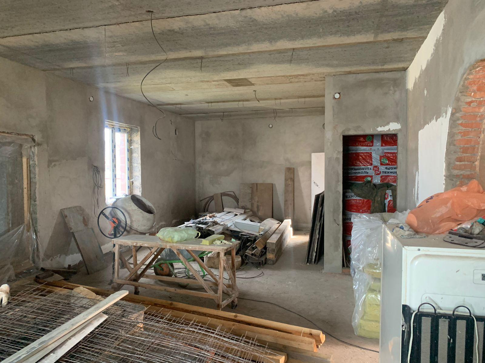 Внутри дома стены во всех комнатах отштукатурены. Полы залиты оба этажа. На участке имеется колодец с водой, шамбо -2 шт. Газ на границе участка. Электричество - 380В, сделана раскидка кабелей.