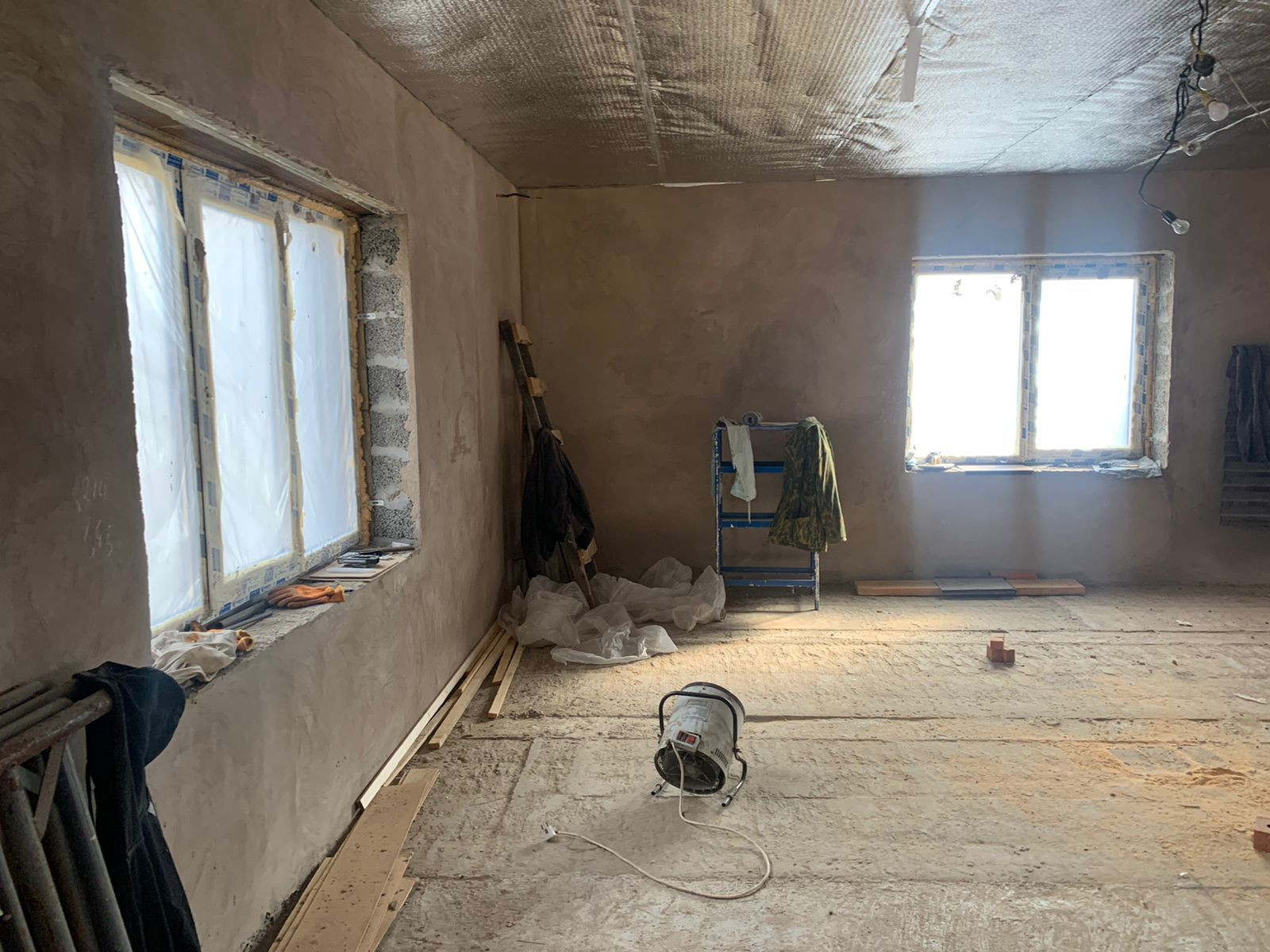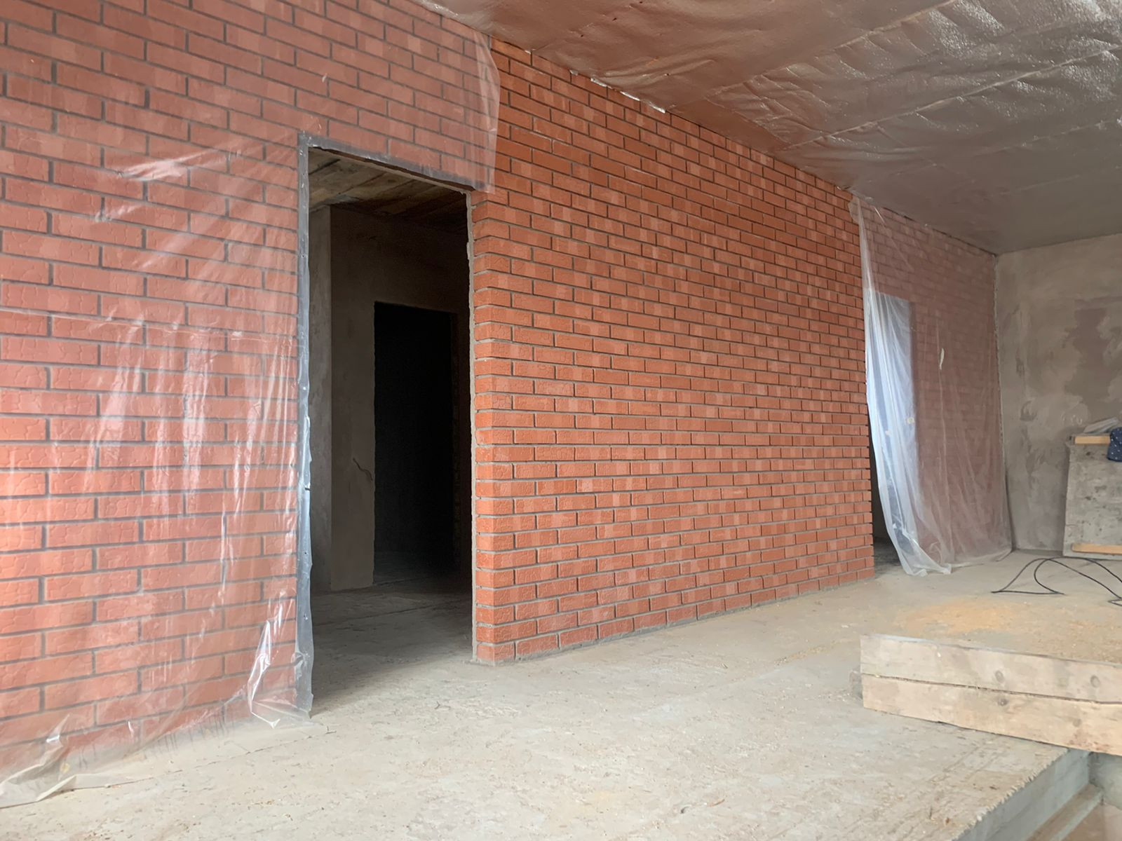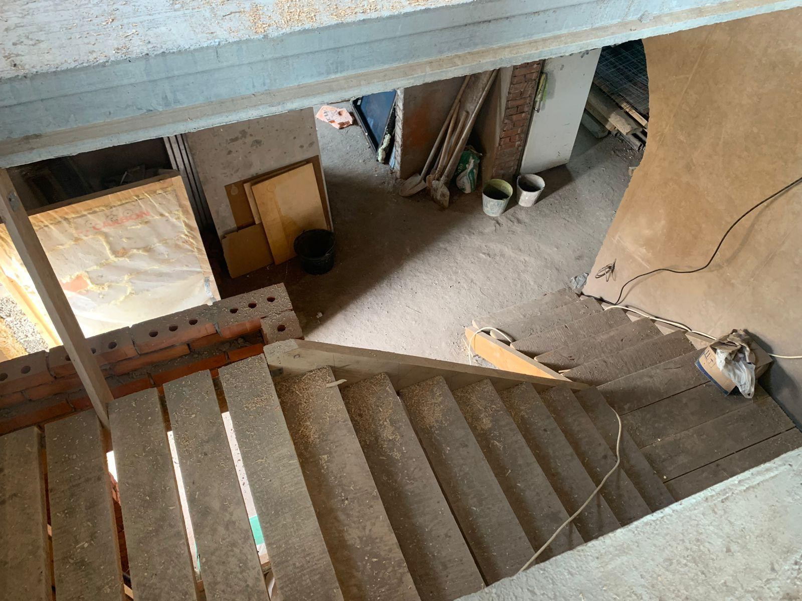 Внутри дома стены во всех комнатах отштукатурены. Полы залиты оба этажа. На участке имеется колодец с водой, шамбо -2 шт. Газ на границе участка. Электричество - 380В, сделана раскидка кабелей.