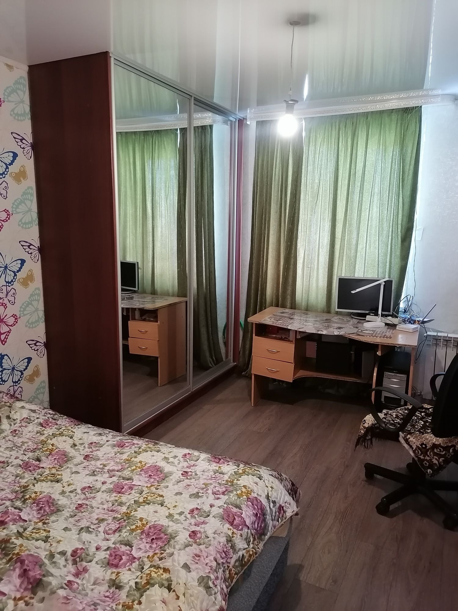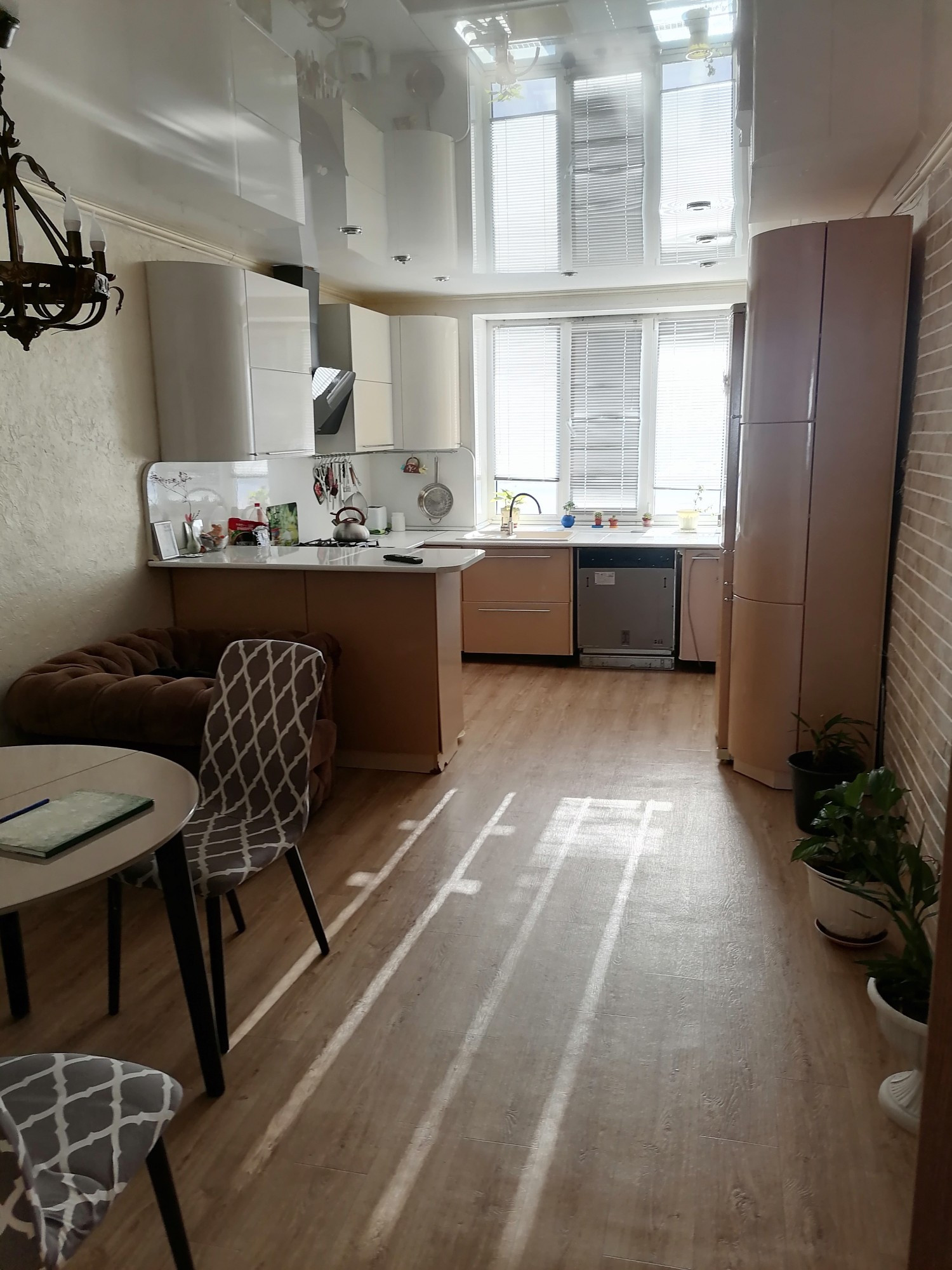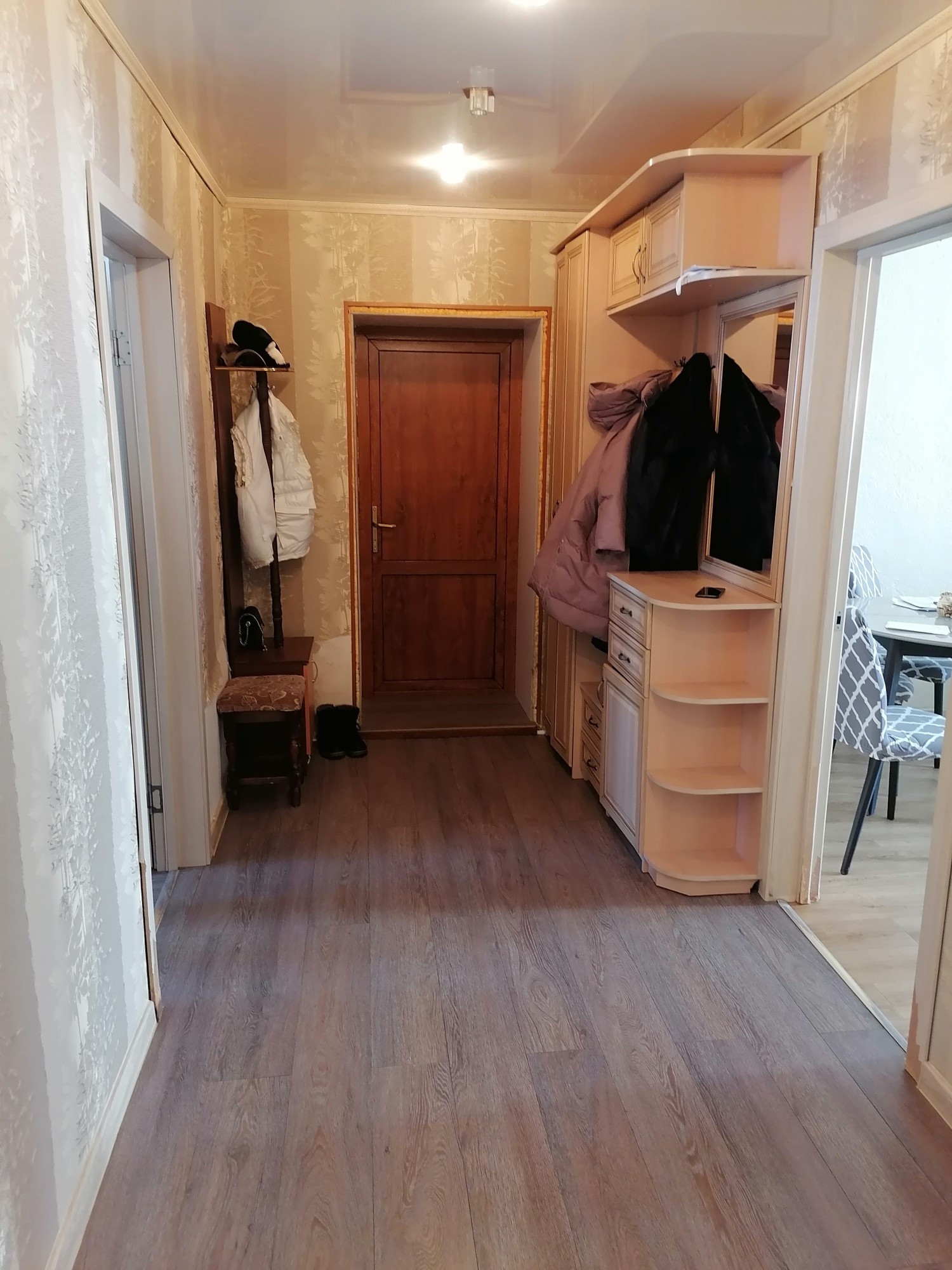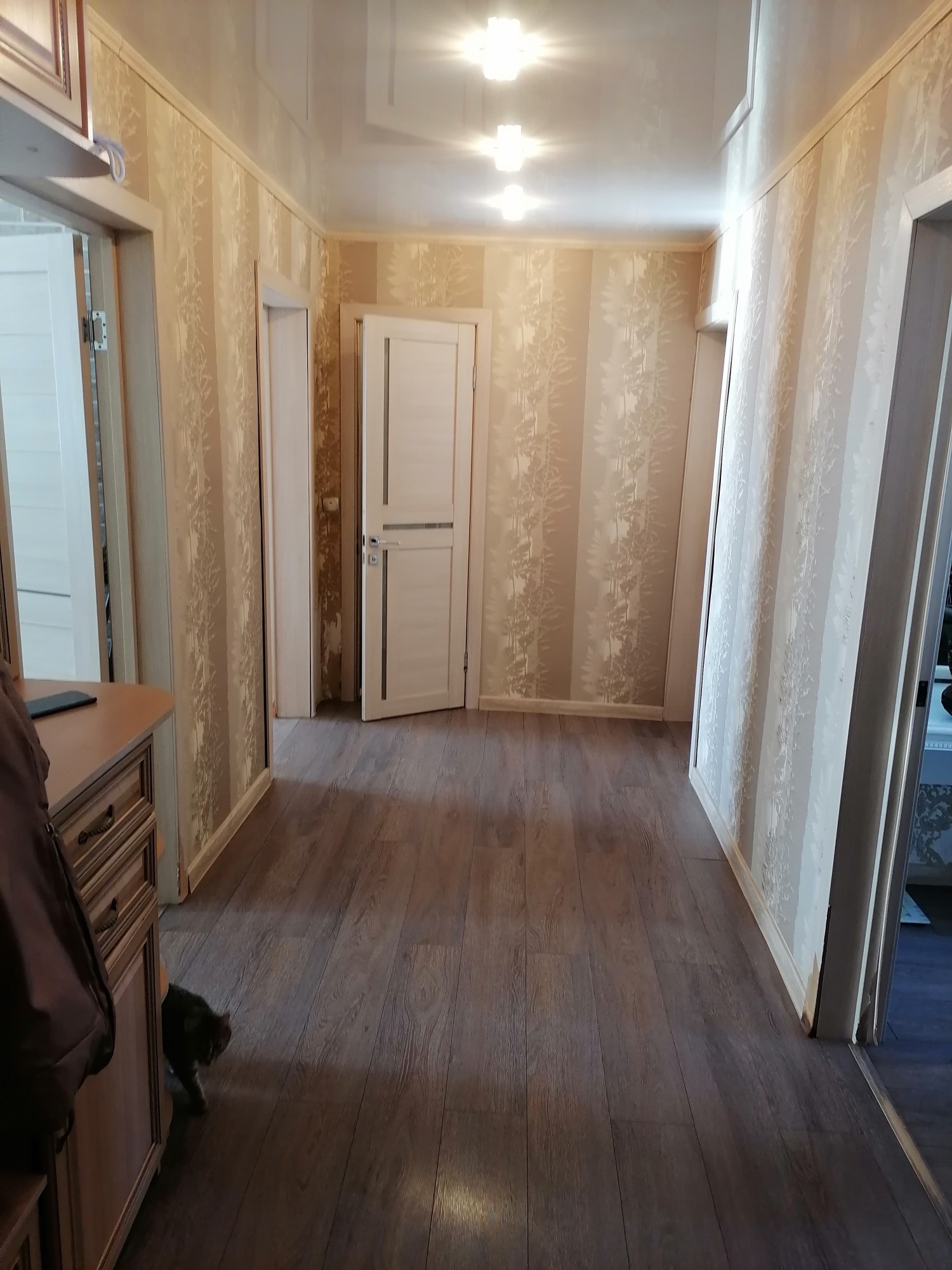 В доме сделан качественный ремонт. Окна пластиковые. Стены выровнены, отштукатурены и поклеены хорошими обоями. Полы выровнены и утеплены по всей квартире, во всех комнатах постелен ламинат, потолки натяжные с точечным освещением. В доме очень тепло.