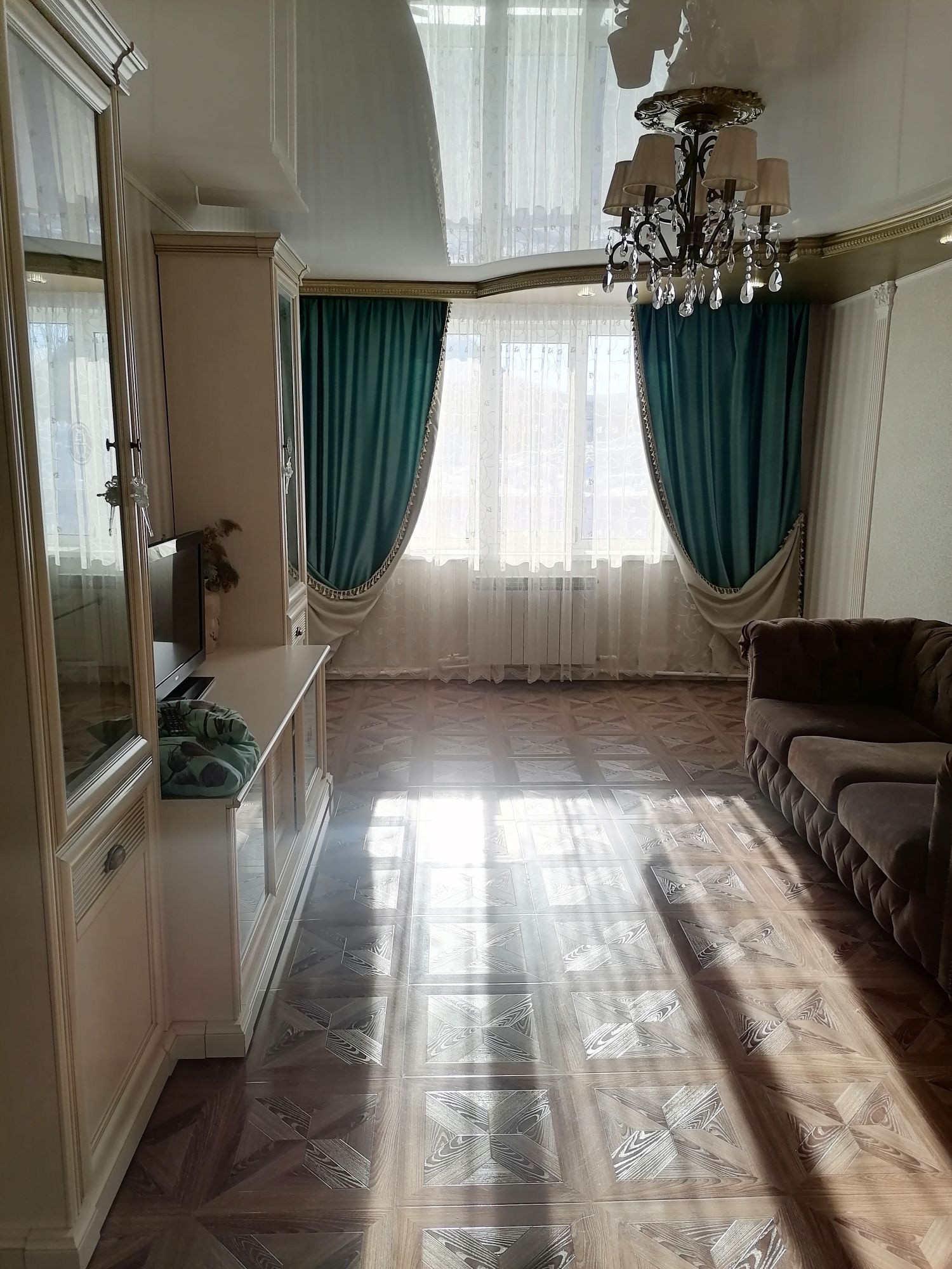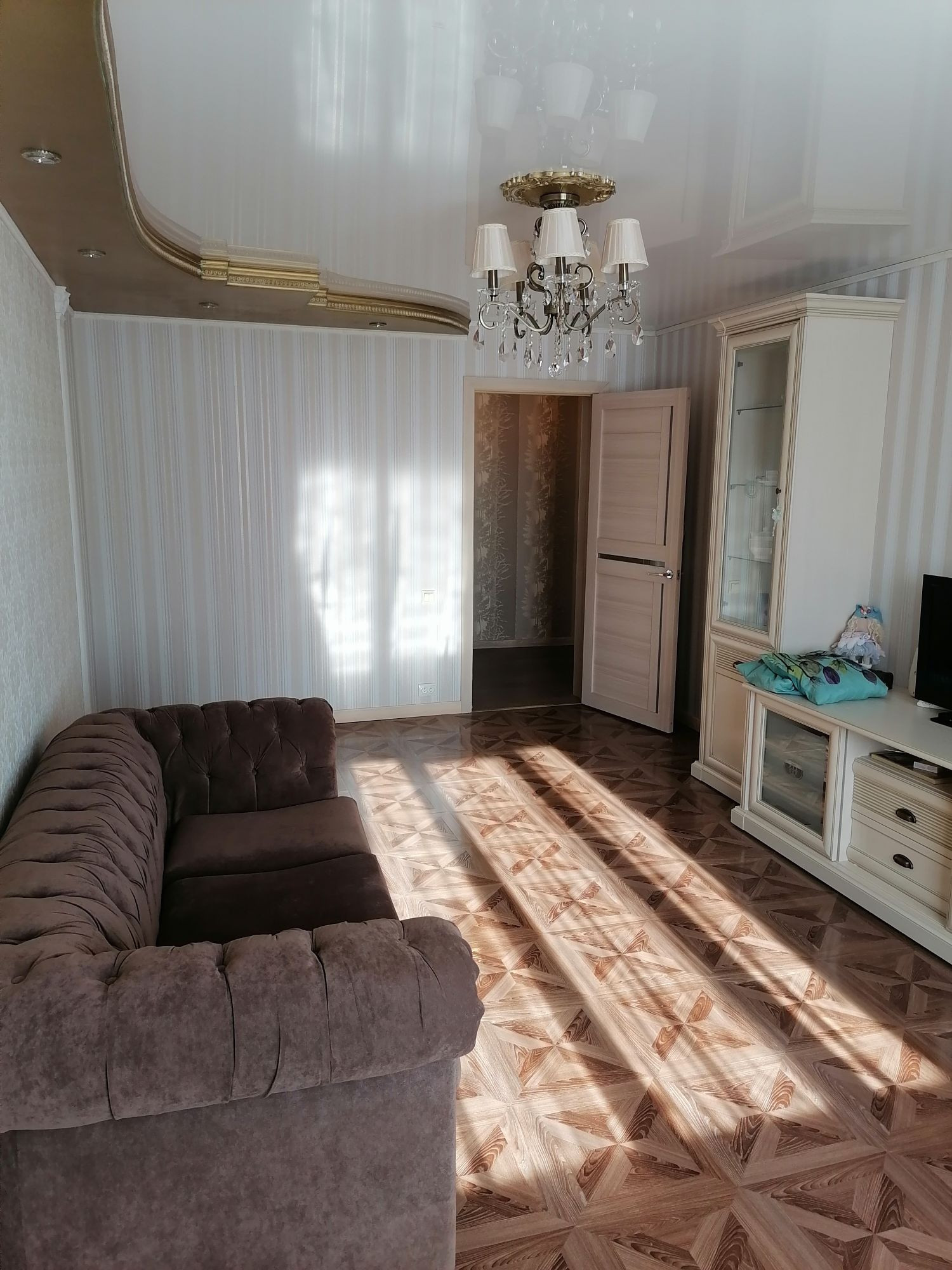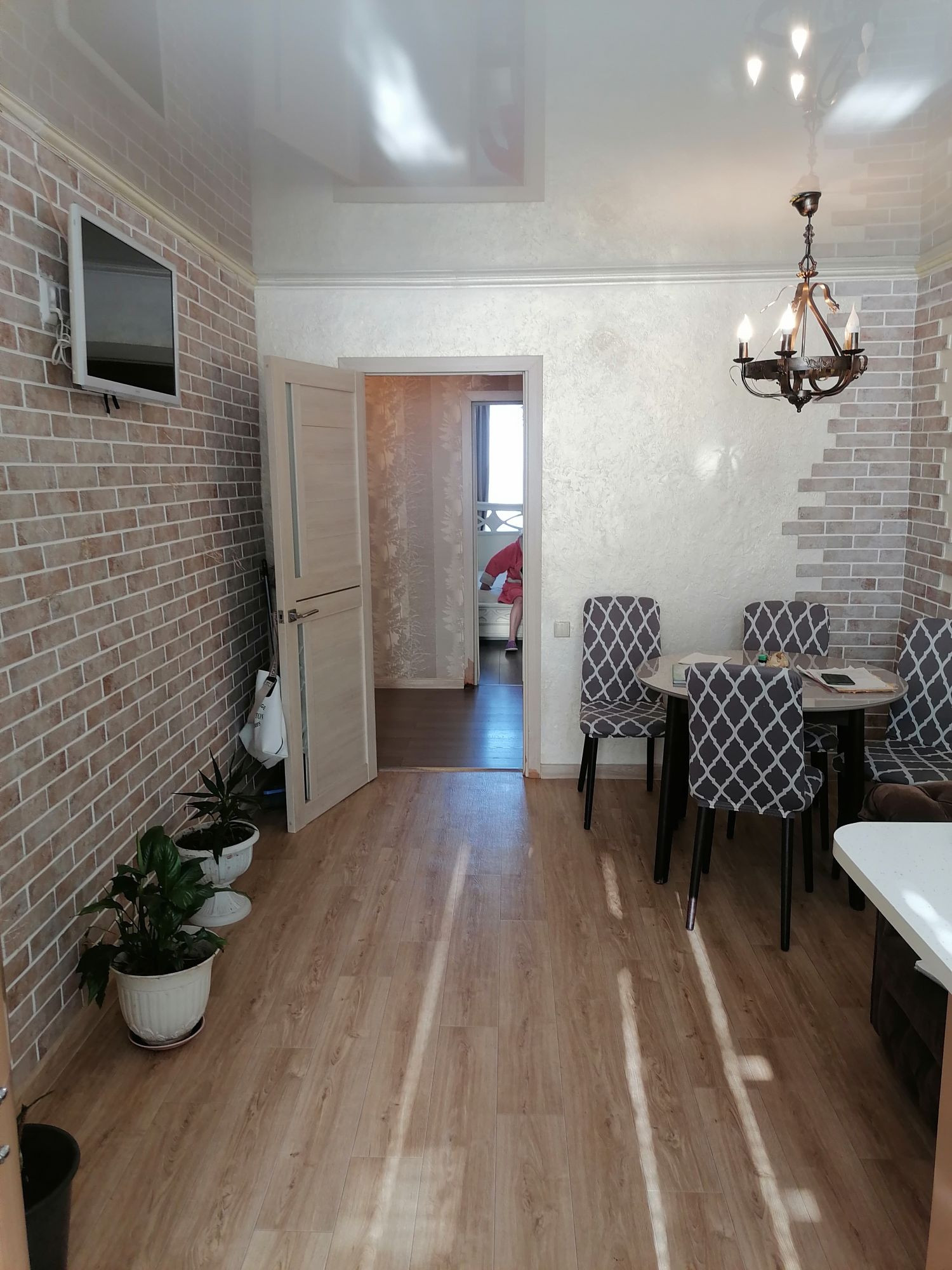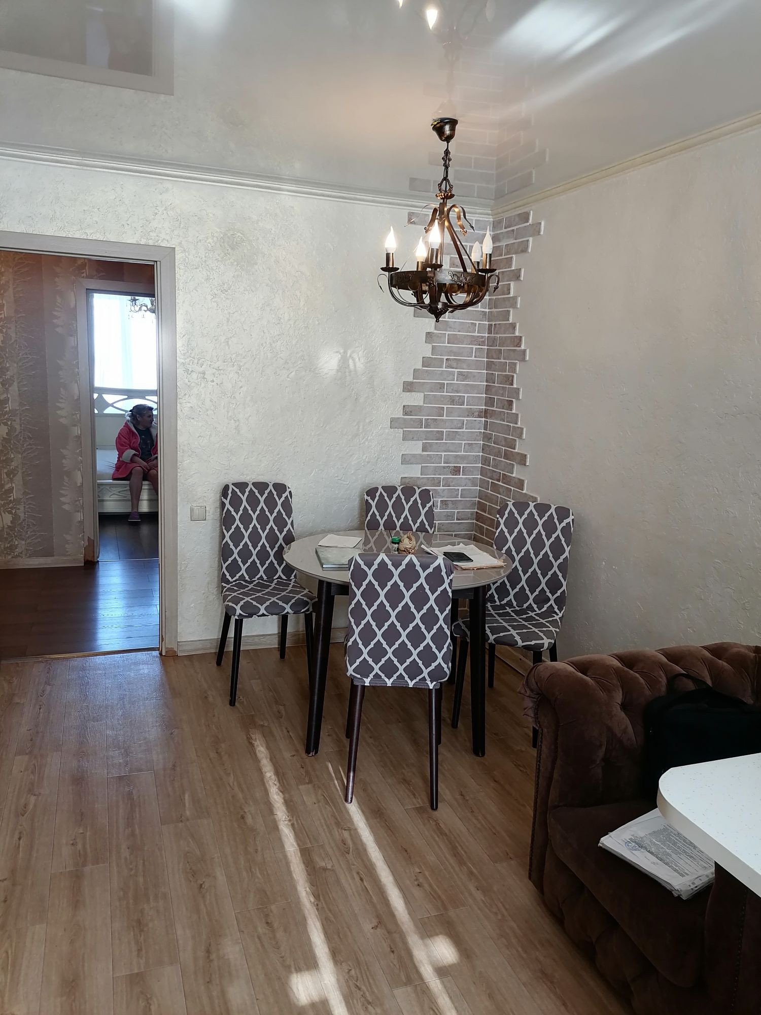 В доме сделан качественный ремонт. Окна пластиковые. Стены выровнены, отштукатурены и поклеены хорошими обоями. Полы выровнены и утеплены по всей квартире, во всех комнатах постелен ламинат, потолки натяжные с точечным освещением. В доме очень тепло.