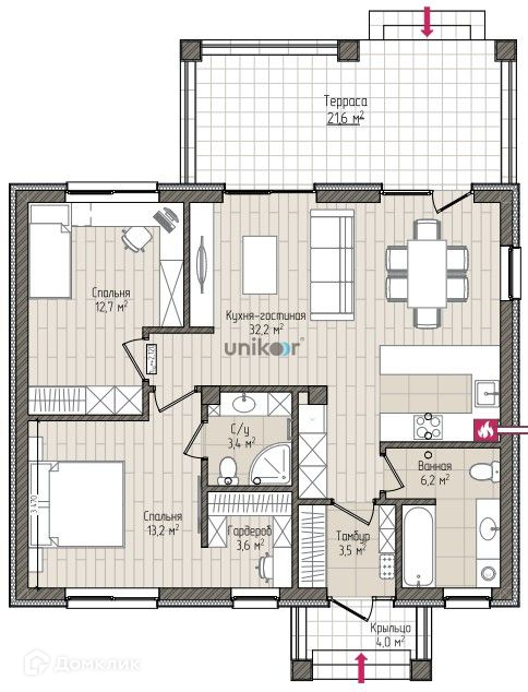 Общая площадь дома 100,4 м2 Просторная кухня-гостиная 32,2 м2, комнаты 13,2 м2 и 12,7 м2, с/у 3,4 м2, ванная 6,2 м2, гардероб 3,6 м2, тамбур 3,5 м2, крыльцо 4 м2, терраса 21,6 м2