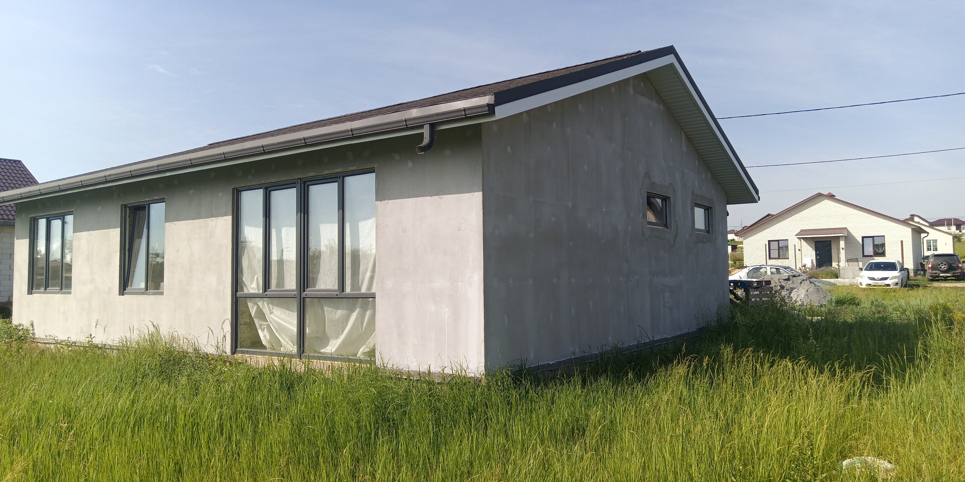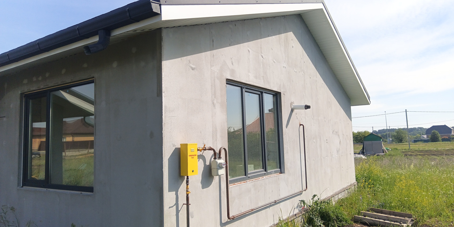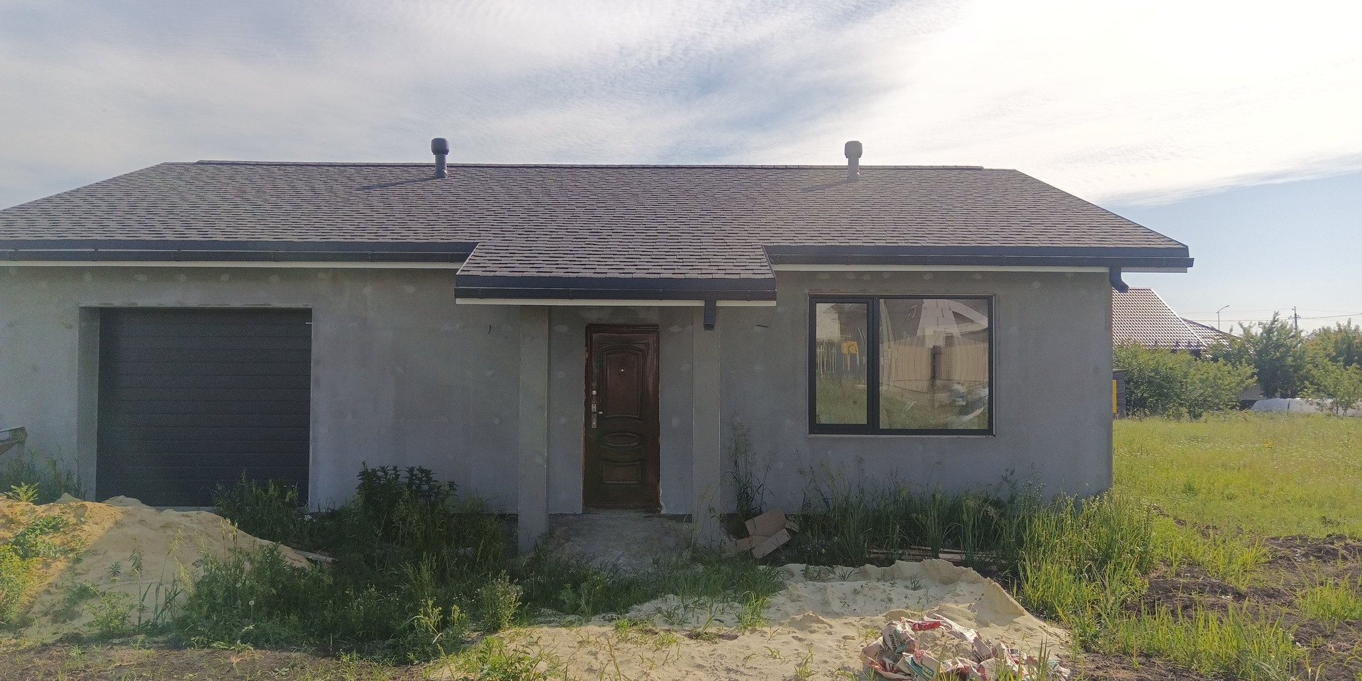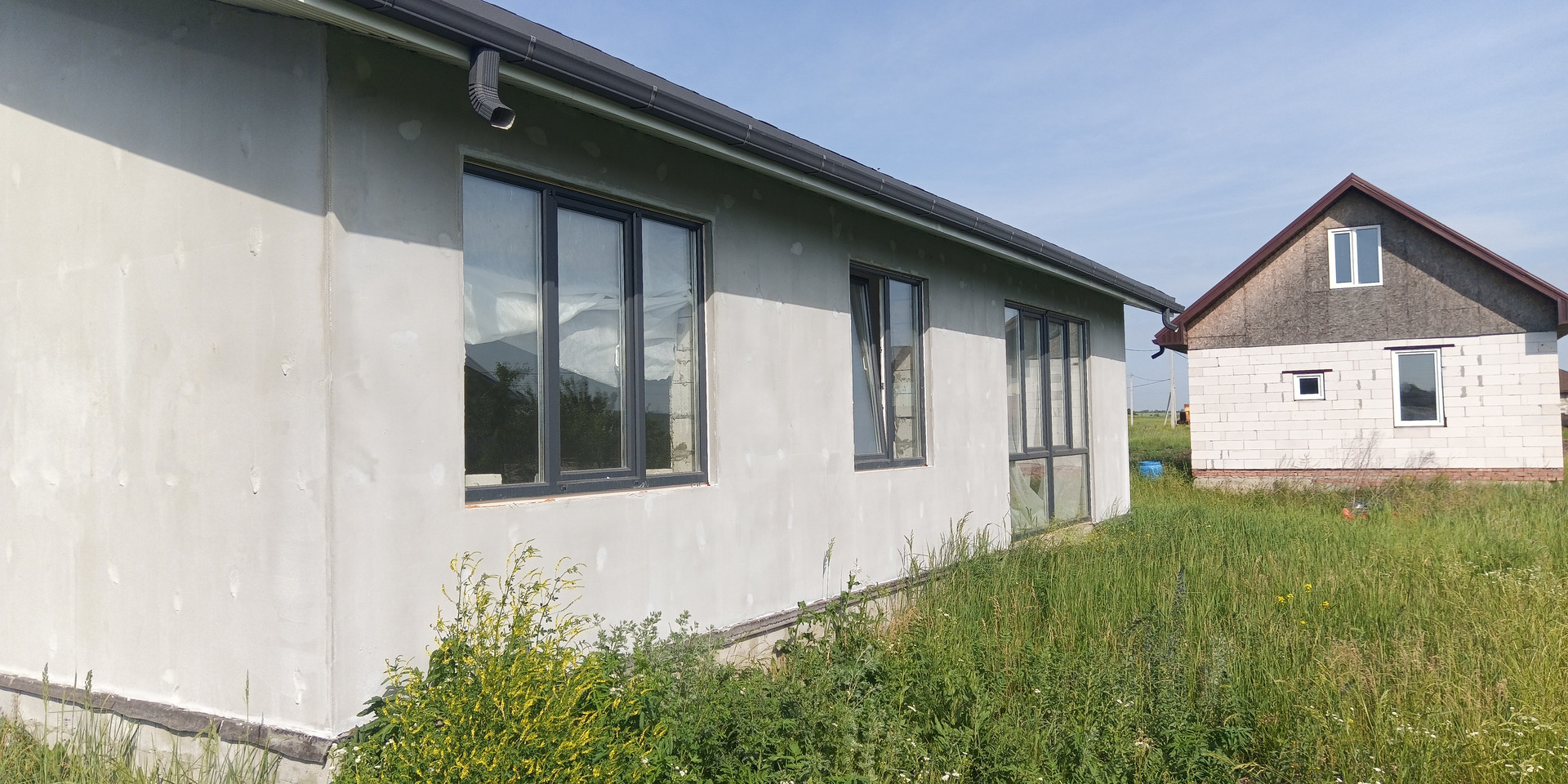 Дом 2018 года постройки, сложен из газосиликатных блоков с внешней отделкой "короед" (скоро будет закончен). Крыша - мягкая кровля. В дом заведены свет, газ, вода, канализация (септик). Жилая площадь - 63.8м2, вместе с гаражом - 96м2. Участок - 15.53 сотки.