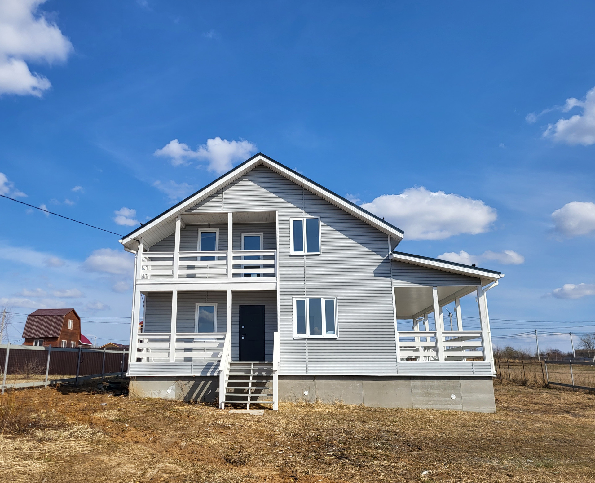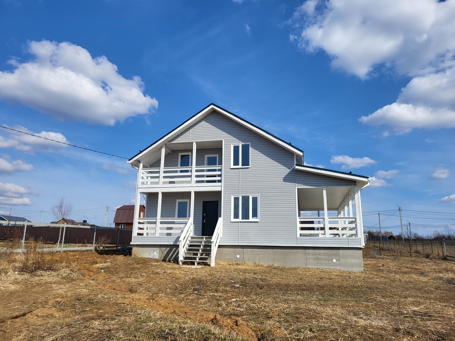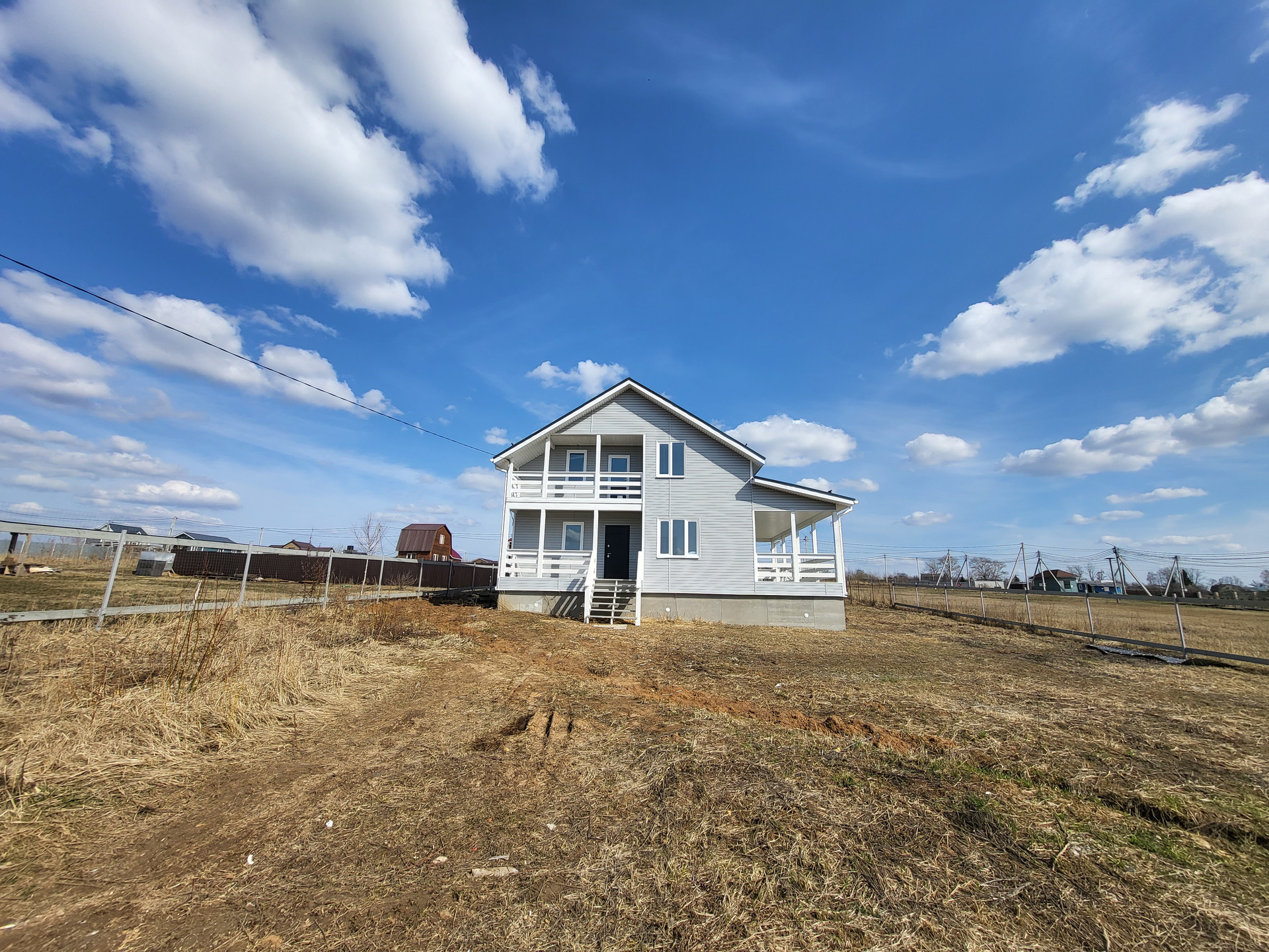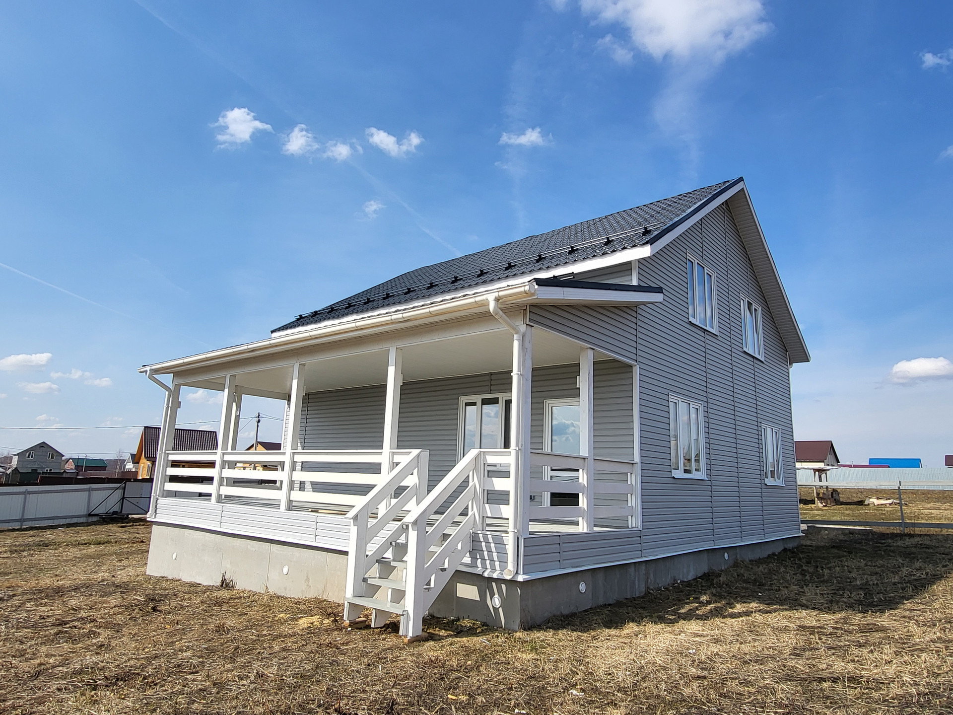Дом построен по каркасной технологии, очень хорошо утеплен минеральными плитами (200мм). Крыша металлочерепица. Наружная отделка - виниловый сайдинг серого цвета. Внутренняя отделка - имитация бруса. Стены окрашены в белый цвет, на пол уложен ламинат. Пластиковые двух камерные окна. Заведены и подключены все коммуникации. Полностью выполнена и запущена система отопления, водоснабжения и канализация. Электричество 15 кВт, сельский тариф на электроэнергию. Сделана разводка электричества в доме (освещение, розетки, выключатели). Септик Топаз. В санузле первого этажа установлены раковина, унитаз и душ, в санузле второго этажа - унитаз.