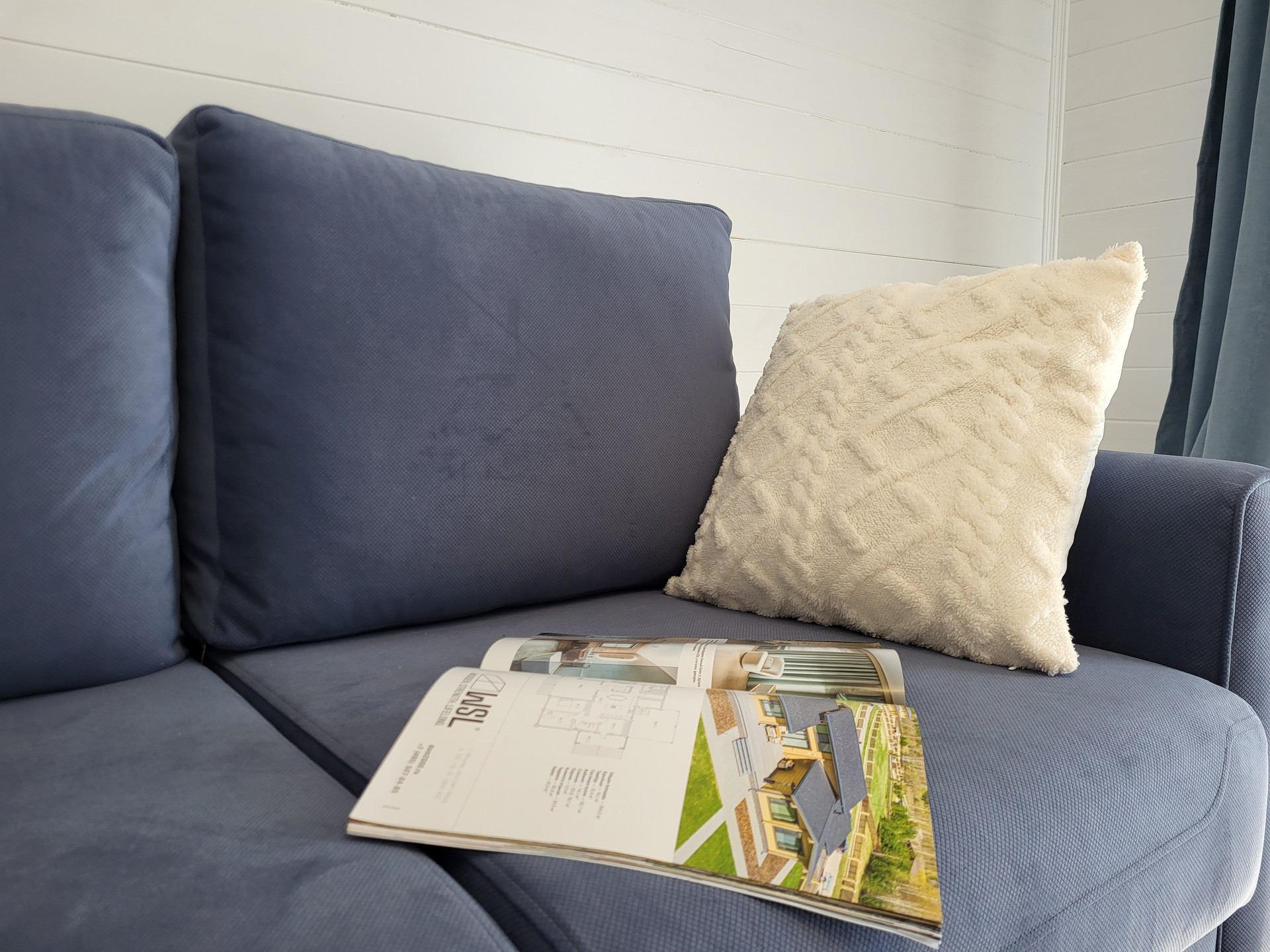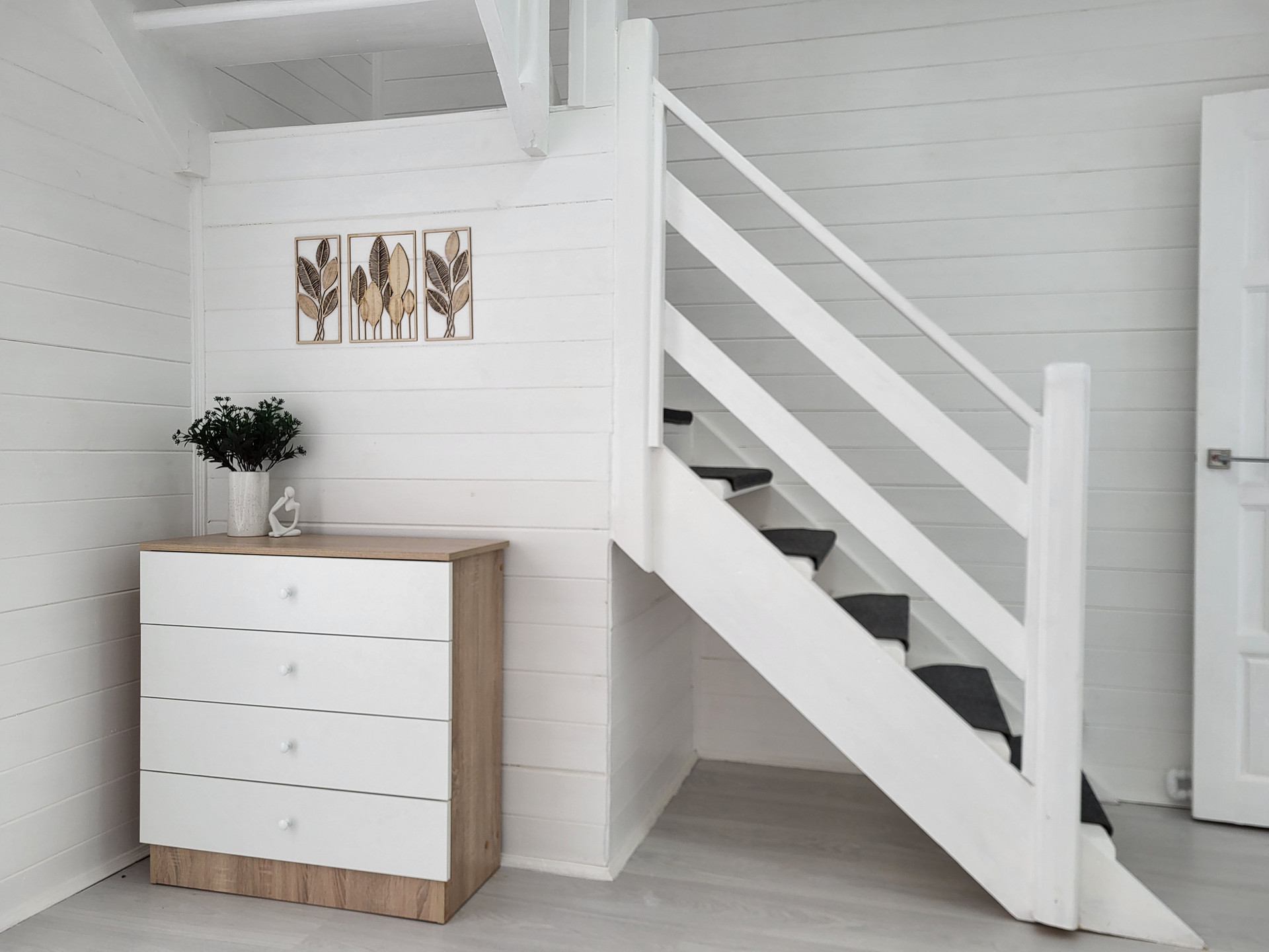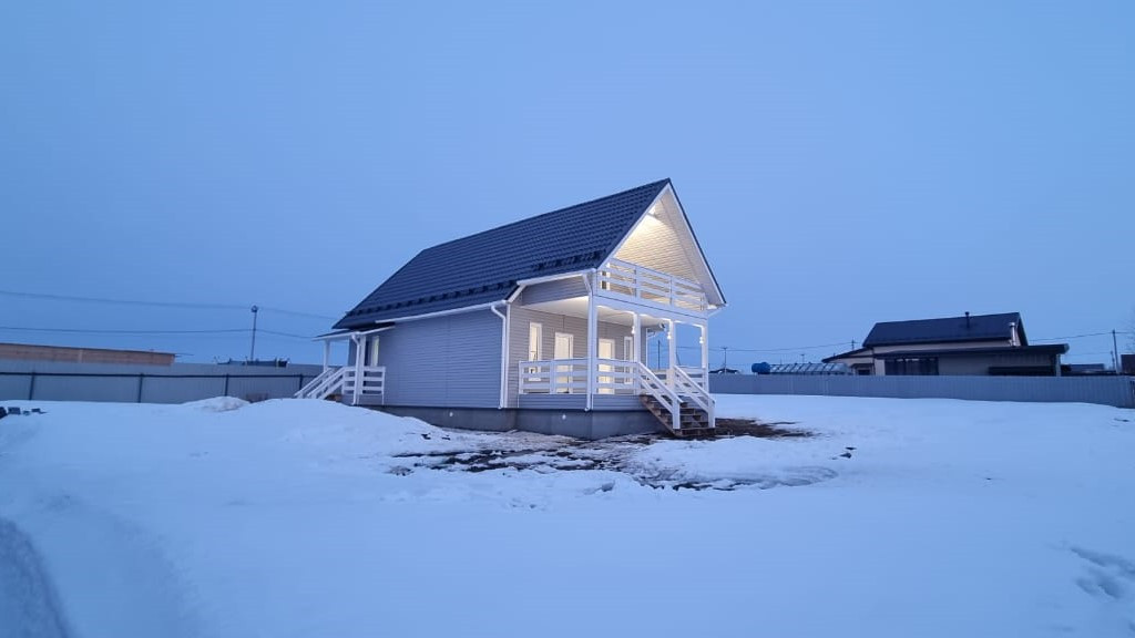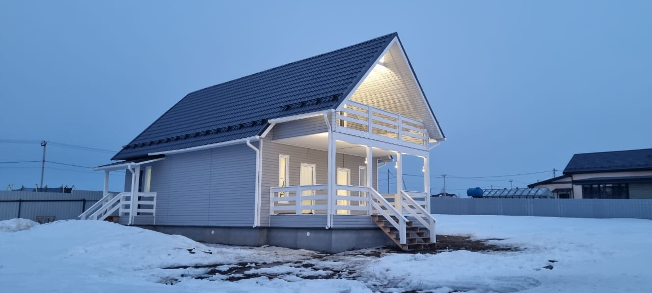 Дом построен по каркасной технологии утеплен минеральными плитами, что обеспечивает тепло и уют в любое время года. Крыша - металлочерепица, внешняя отделка - виниловый сайдинг серого цвета, а внутренняя - имитации бруса. Внутренние стены окрашены в белый цвет, что придает интерьеру легкость и воздушность. Напольное покрытие - ламинат, обеспечивает комфорт и долговечность использования. Внутренняя отделка позволяет воплотить любые дизайнерские идеи и создать уютную атмосферу в доме.
