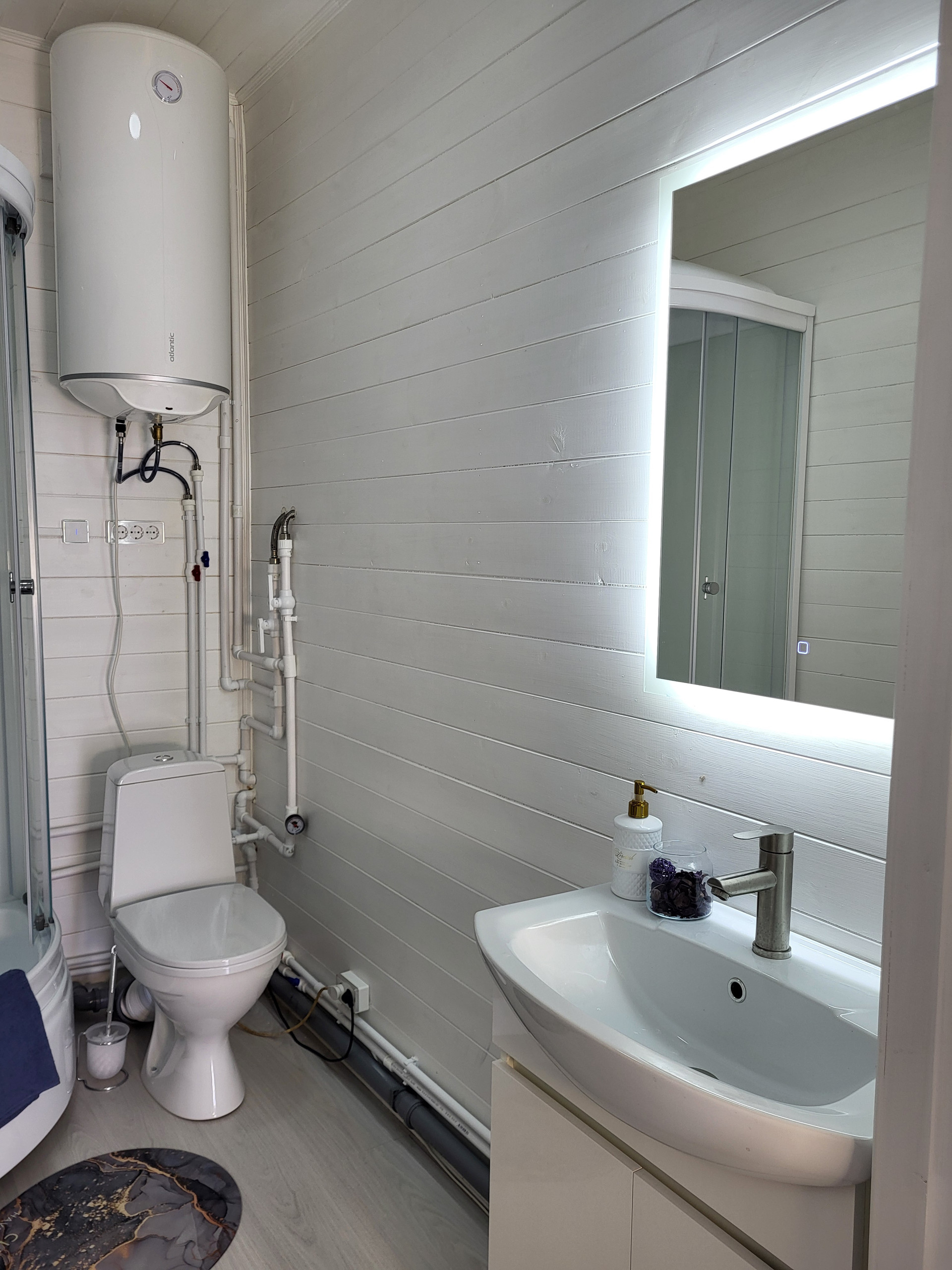 Отопление, водоснабжение и канализация полностью готовы к использованию. Электричество 15 киловатт с сельским тарифом на электроэнергию, что существенно экономит расходы на коммунальные услуги. Выполнена разводка электричества - установлены светильники, розетки и выключатели. В санузле на первом этаже - раковина, унитаз и душевая кабина, зеркало с подсветкой.