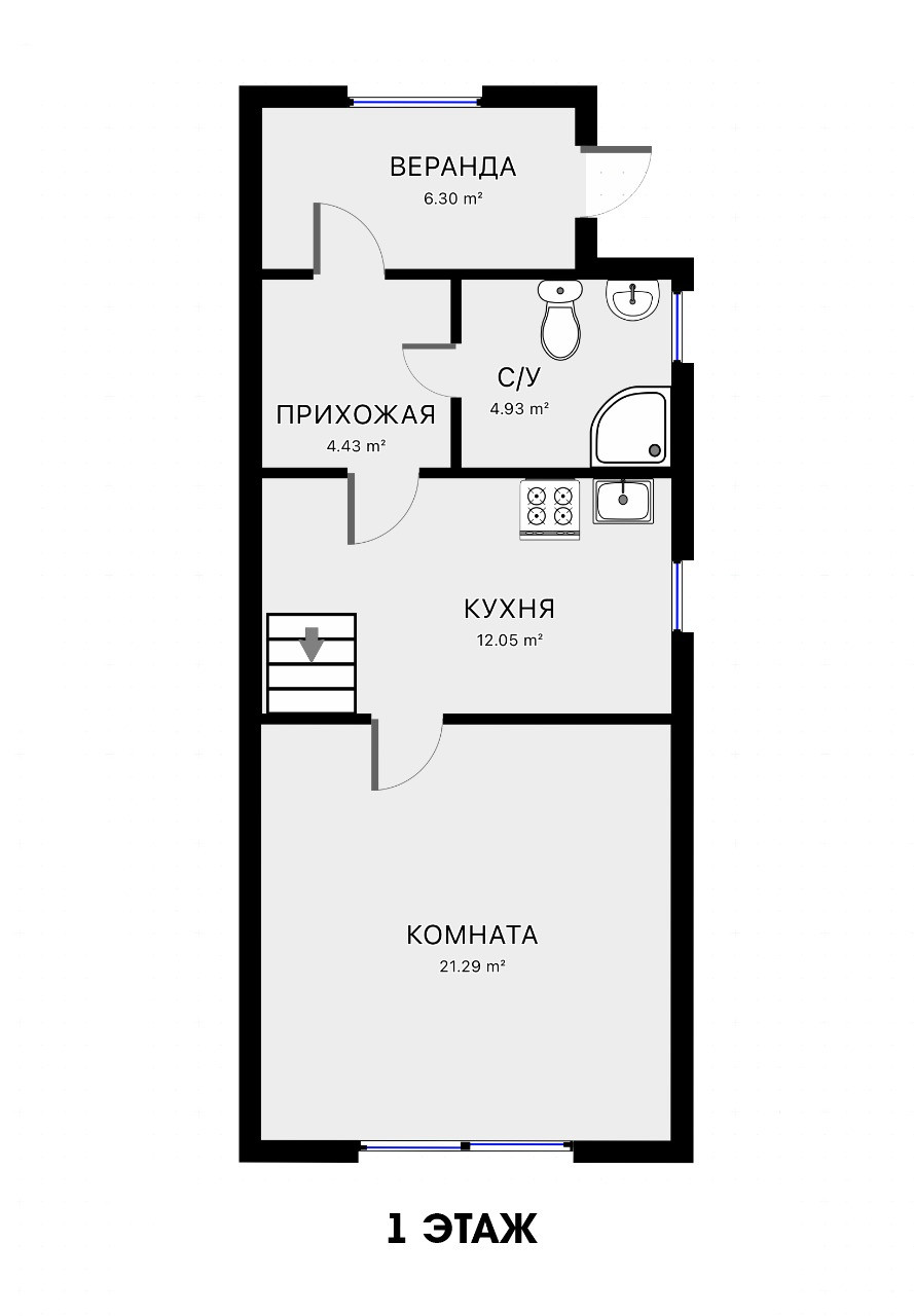 Высота потолков на 1 этаже – 2.5 м, на 2 этаже – 2.1 м.