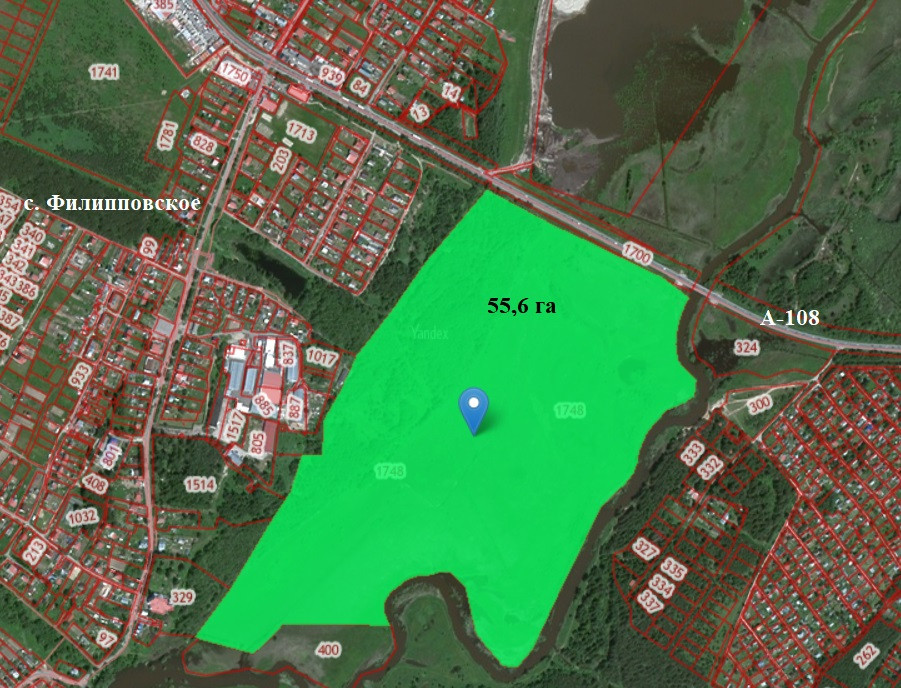 Предлагаем Вам уникальный земельный участок площадью 55,6 га на берегу реки Шерна в черте населенного пункта Филипповское.  Участок граничит с федеральной трассой А-108. Категория земли СХ-3, с возможностью перевода в ЛПХ.