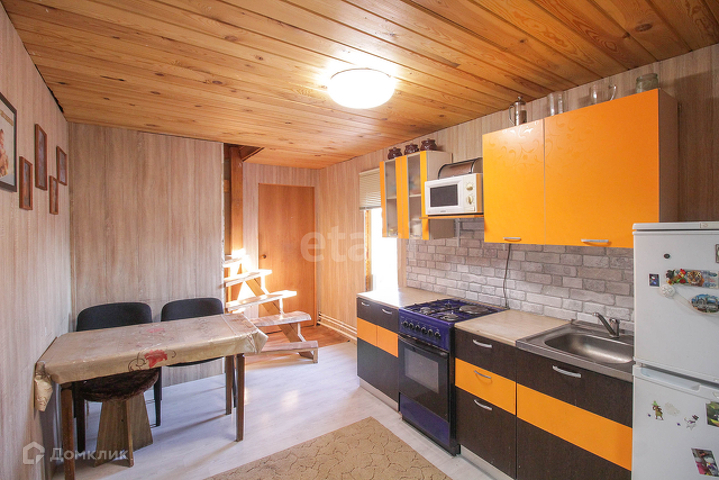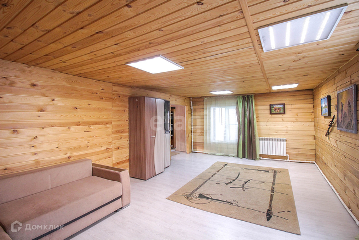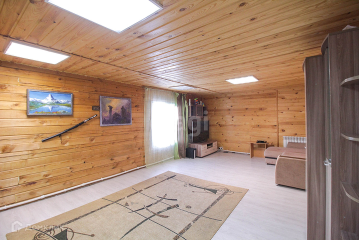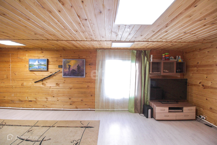 Потолок и стены в доме отделаны обшивочной доской (вагонка). Напольное покрытие на 1 этаже-ламинат,на втором-линолеум.