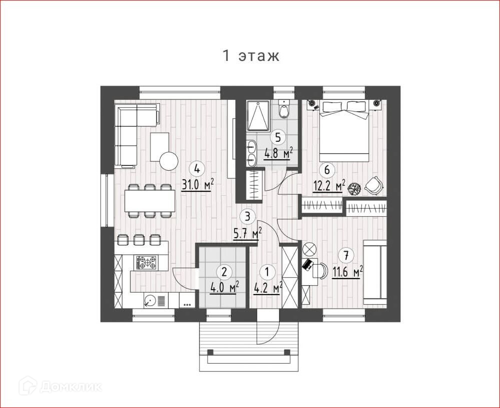 Еще одна выделенная зона хранения находится в центральном холле, рядом со входом в ванную комнату. Внутреннее пространство дома, не смотря на экономичную площадь, дает чувство простора и открытости благодаря открытой планировке объединенной кухни-гостиной и панорамному окну, выходящему во двор.