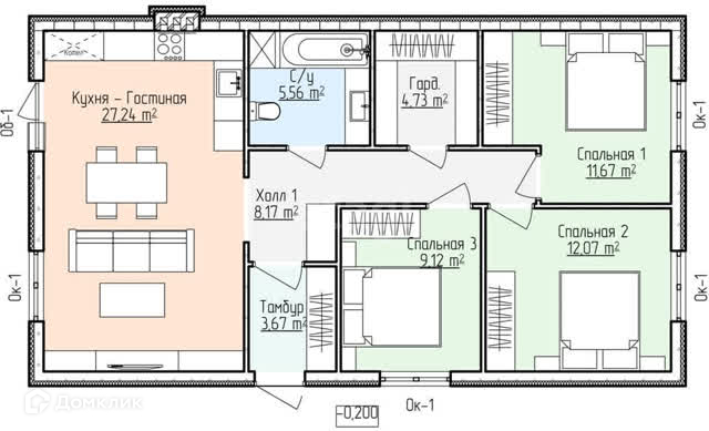 В данном варианте планировки представлена вместительная гостиная, объединенная с кухней-столовой, откуда можно попасть на просторную террасу. Три спальни оптимальной площади - это личное пространство для всех членов семьи, место для работы и отдыха. Рядом просторная гардеробная для хранения вещей или хозяйственных принадлежностей.