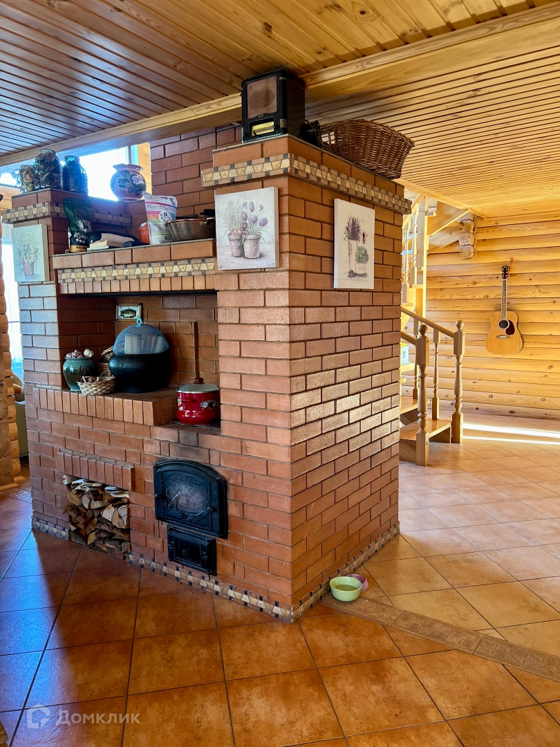 В середине дома расположена печь с камином, которая добавляет уюта в доме и создает домашнюю атмосферу.