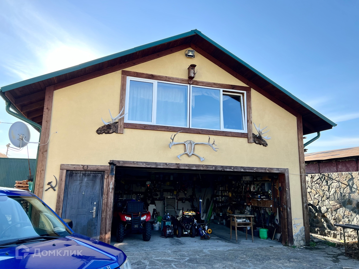 При въезде на территорию справа находится живописная зона отдыха, слева гараж для размещения автомобилей и хранения инструментов.