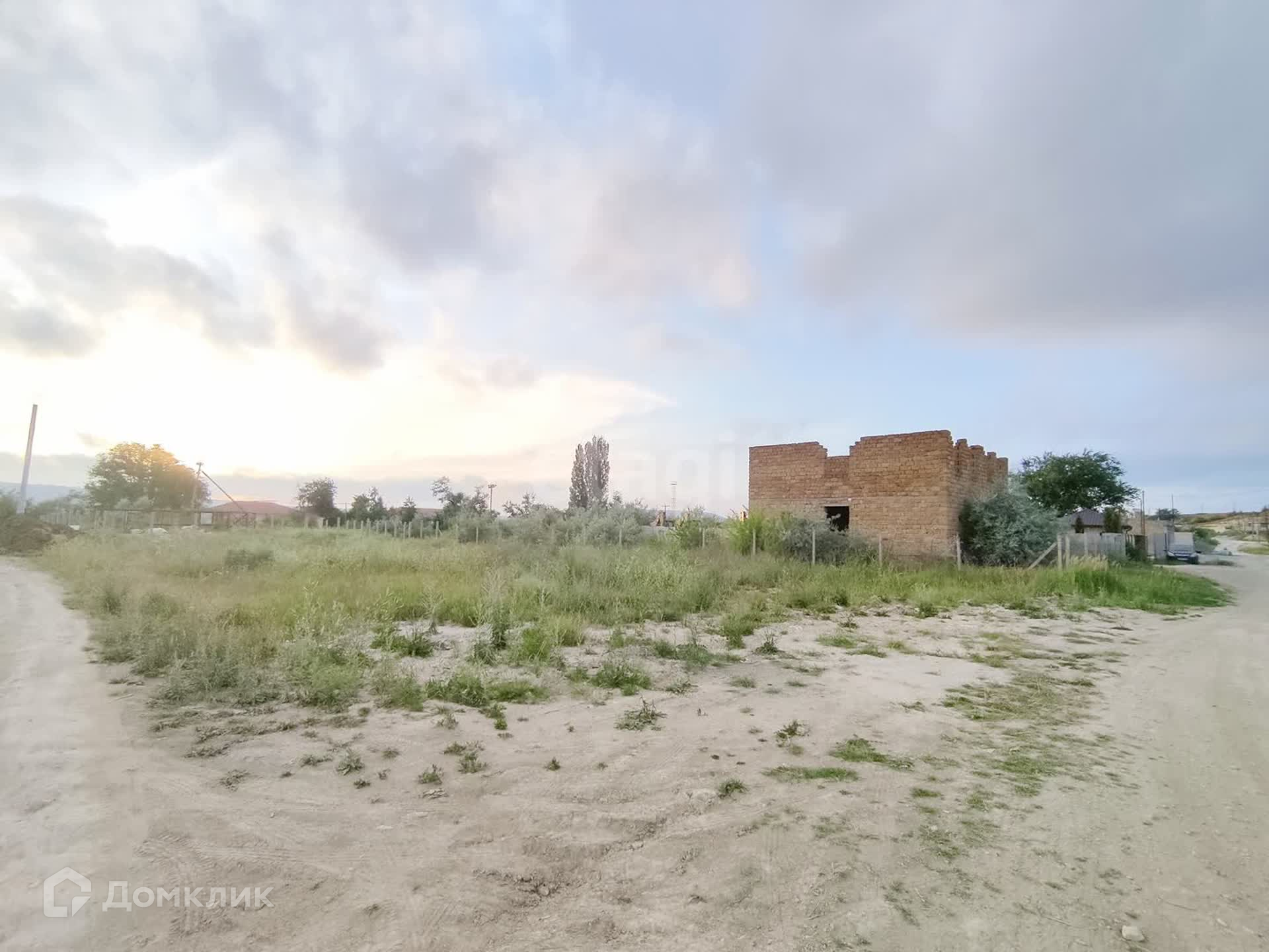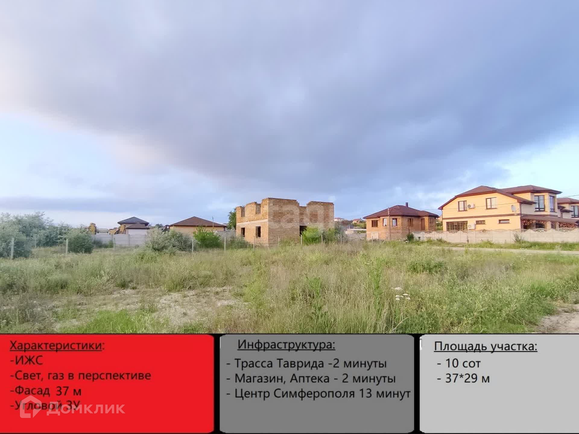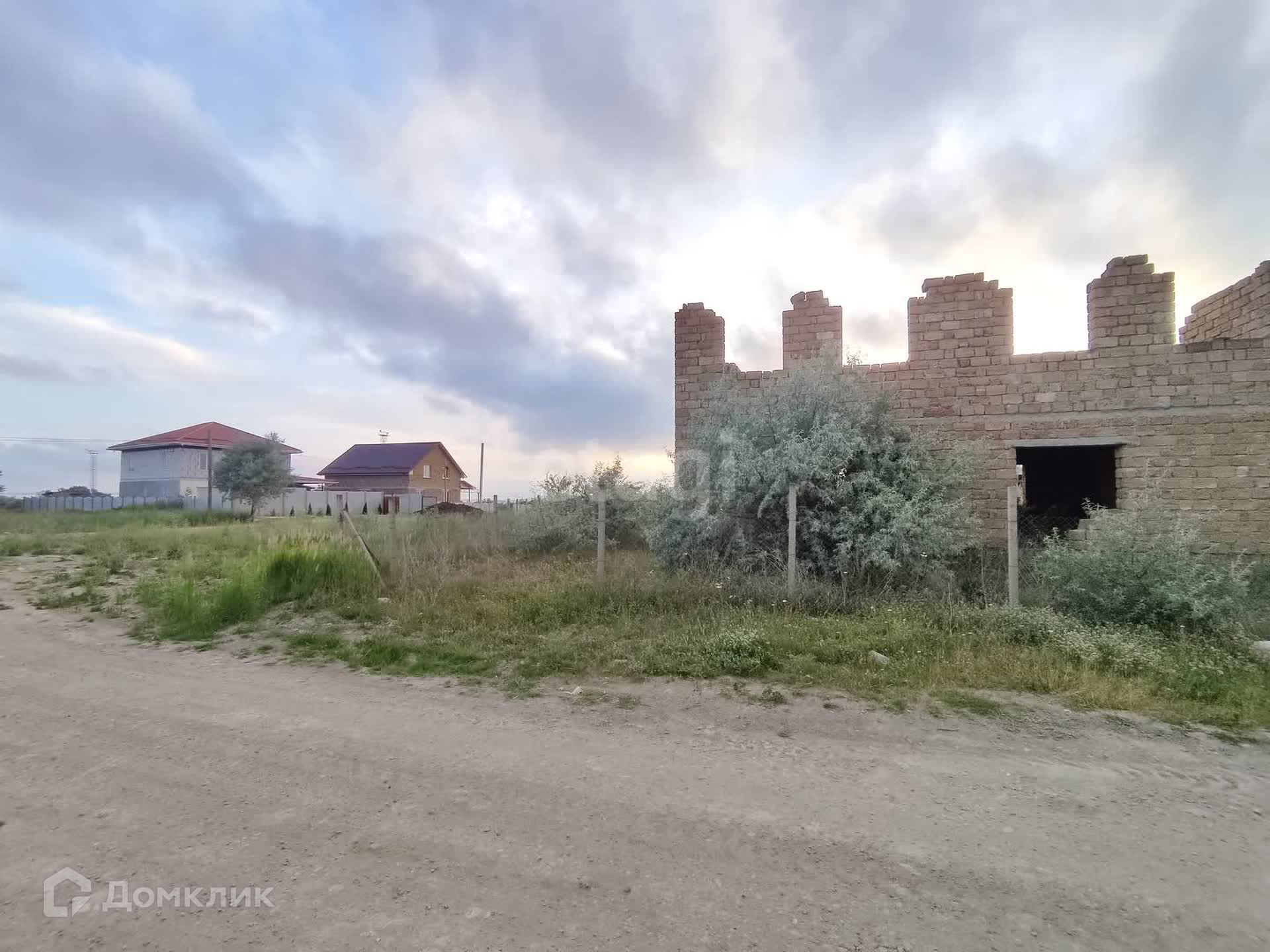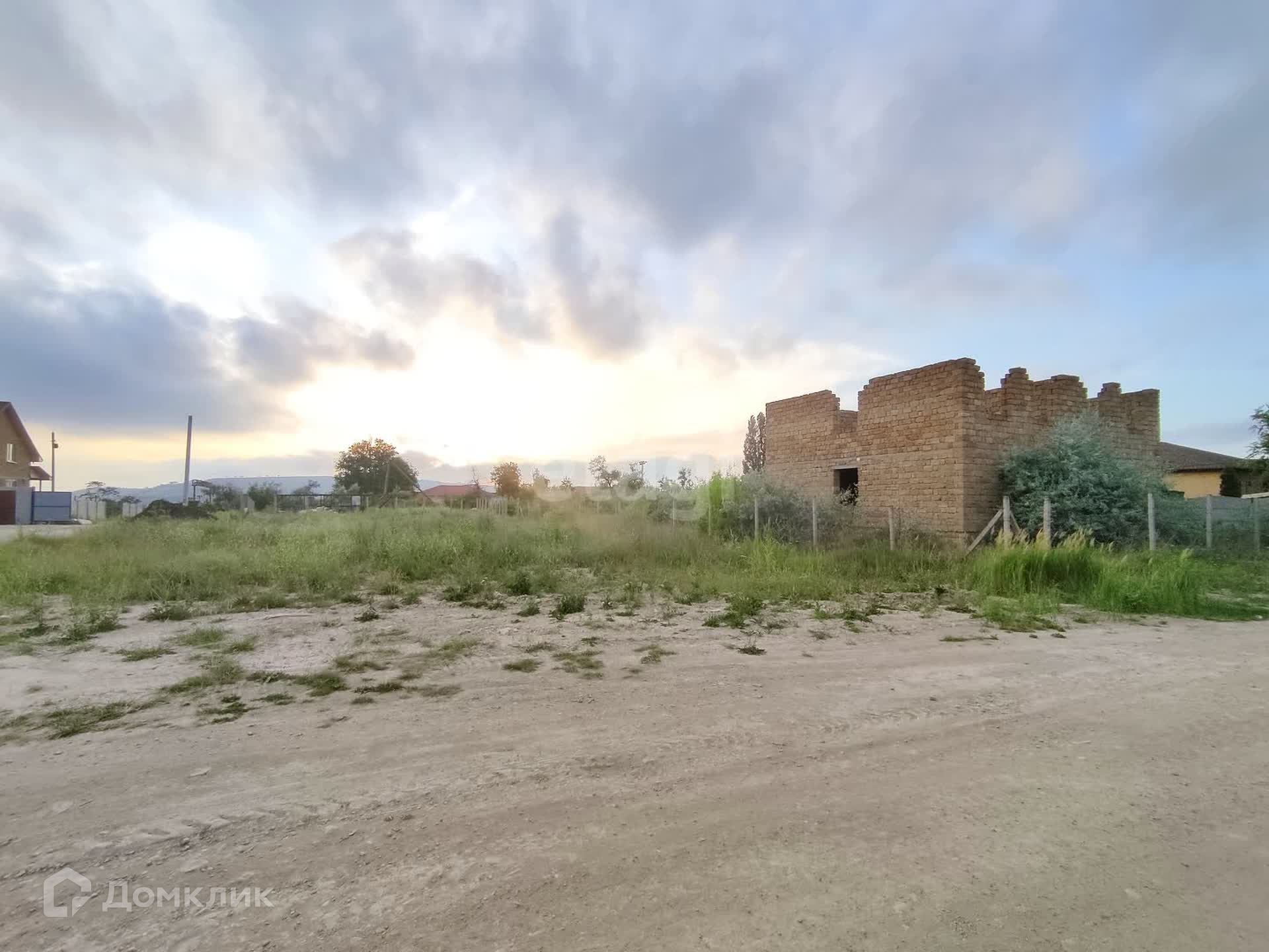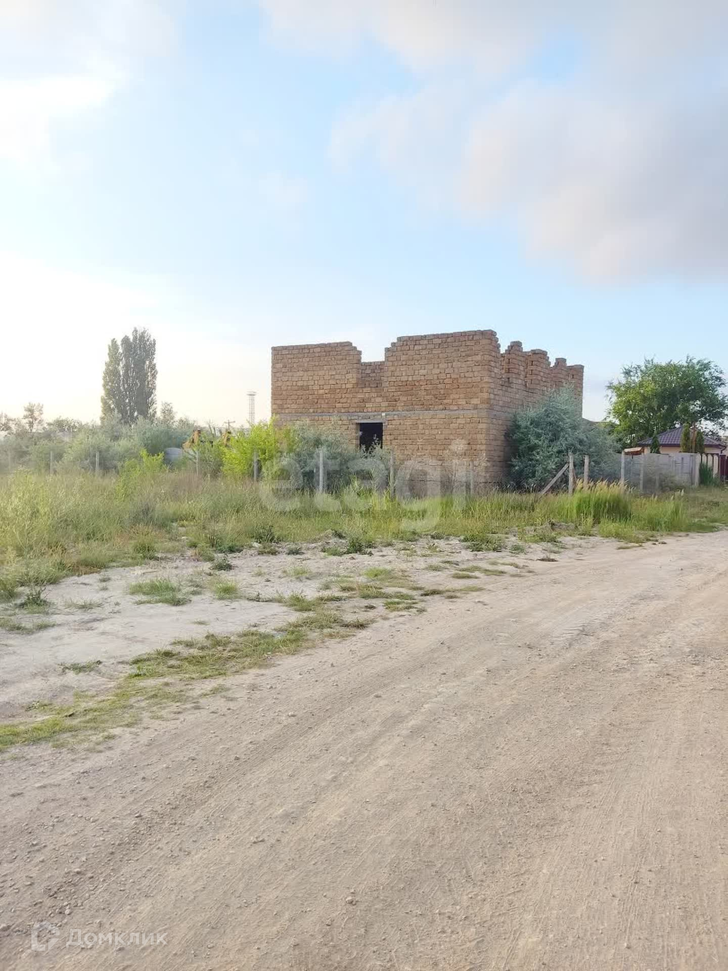 Участок ровный, правильной формы, на участке массивный недостроенный дом из ракушки в камень 12*10. Есть возможность постройки второго дома для двух семей, площадь позволяет.