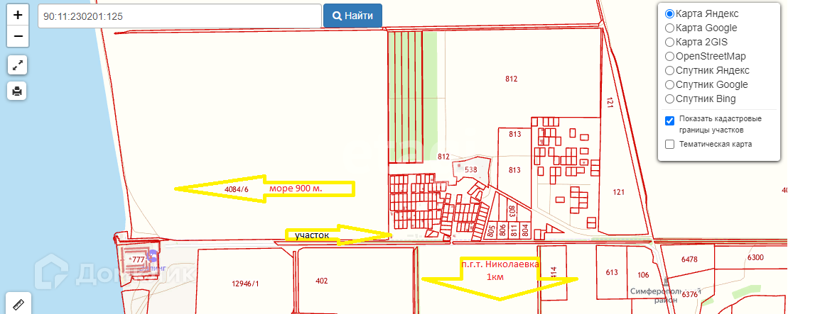 До моря 900 м. Возле моря база лодочных катеров, с жилыми надстройками, где люди проживают круглый год. На территории базы находятся магазины. Участок ровный. Свет, вода, канализационная яма на участке. Прекрасные подъездные пути. Дорога в достаточно хорошем состоянии, как со стороны п.г.т. Николаевка, так и со стороны трассы Севастополь-Симферополь.