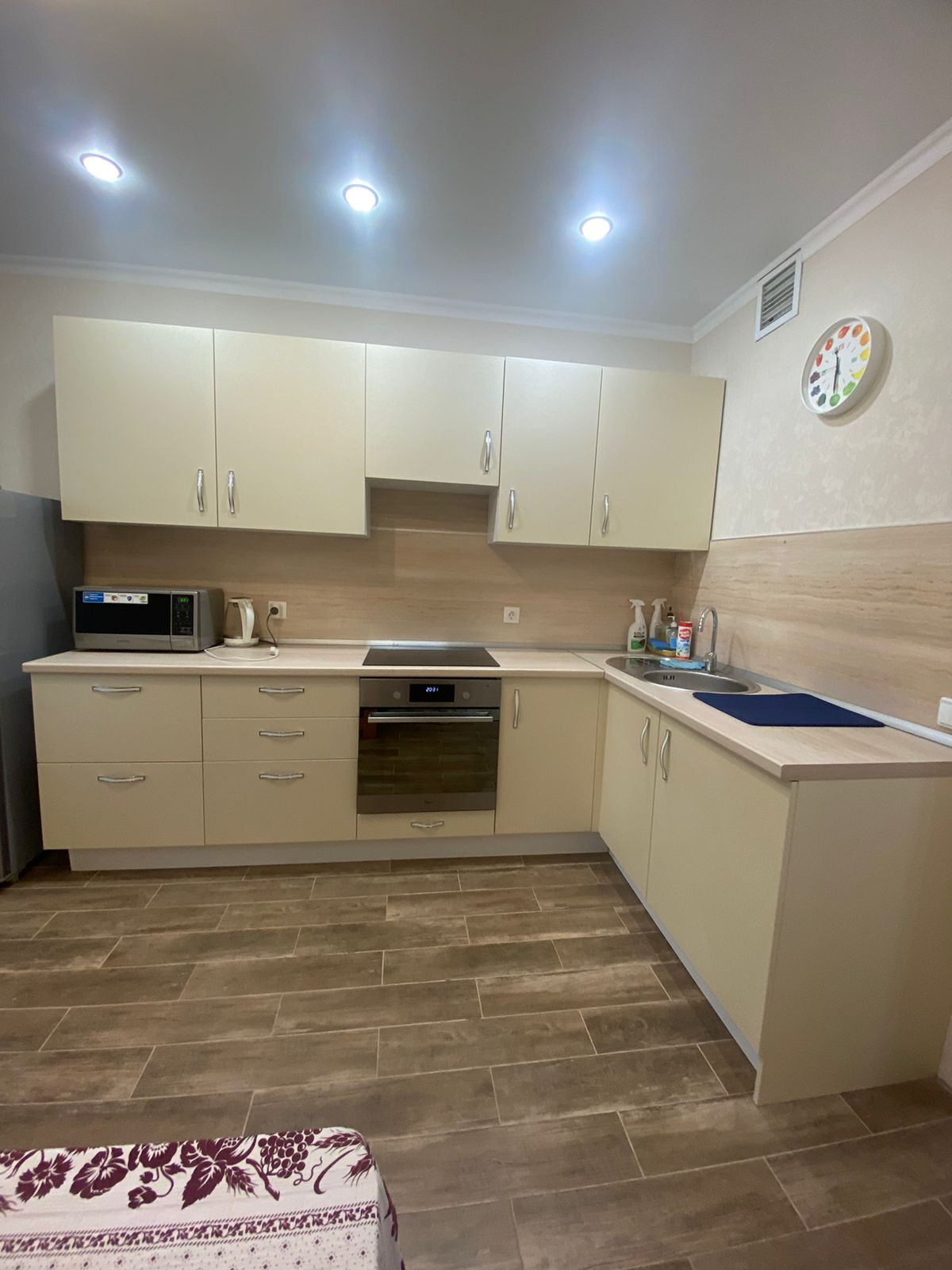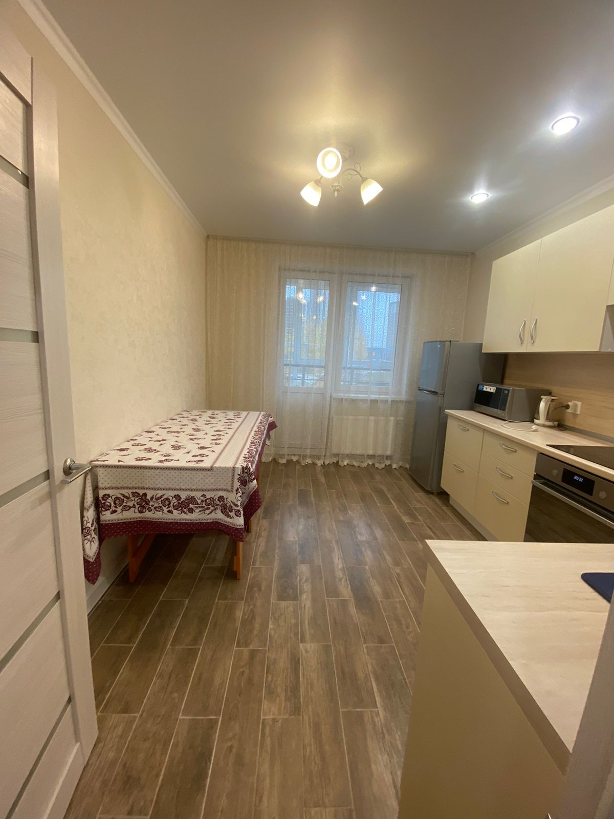 Полностью оборудованная кухня: холодильник, плита с 4 конфорками, духовка, микроволновка, телевизор, небольшой набор посуды.