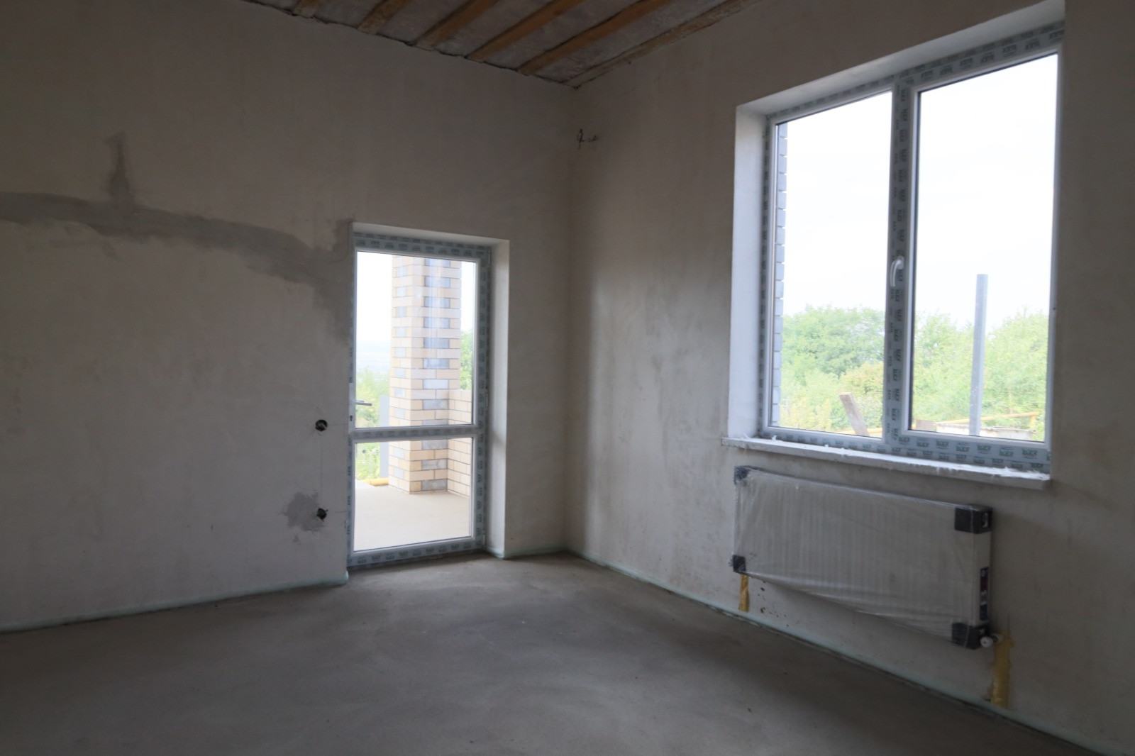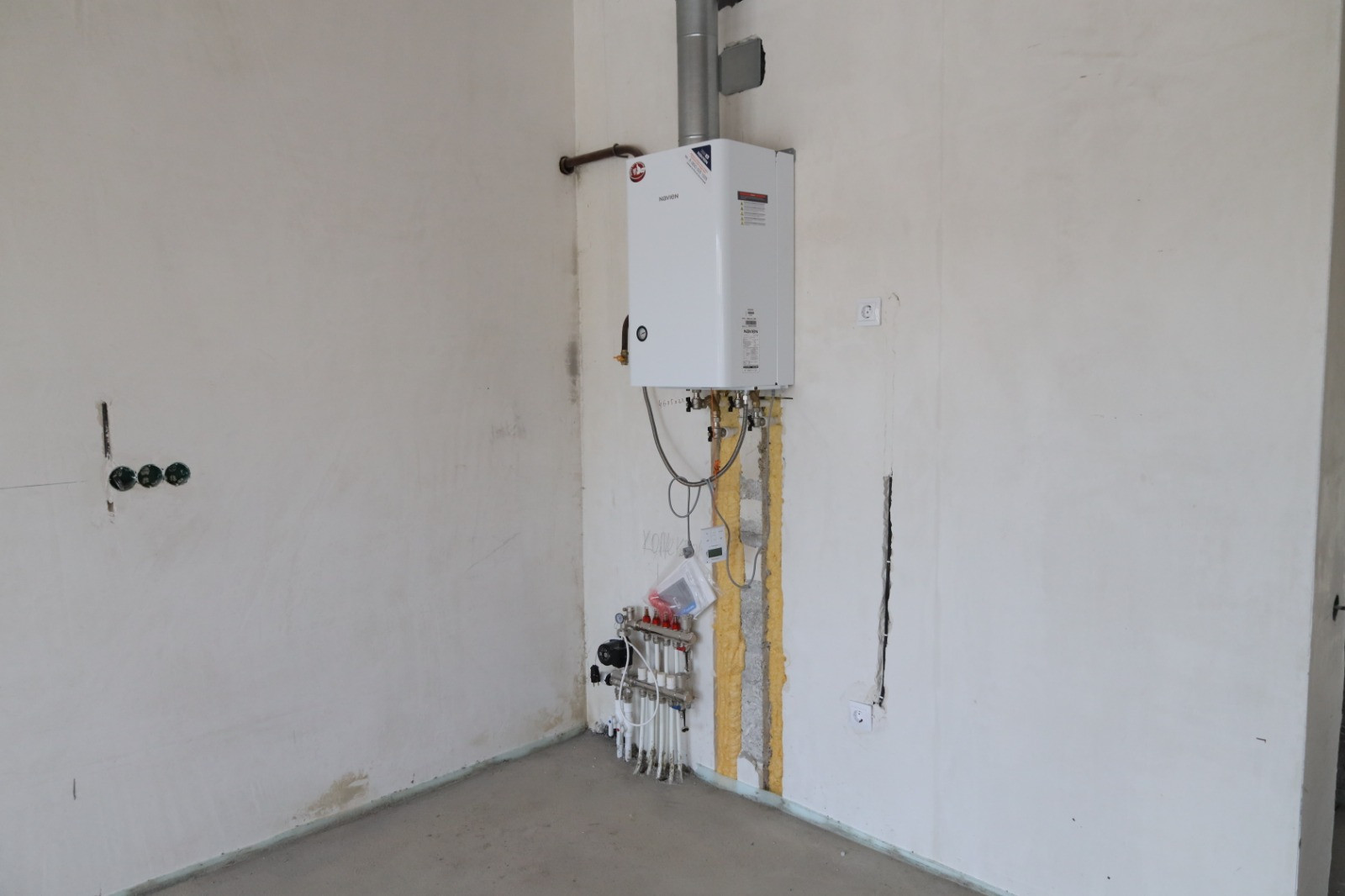 В доме выполнены стяжка пола, оштукатуривание стен, электроразводка, тёплый пол, газовый котел, разводка отопления, радиаторы.