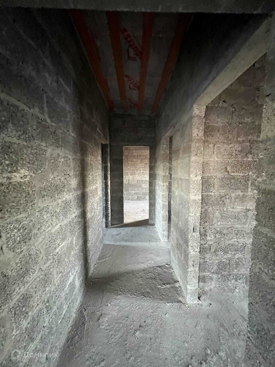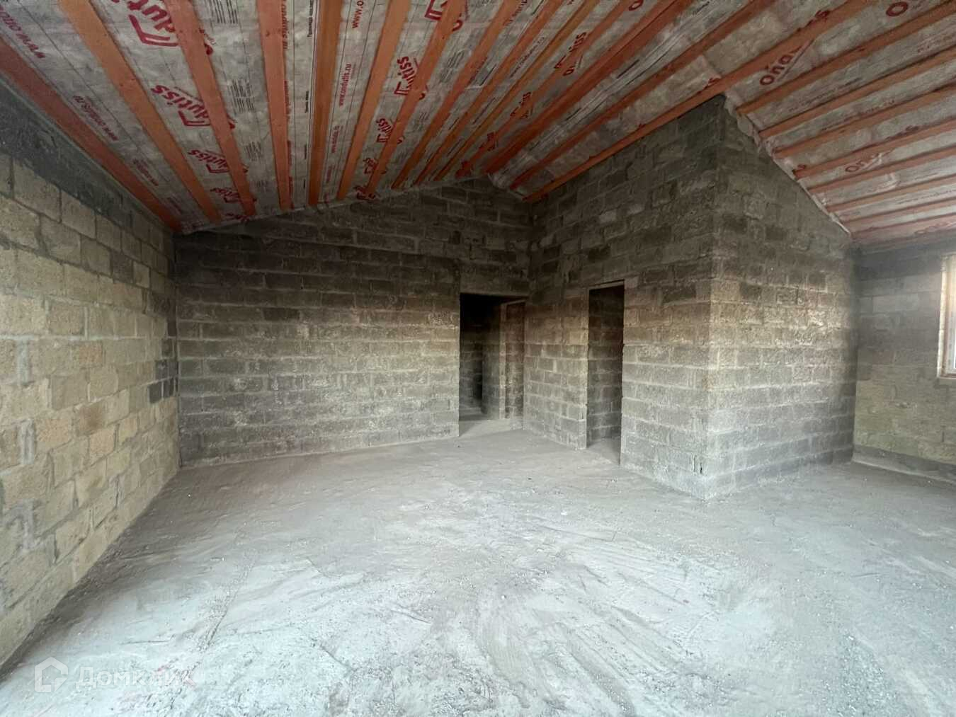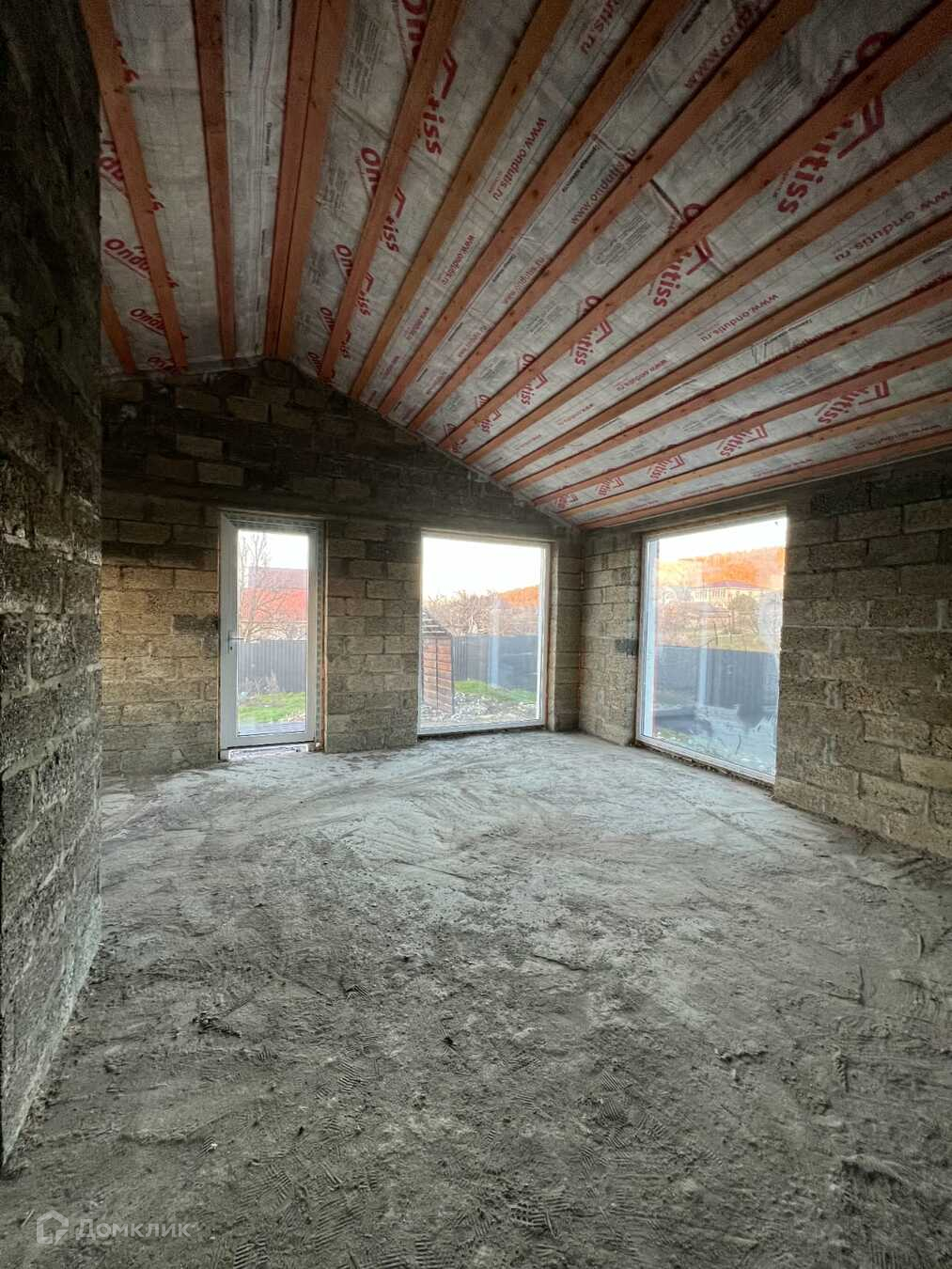 В черновой отделке. В доме большая кухня - гостинная, две комнаты и два санузла.