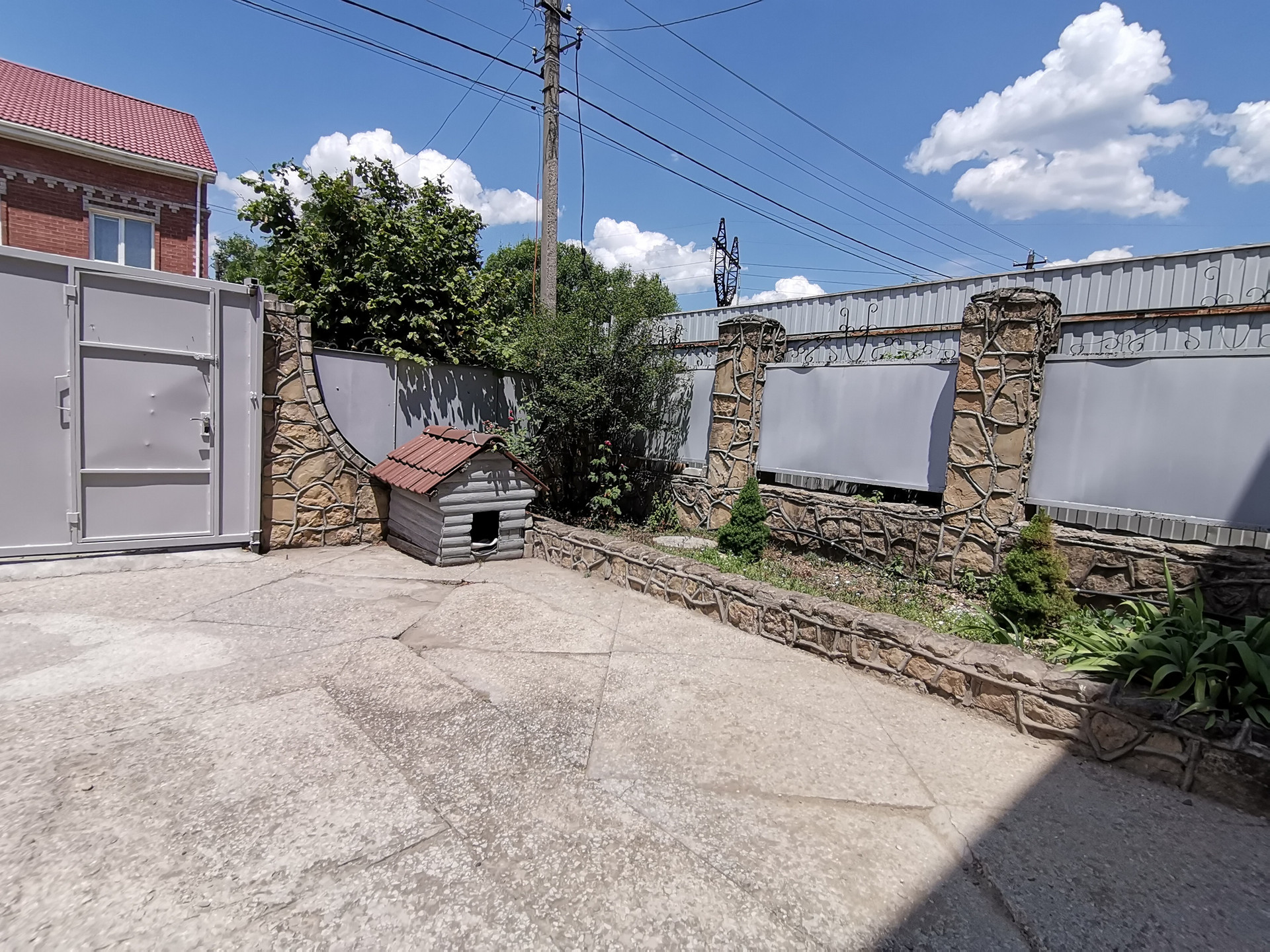 По всему участку капитальный забор с откатными воротами. Передняя часть залита бетоном для удобного заезда и эксплуатации зоны отдыха. На заднем участке небольшой огород с плодовыми деревьями.