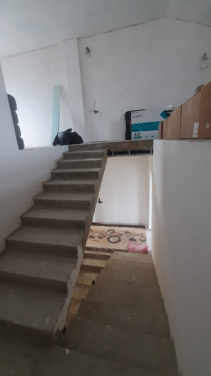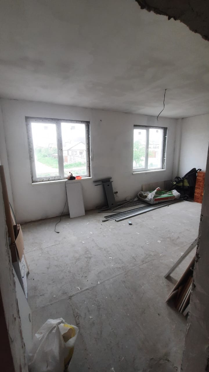 На втором и третьем этажах - выполнена стяжка, разводка электрики, стены пред чистовая отделка.