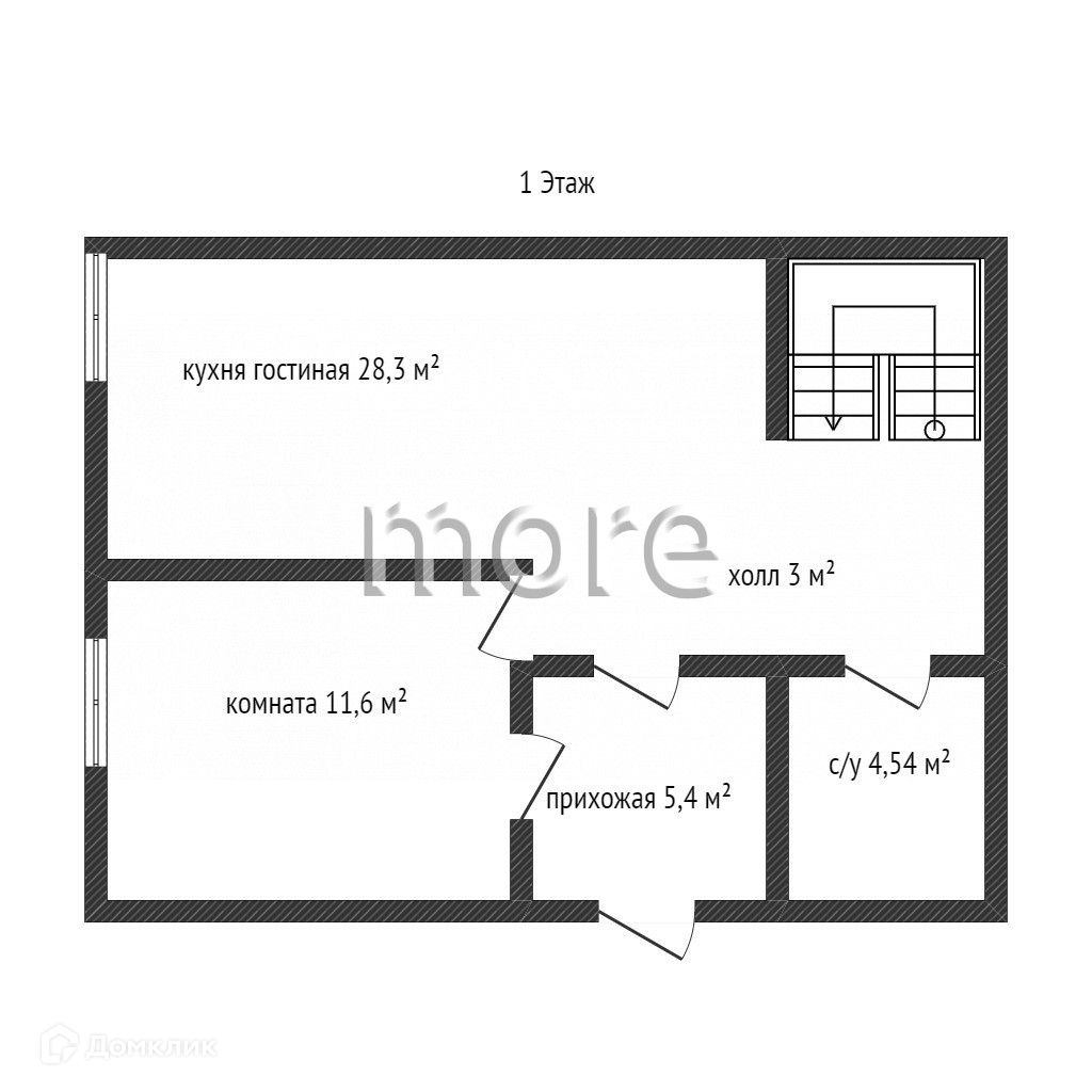 На первом этаже кухня 11,5 кв.м., комната 16 кв.м., санузел 4,5 кв.м, холл.