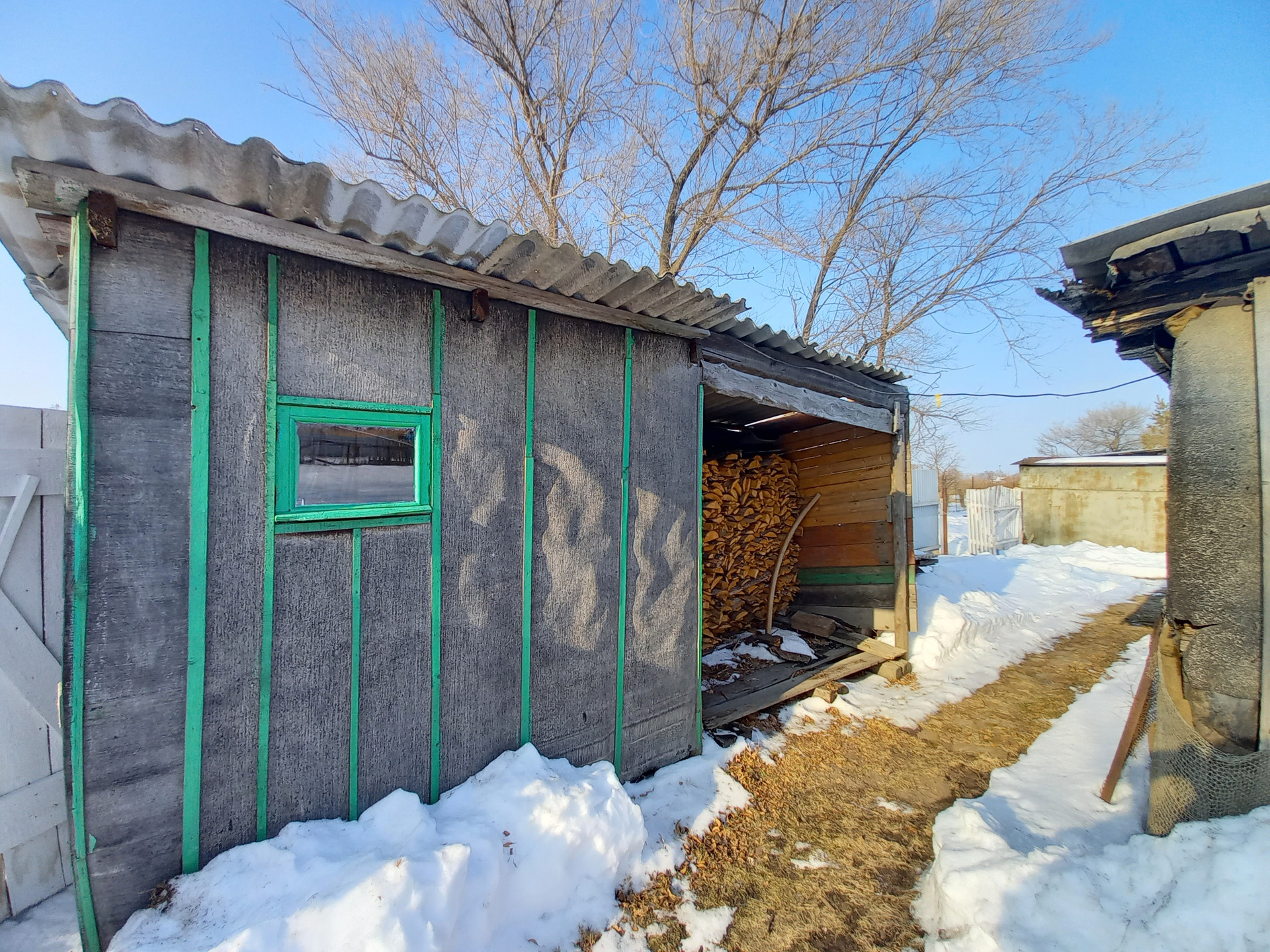На территории имеются хоз постройки, сарай, дровник, летний душ, гараж (везде проведено электричество). Так же на территории множество плодово-ягодных насаждений смородина, ежевика, клубника, малина, яблоня. Тихий, спокойный район, рядом с домом магазин, автобусная остановка.