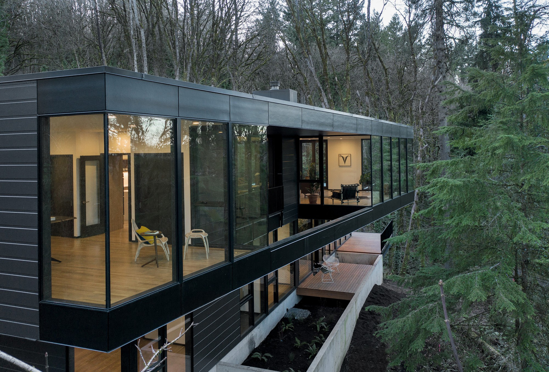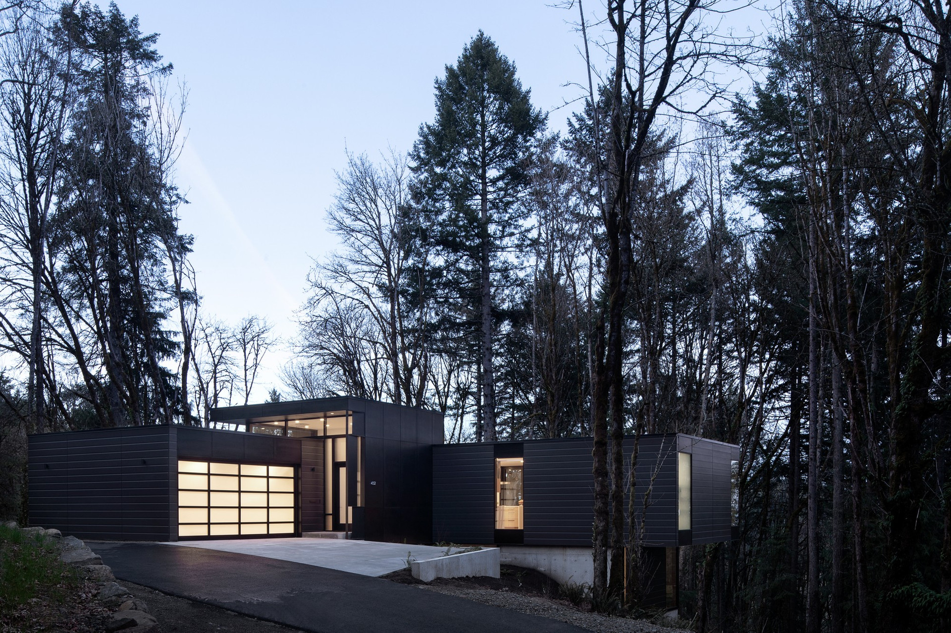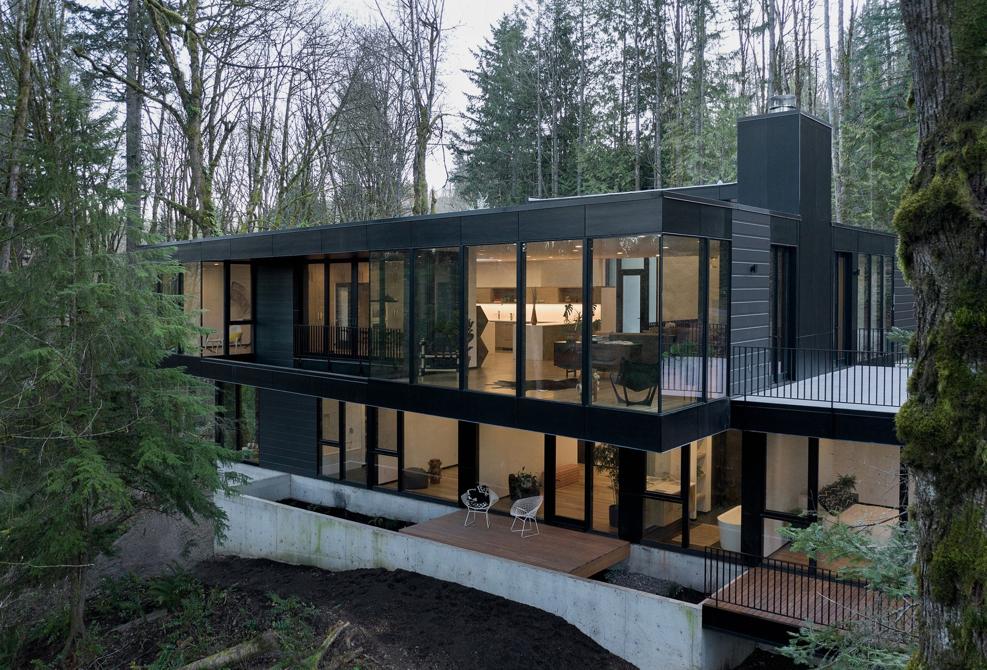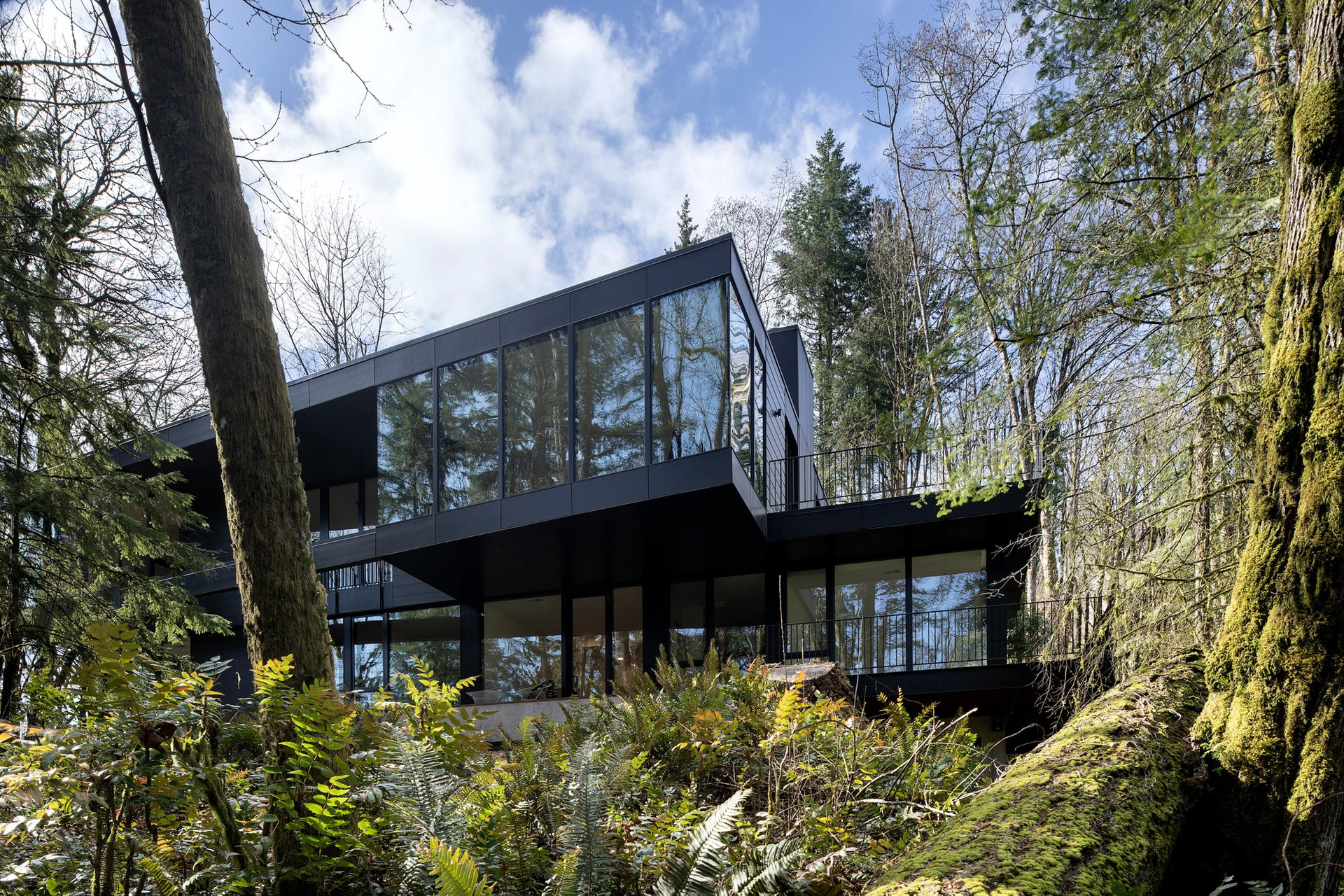 Черный матовый фасад и строгие геометрические формы позволили проекту буквально раствориться в природном ландшафте.