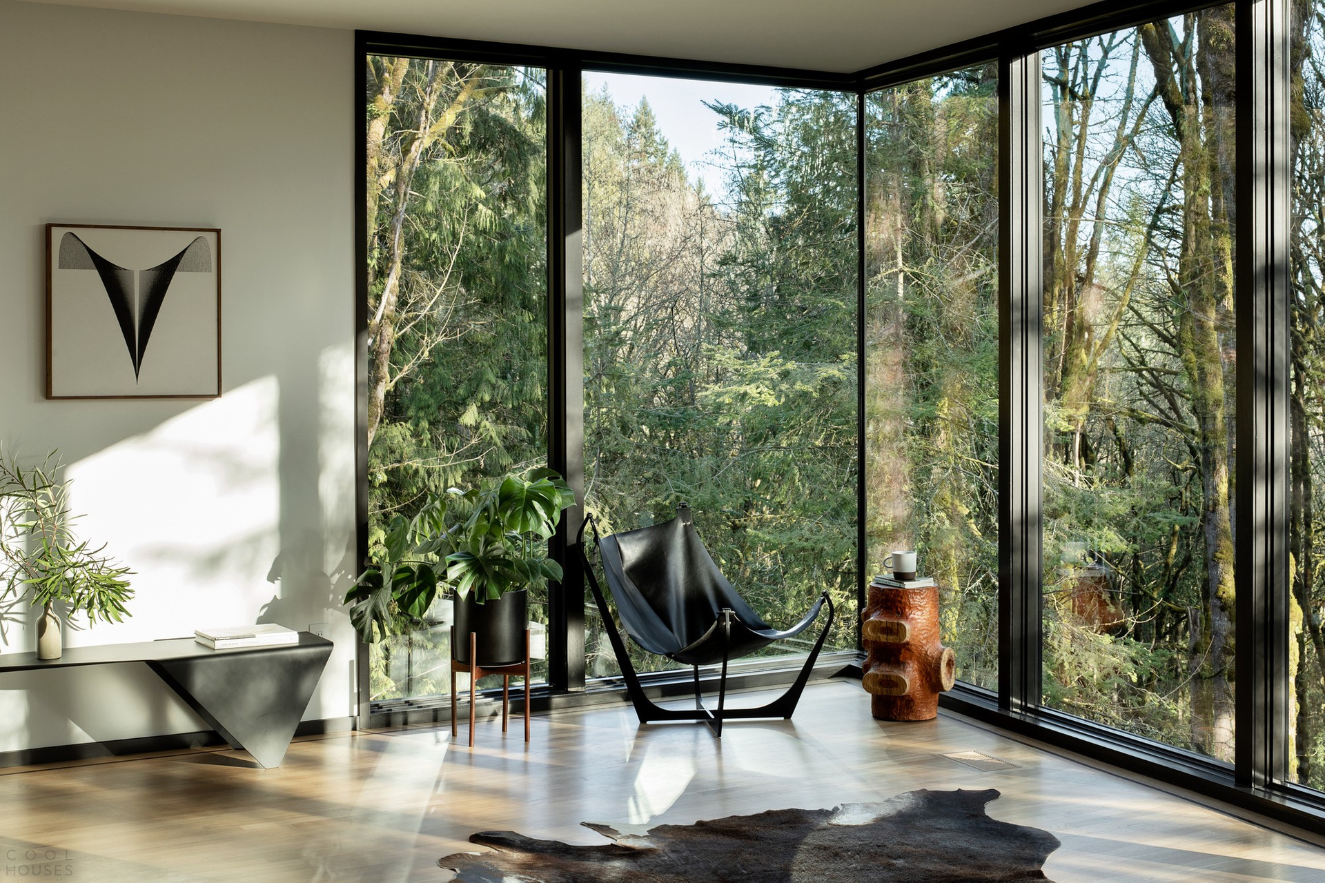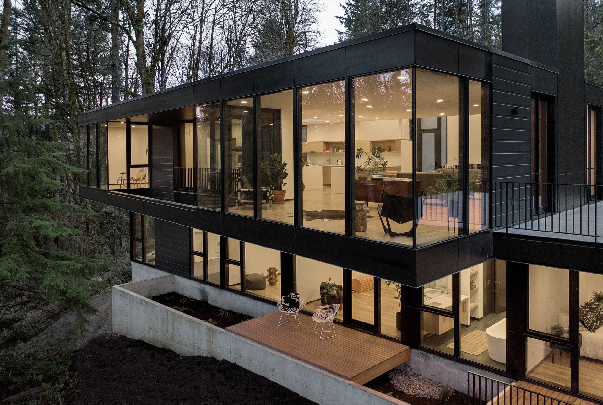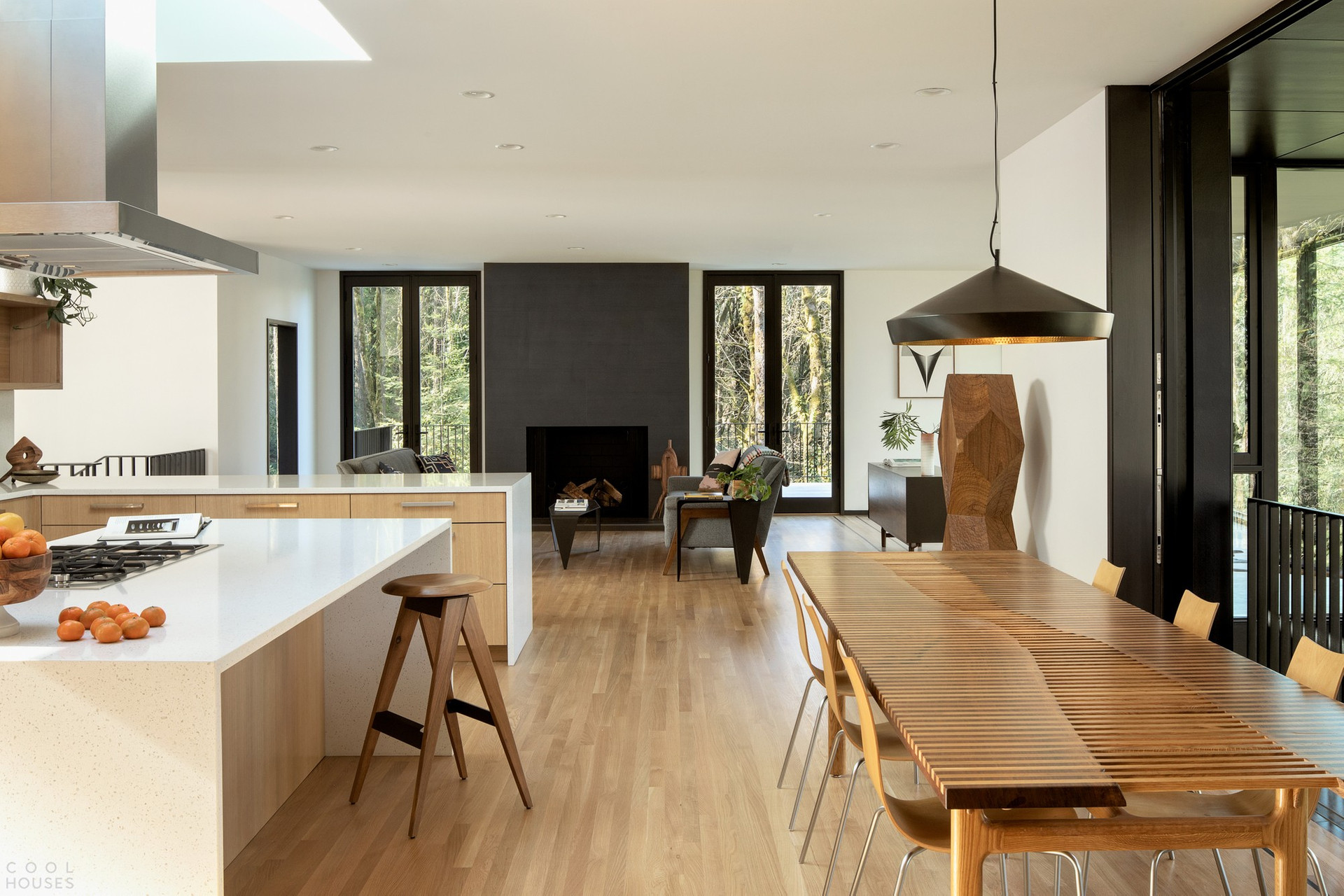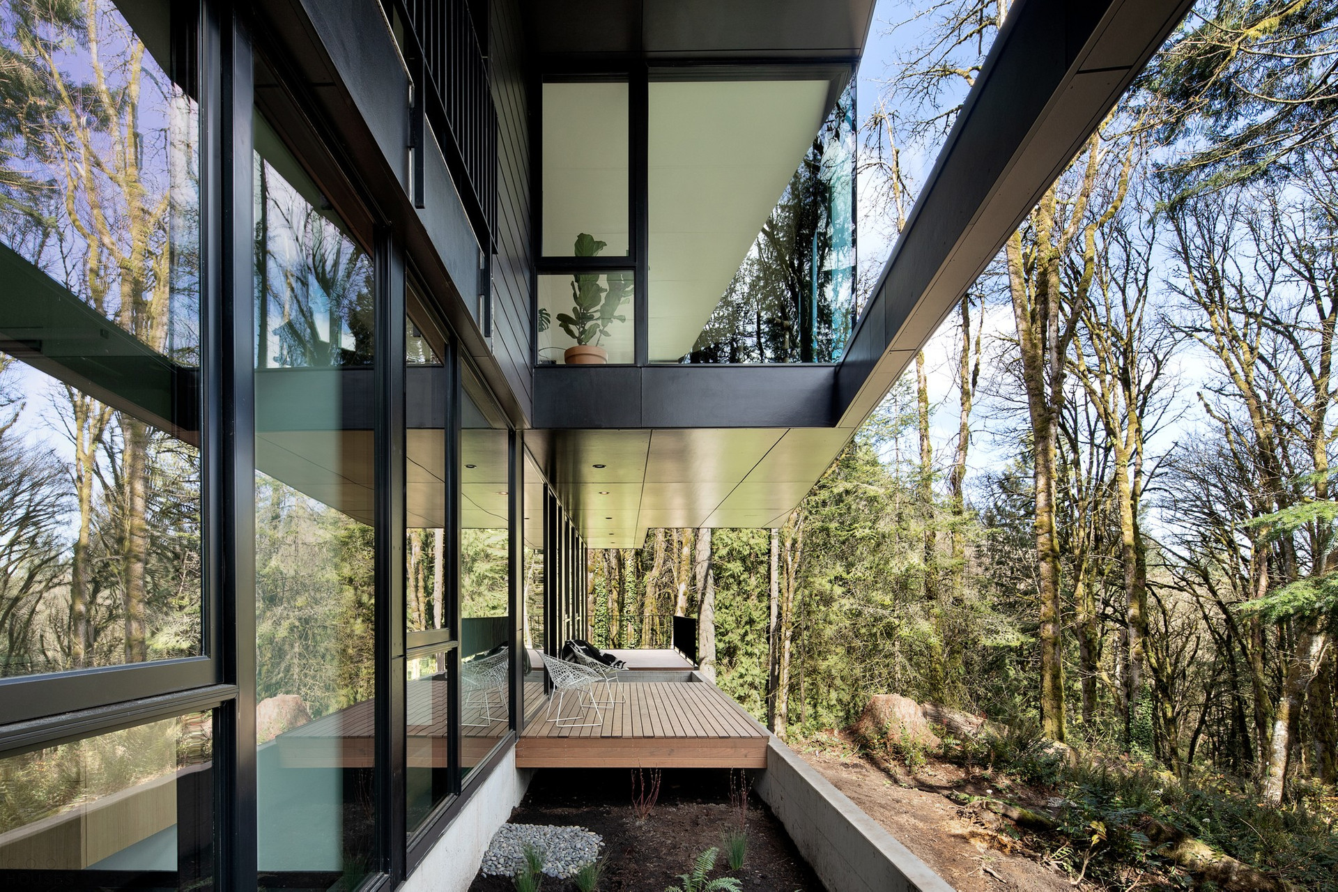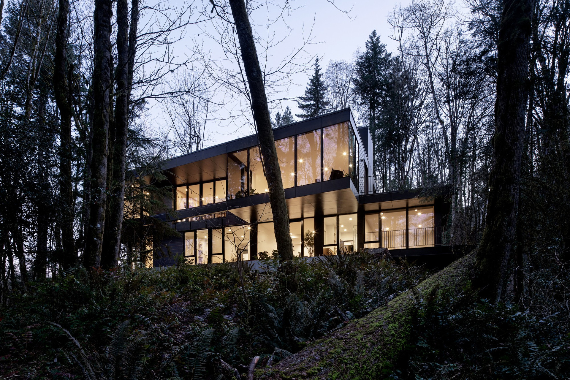 Черный матовый фасад и строгие геометрические формы позволили проекту буквально раствориться в природном ландшафте.