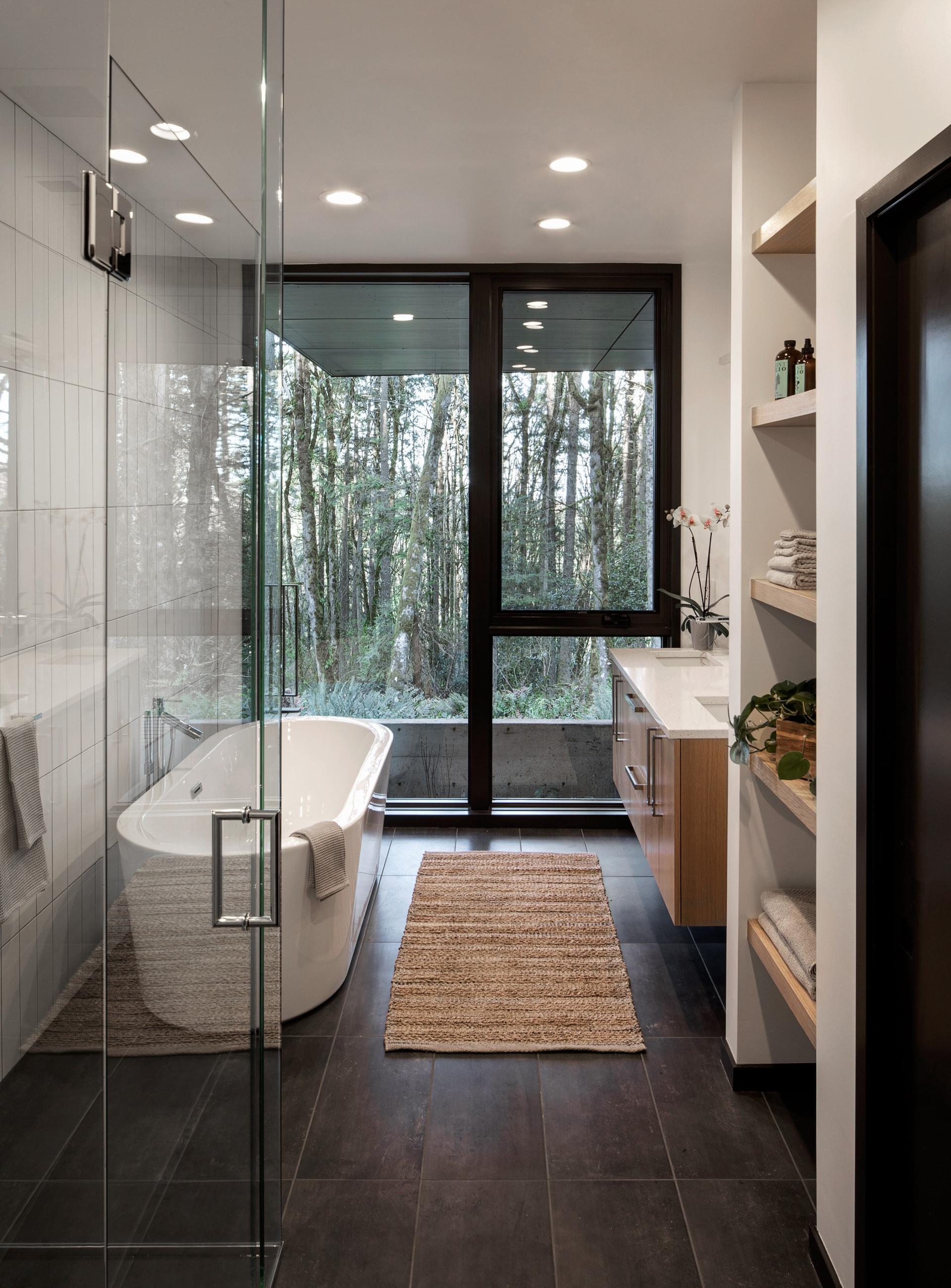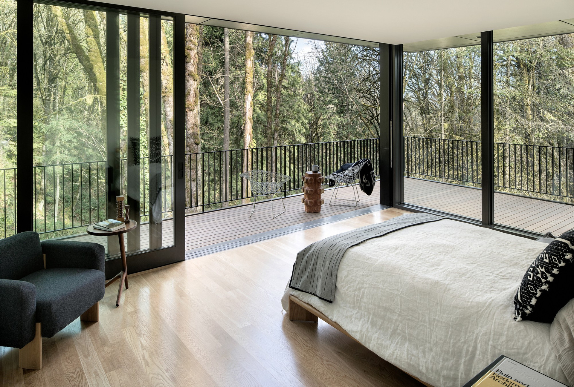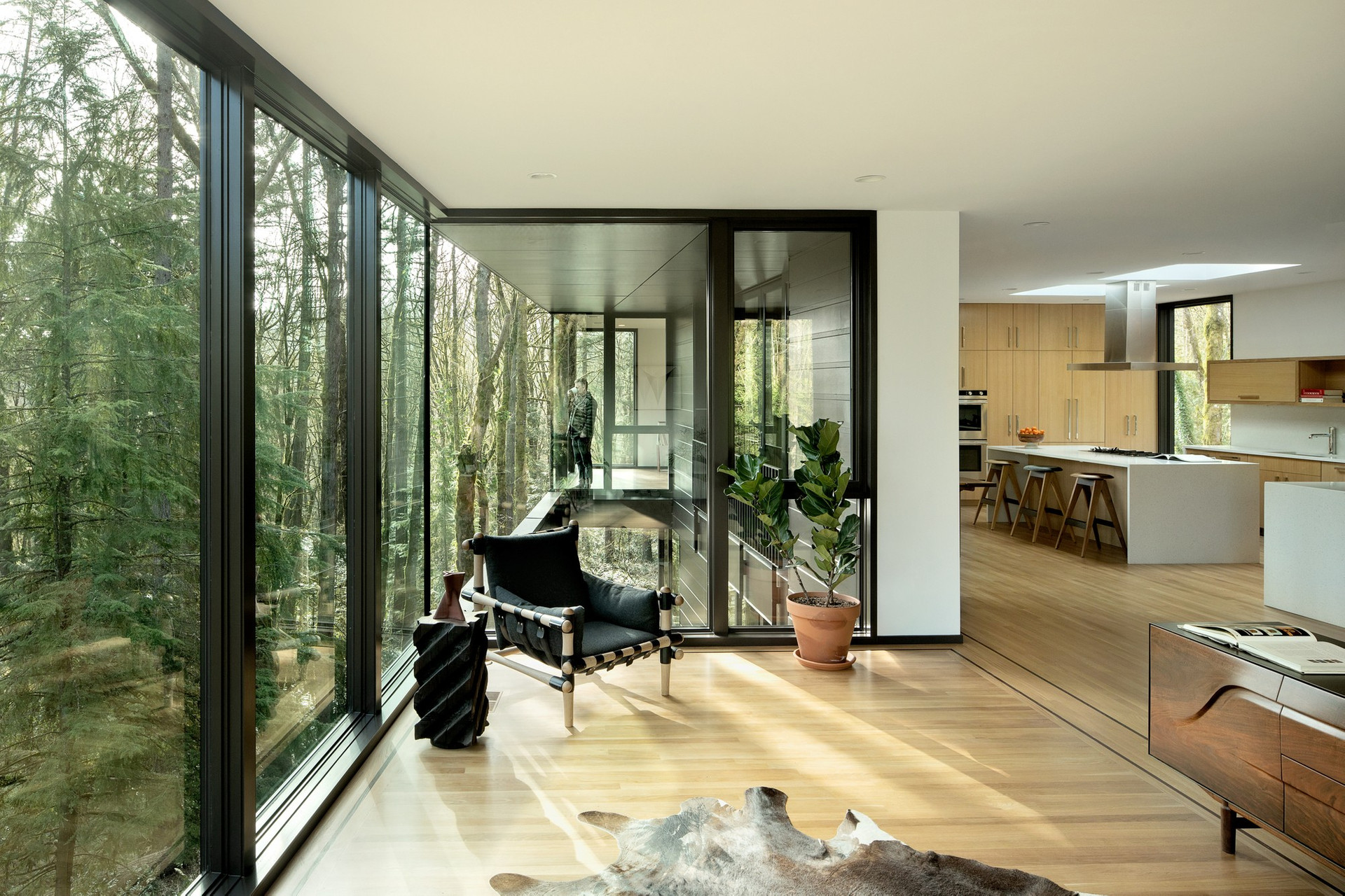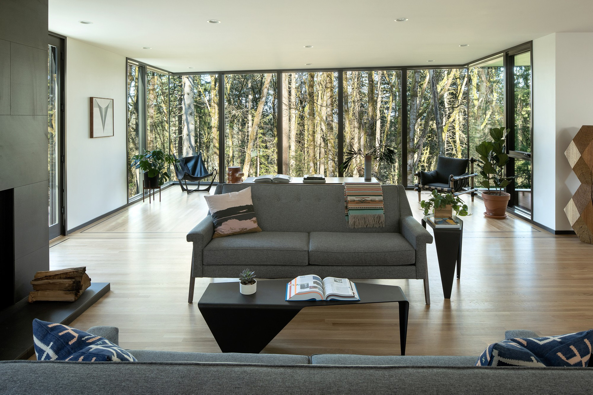 Черный матовый фасад и строгие геометрические формы позволили проекту буквально раствориться в природном ландшафте.