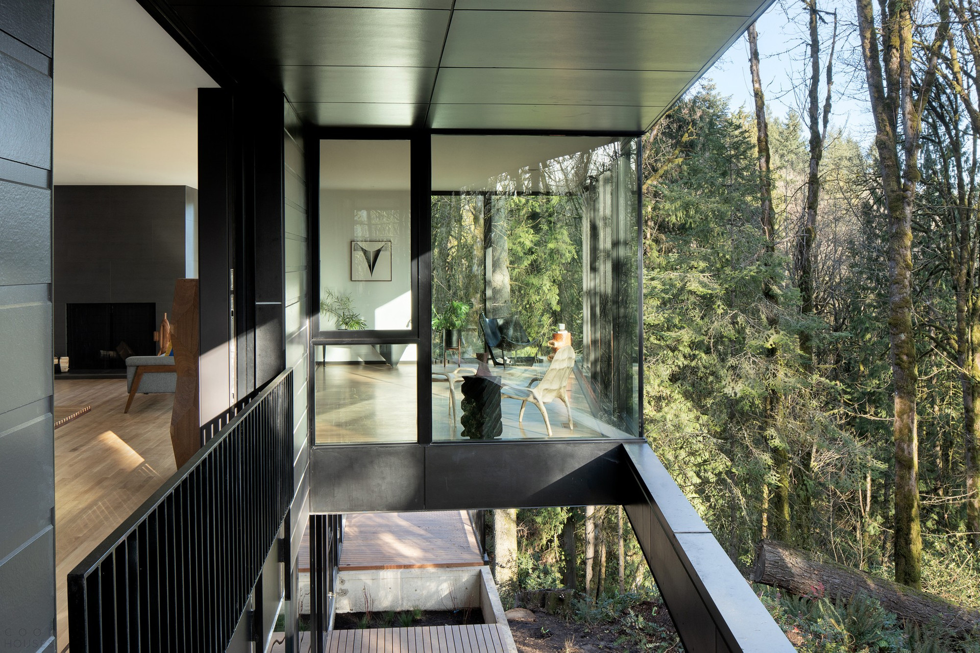 В результате интересных архитектурных решений был построен особняк, отличающийся минимальным вмешательством в окружающую среду и, при этом, тесно интегрированный в природу.