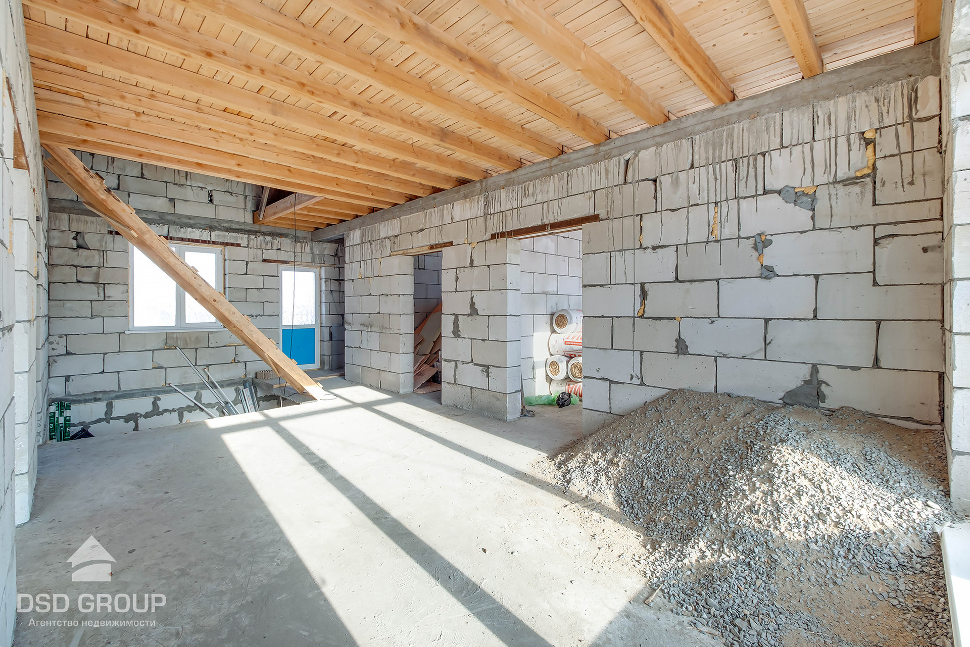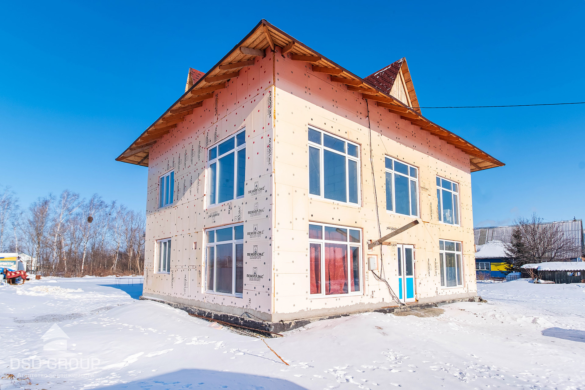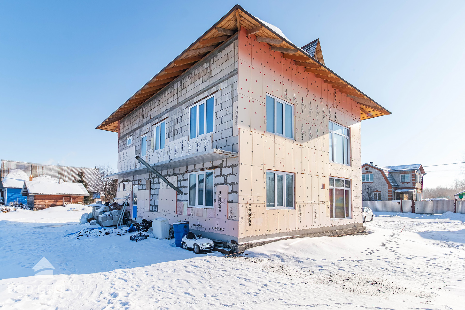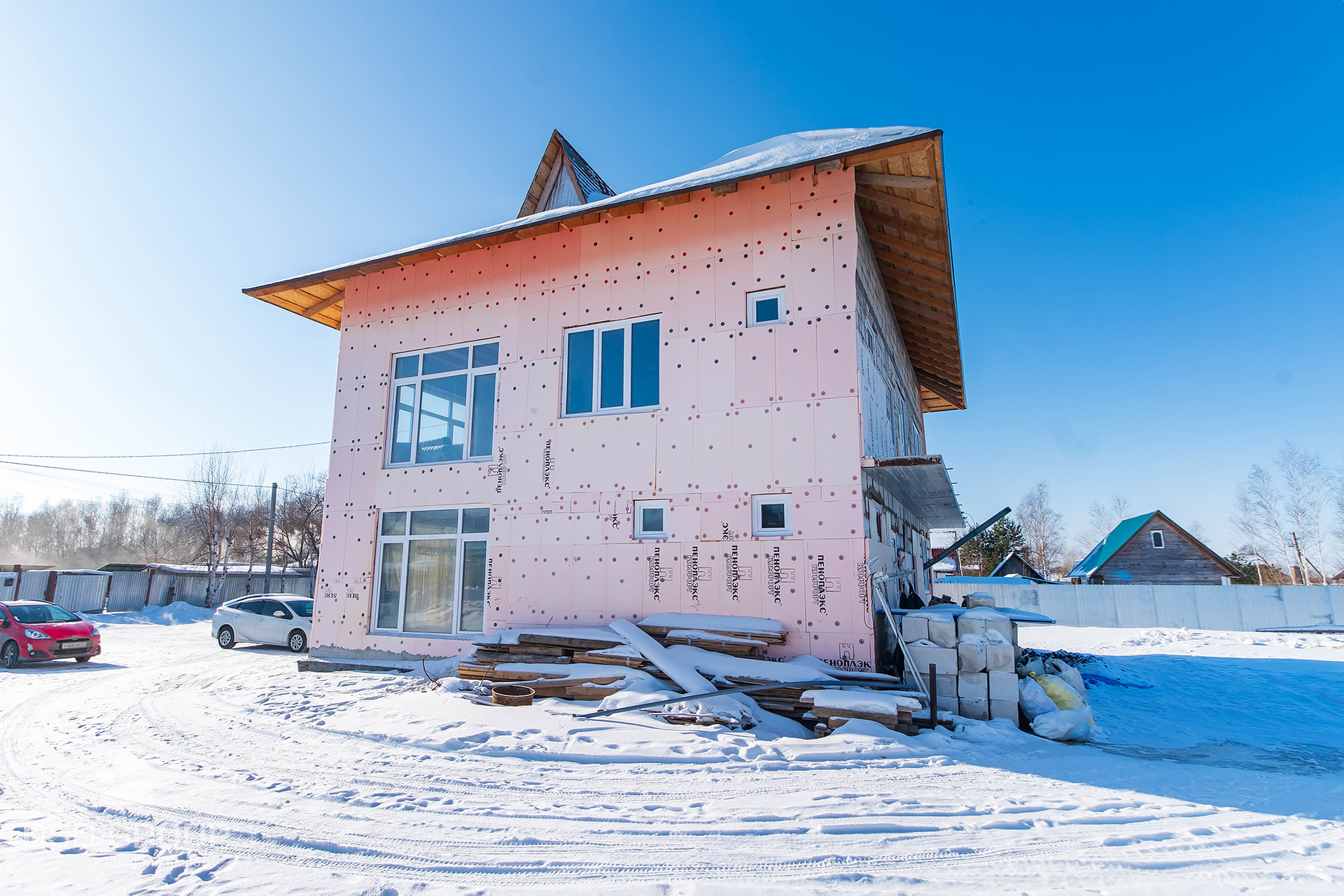 - Материал стен — газобетонные блоки (спец. заказ из Новосибирска); утепление 8см пеноплекс